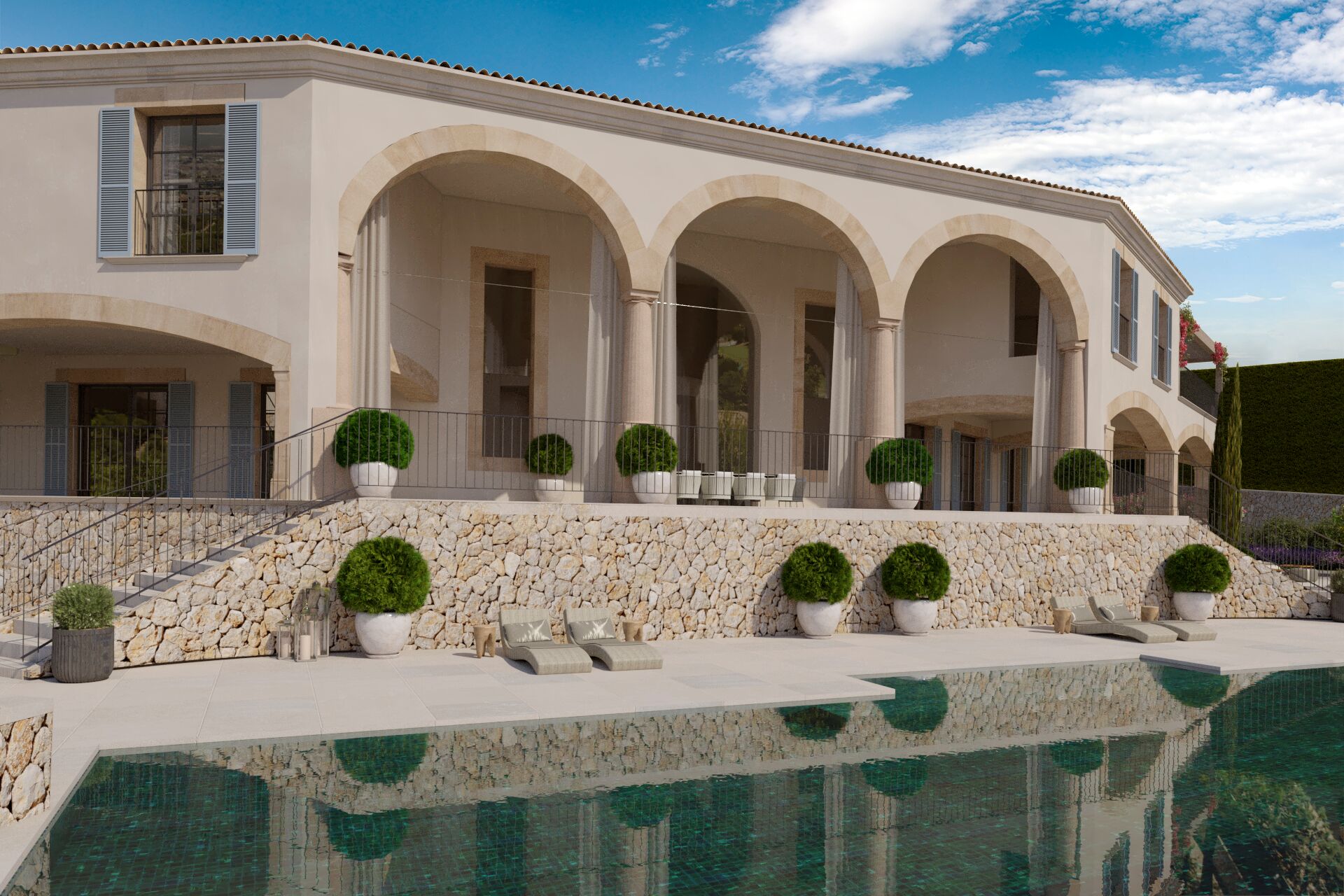 A private driveway leads to the spacious villa, which is situated on the almost 5,000 m2 big plot. The Villa Arcadia offers spectacular views, overlooking the bay of Palma and the city of Palma de Mallorca. The moment you arrive to Villa Arcadia, you instantly sense the majesty of this property brimming with character and its history, looking out over the vibrant city of Palma and its bay in the background. Its geographical location and the extensive plot provide plenty of space and privacy. The plot is one of the largest in the Son Vida urbanization. This project creates a perfect symbiosis of the classic Mallorcan Mansion-style and state-of-the-art technical equipment.