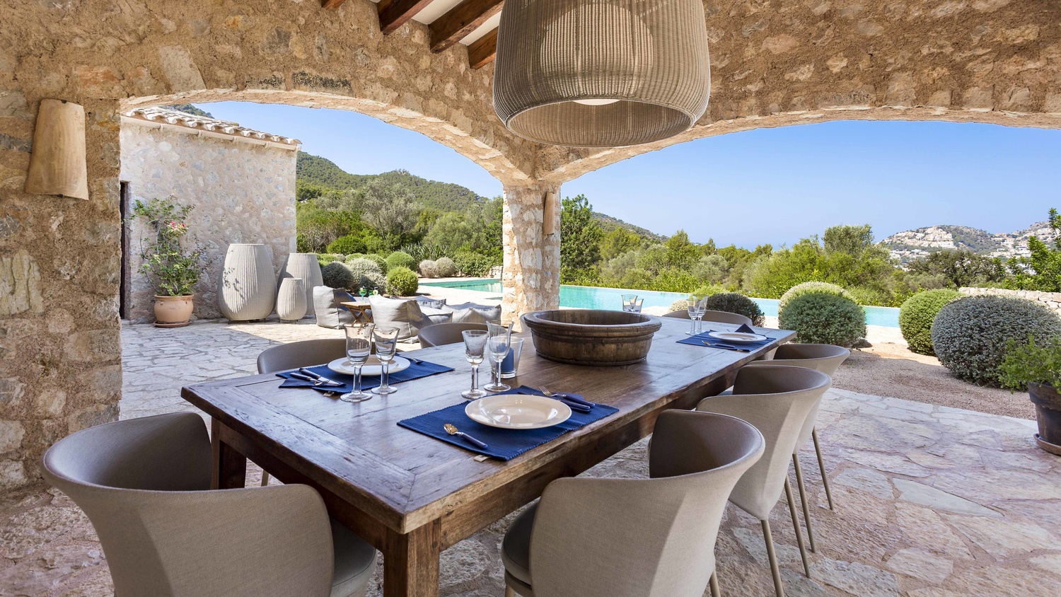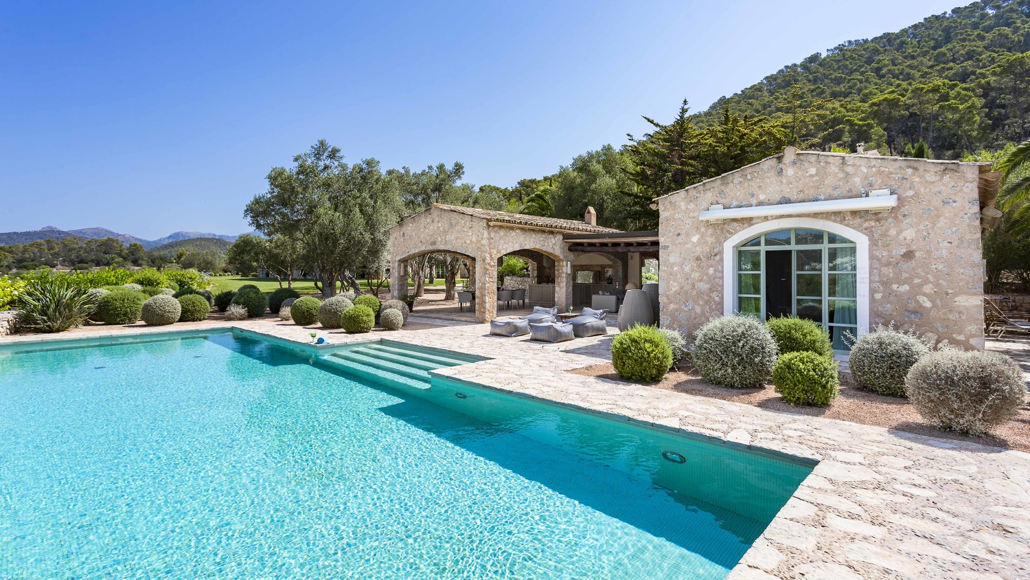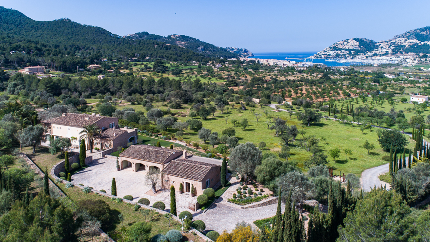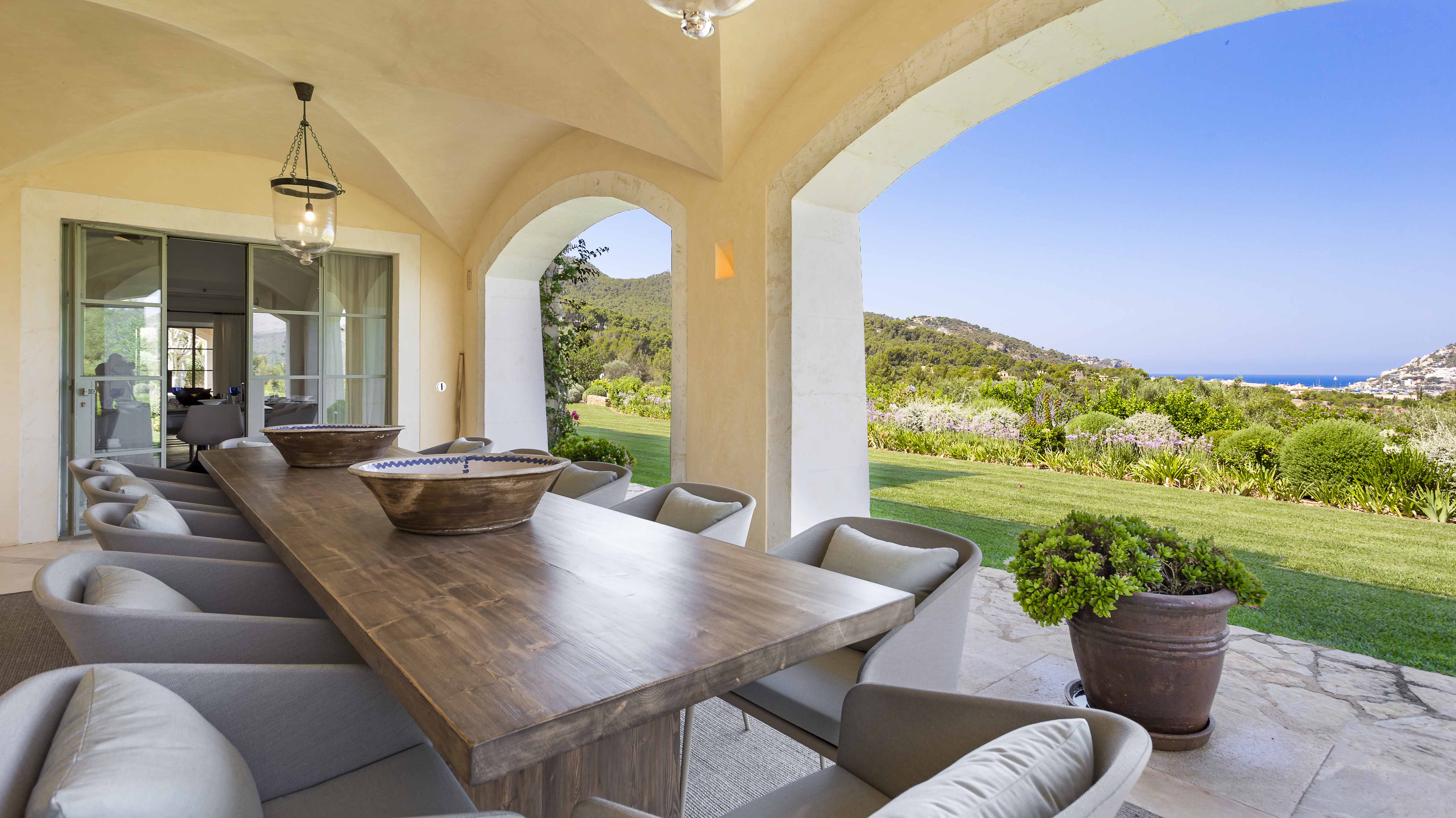 This exceptional finca is located on a nearly flat, slightly elevated plot just 15 minutes walk from Port de Andratx and offers a fantastic view of the bay of Port de Andratx. Three separate buildings, several exterior terraces and a large pool 75 m2 are part of this mansion - and all rooms and terraces are facing the sea and offer views of the chain of hills of Andratx. The modern finca with typical Mallorcan elements is well-maintained and equipped with many small details. It was built for personal use, hence the extremely high quality in construction. The central main villa impresses with 384 m2 area of well-being, distributed over two floors. n the first floor you find the master suite with bathroom and dressing room and a large covered terrace (52 m2), from which you can enjoy panoramic views of the port of Andratx. The second bedroom has an en-suite bathroom and a private roof terrace (28 m2). A third room is currently being used as an office- and TV-room, but, could easily be converted into another bedroom. On the ground floor there are the large bright living area with an open fireplace, the luxurious, fully equipped kitchen with adjoining utility room with separate second kitchen, the dining area with direct access to the outdoor terrace, a TV or office room (could also be converted into a bedroom) and the porch (83 m2). From every living area you have access to the Mediterranean garden with its cypress, palm, olive and lemon trees. It was planned by the well-known horticultural company Son Muda, who are maintaining it too. At the side of the main villa you find a guest house with living room and bedroom, bathroom and a private covered terrace. The building also has three separate garages and a technical room (heating). The pool house with a heated outdoor pool (heat pump) was converted into a second guest house in 2013 with living room and bedroom with bathroom en-suite and an outdoor terrace. In the same group of buildings, you will find a fully equipped outdoor kitchen with electric grill, Japanese Tepanyaki grill, hotplates, refrigerator, freezer, dishwasher and several cupboards. Under the pool there are both the pool technology room and the diesel generator with a stand-by unit in case of a power failure. The whole property is completely fenced by a high mesh wire fence. Wonderful walks on your own grounds are awaiting you!