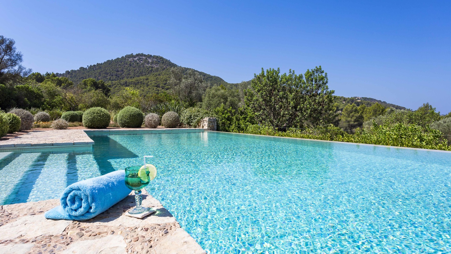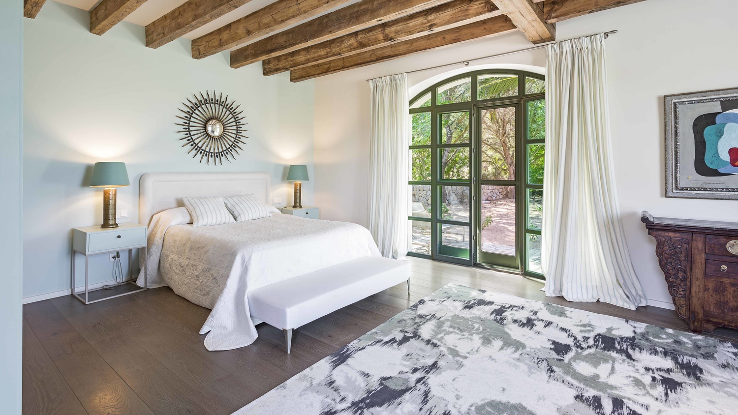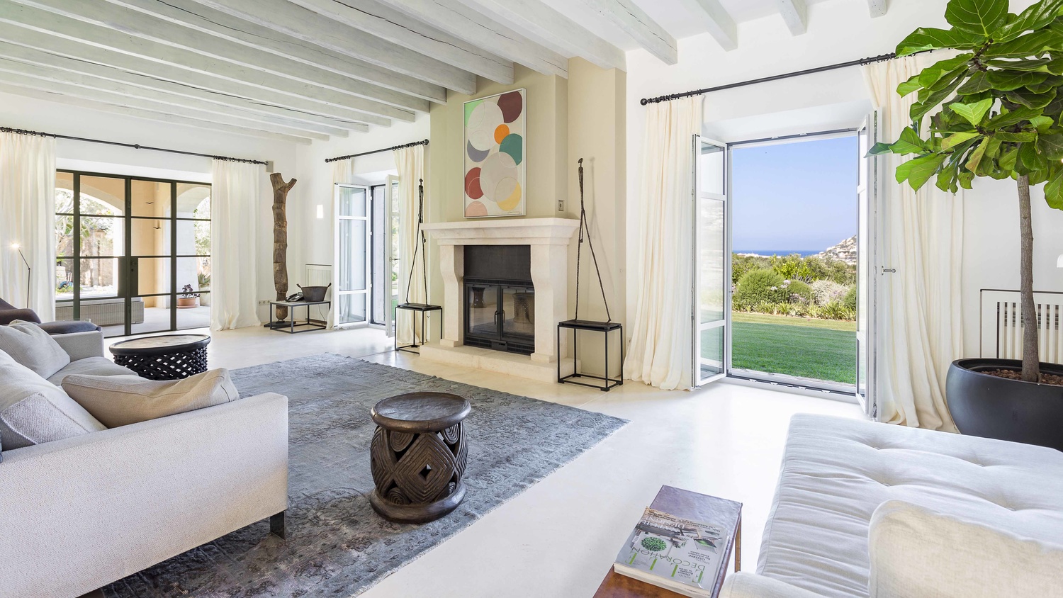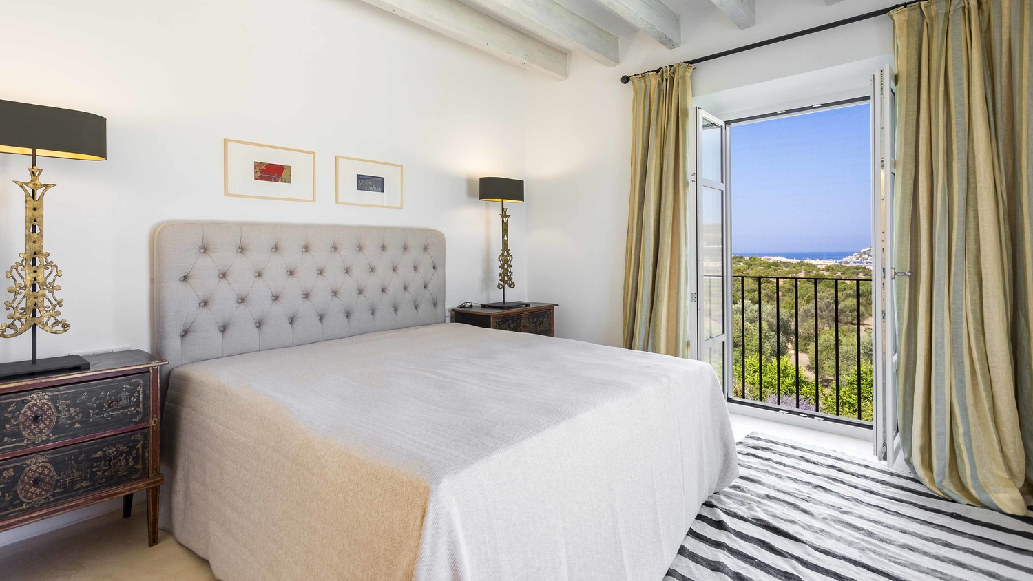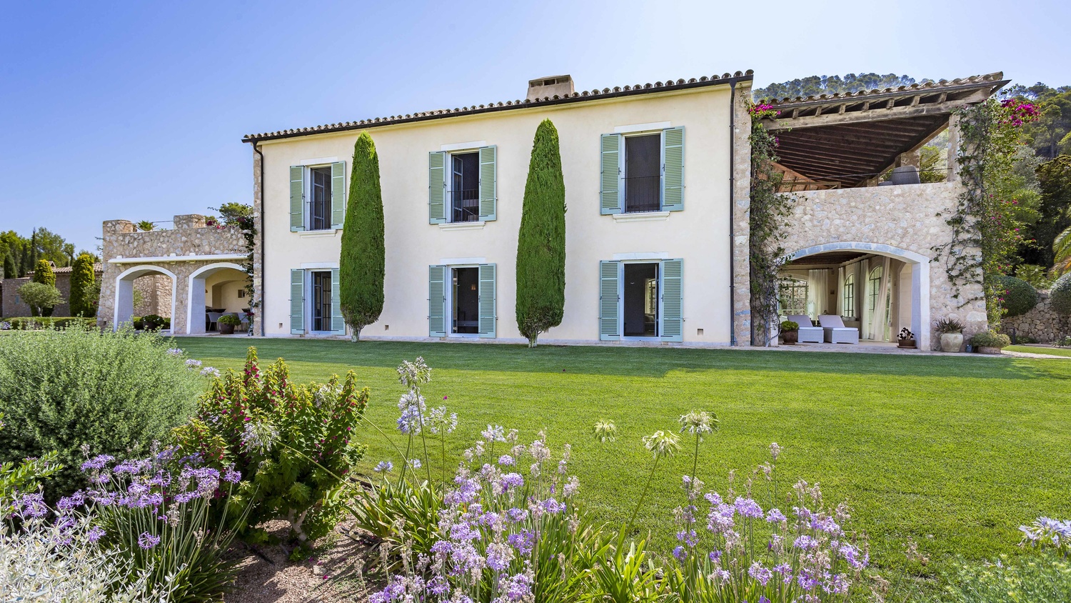 This exceptional finca is located on a nearly flat, slightly elevated plot just 15 minutes walk from Port de Andratx and offers a fantastic view of the bay of Port de Andratx. Three separate buildings, several exterior terraces and a large pool 75 m2 are part of this mansion - and all rooms and terraces are facing the sea and offer views of the chain of hills of Andratx. The modern finca with typical Mallorcan elements is well-maintained and equipped with many small details. It was built for personal use, hence the extremely high quality in construction. The central main villa impresses with 384 m2 area of well-being, distributed over two floors. n the first floor you find the master suite with bathroom and dressing room and a large covered terrace (52 m2), from which you can enjoy panoramic views of the port of Andratx. The second bedroom has an en-suite bathroom and a private roof terrace (28 m2). A third room is currently being used as an office- and TV-room, but, could easily be converted into another bedroom. On the ground floor there are the large bright living area with an open fireplace, the luxurious, fully equipped kitchen with adjoining utility room with separate second kitchen, the dining area with direct access to the outdoor terrace, a TV or office room (could also be converted into a bedroom) and the porch (83 m2). From every living area you have access to the Mediterranean garden with its cypress, palm, olive and lemon trees. It was planned by the well-known horticultural company Son Muda, who are maintaining it too. At the side of the main villa you find a guest house with living room and bedroom, bathroom and a private covered terrace. The building also has three separate garages and a technical room (heating). The pool house with a heated outdoor pool (heat pump) was converted into a second guest house in 2013 with living room and bedroom with bathroom en-suite and an outdoor terrace. In the same group of buildings, you will find a fully equipped outdoor kitchen with electric grill, Japanese Tepanyaki grill, hotplates, refrigerator, freezer, dishwasher and several cupboards. Under the pool there are both the pool technology room and the diesel generator with a stand-by unit in case of a power failure. The whole property is completely fenced by a high mesh wire fence. Wonderful walks on your own grounds are awaiting you!