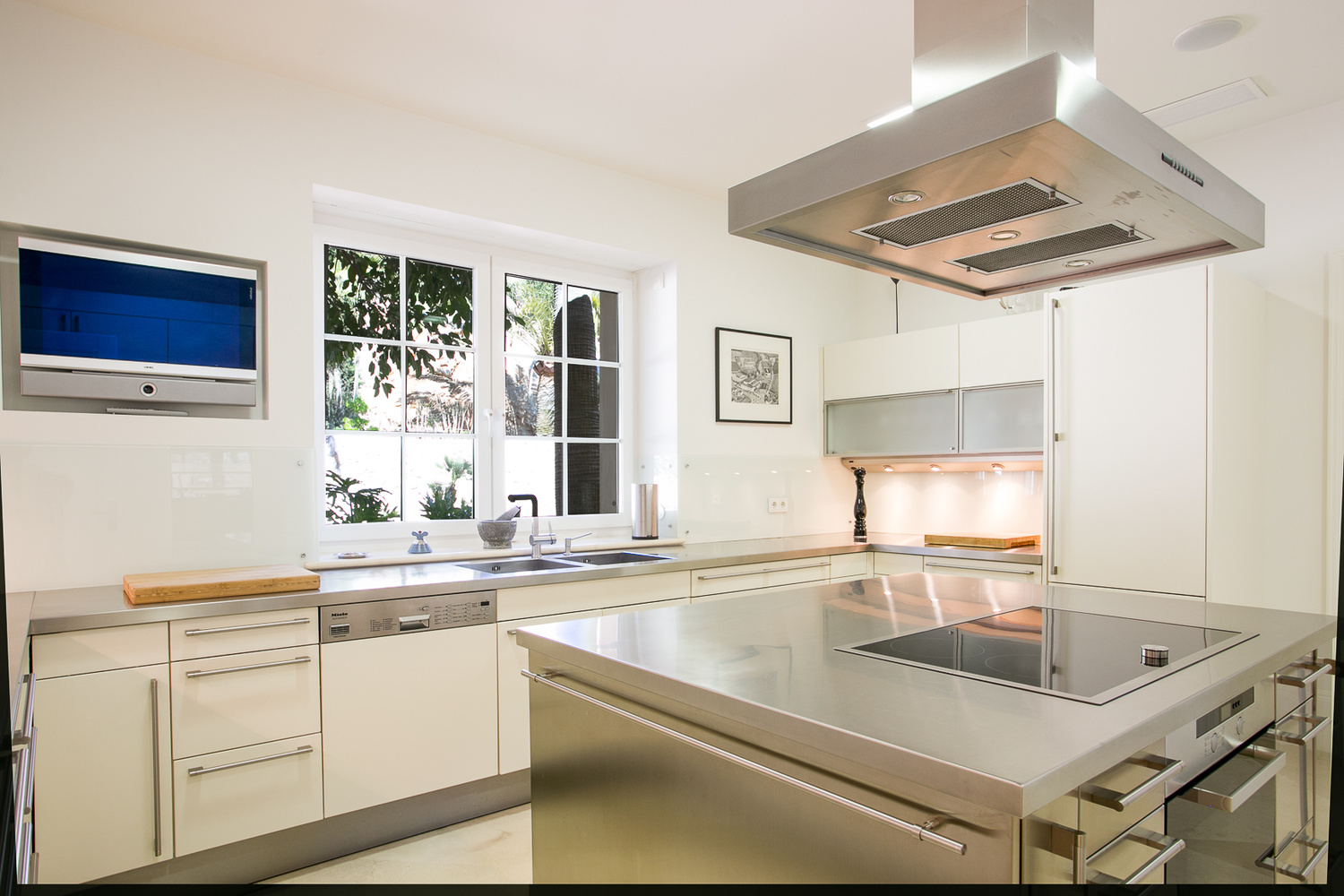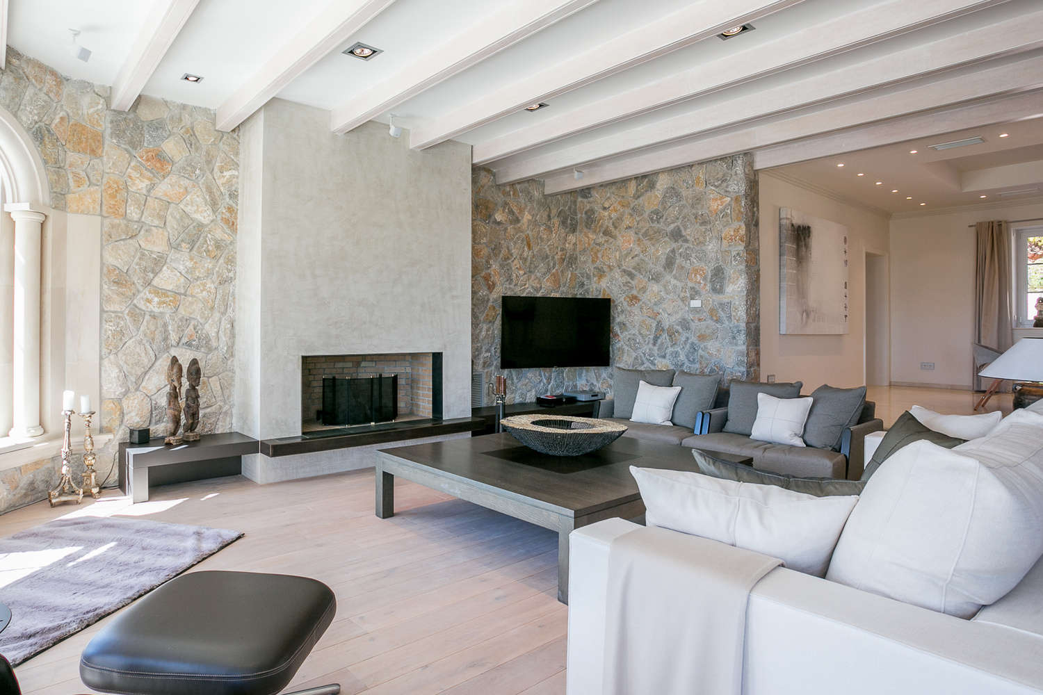 On the side further to the right, there is a large office that could easily become a fifth bedroom. Towards the pool, there is a large living room with sliding glass doors, which can be opened fully in summer, but in winter can also be used as a large second living room.