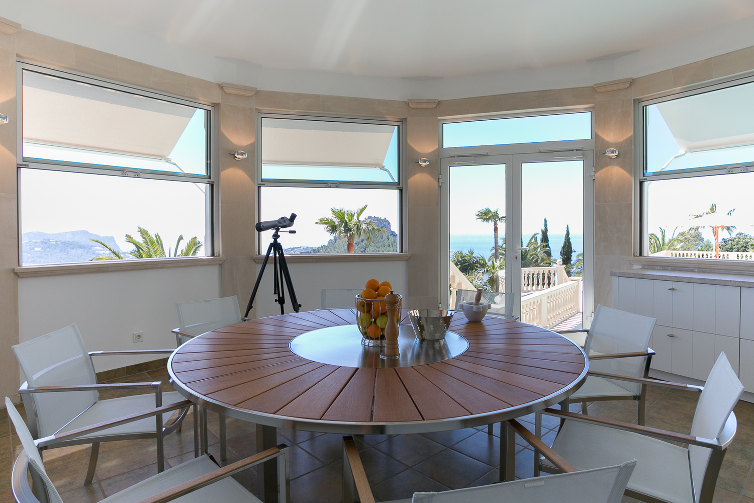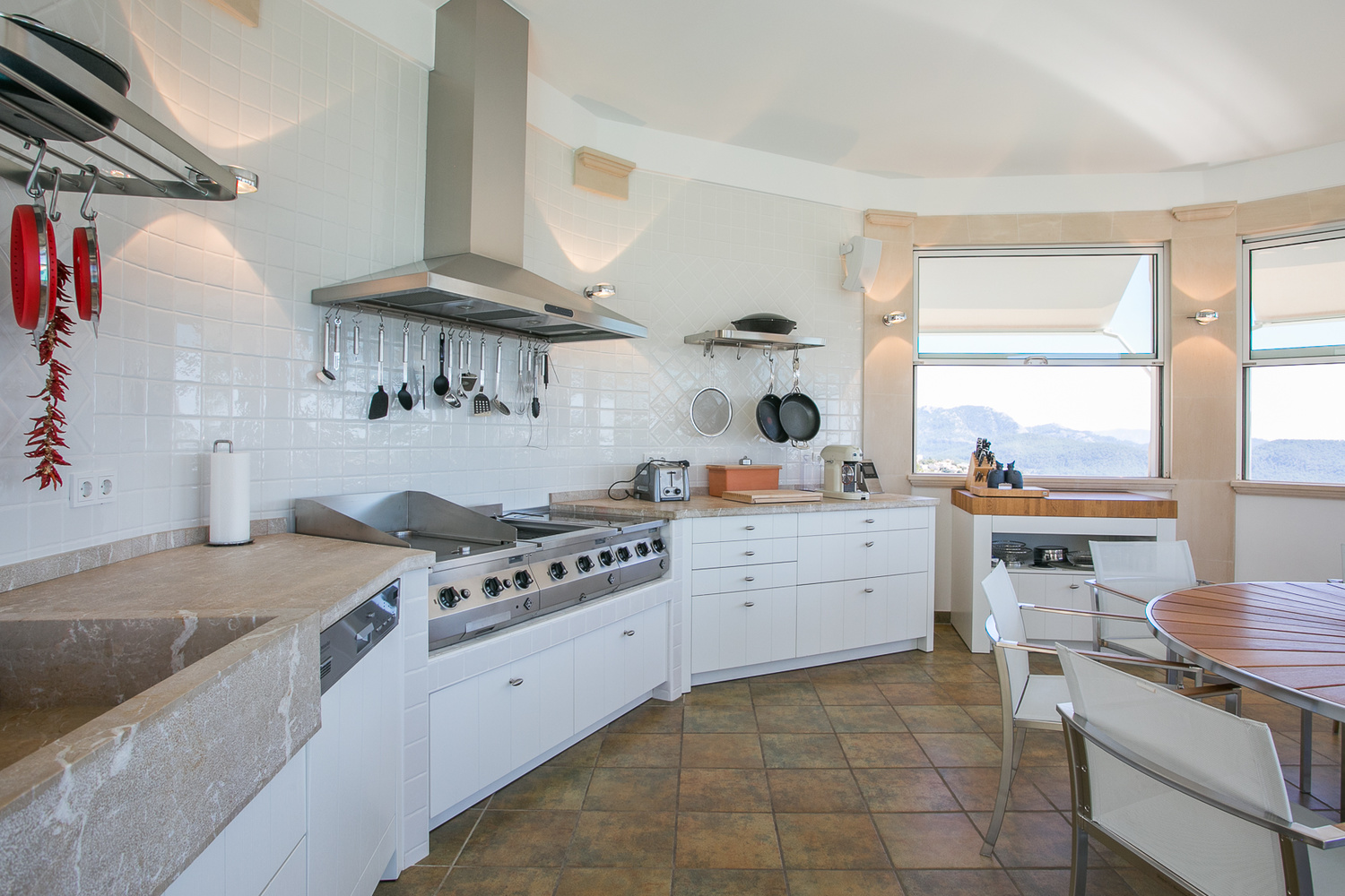 Via a small stone bridge across the pool, you reach a large round tower-like space, where there is a kitchen and barbecue with a large dining area and panoramic sea views. Opposite this outside kitchen tower, and with independent entrance, there is a double bedroom with bathroom en-suite for guests.