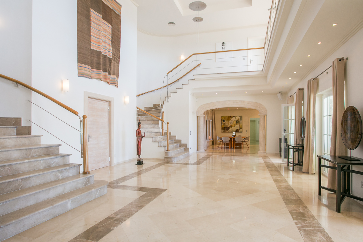 Ground floor: Via a short driveway you access a large double garage, at the level of the main entrance, as well as several outdoor parking spaces. The main entrance is in front of a small waterfall and gives access to a big entrance hall with double high ceiling, where the spectacular views to the sea invade the first seconds of your visit.