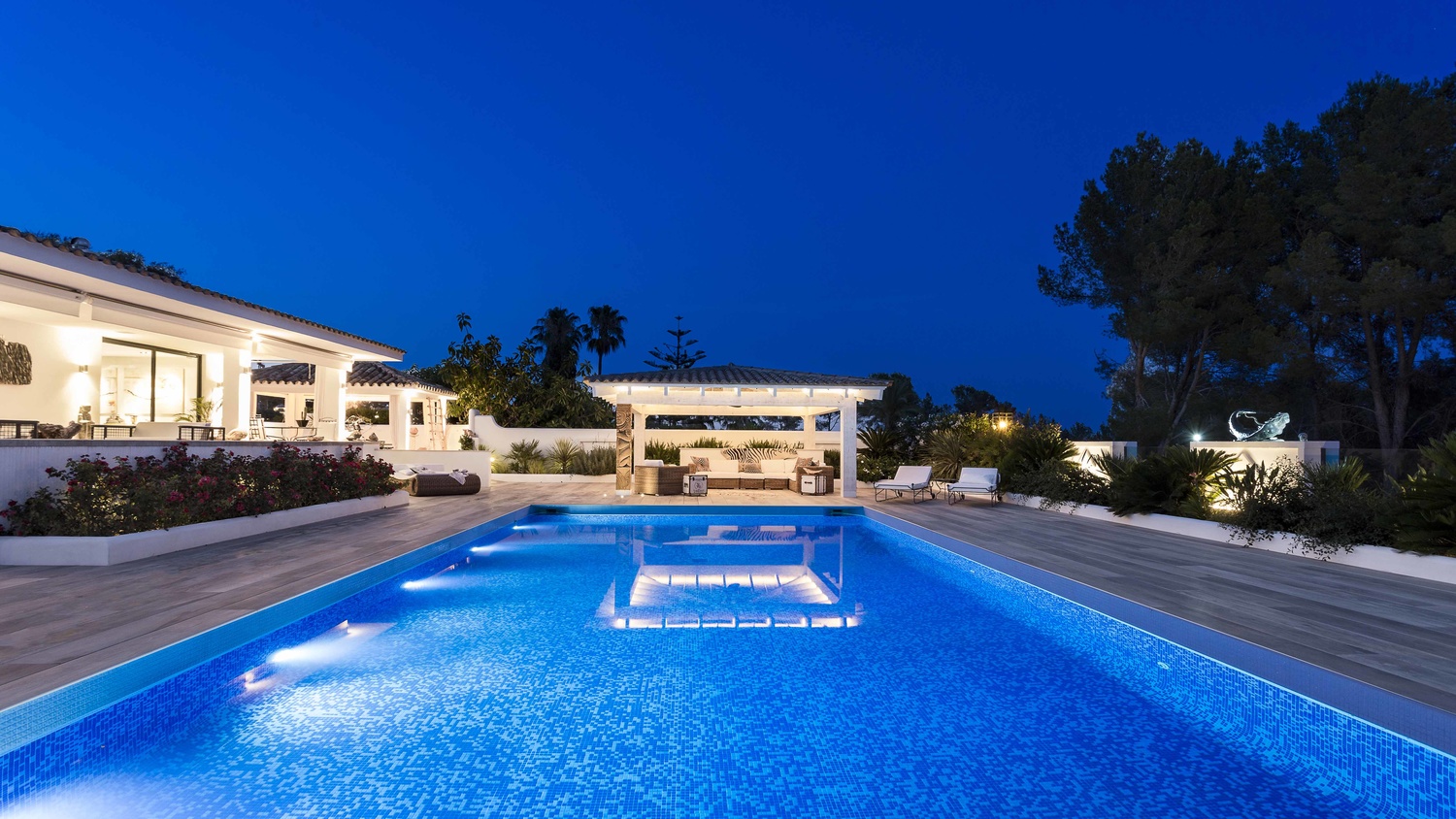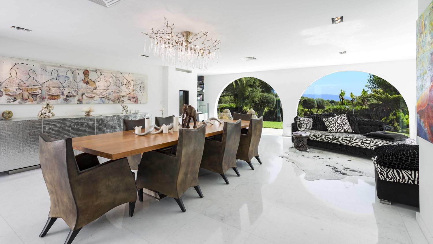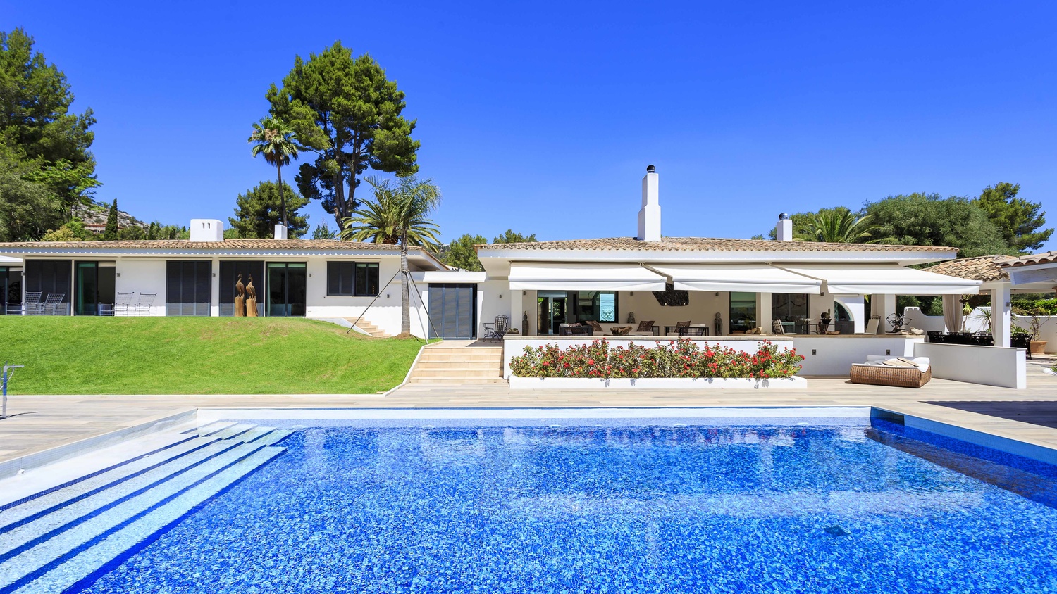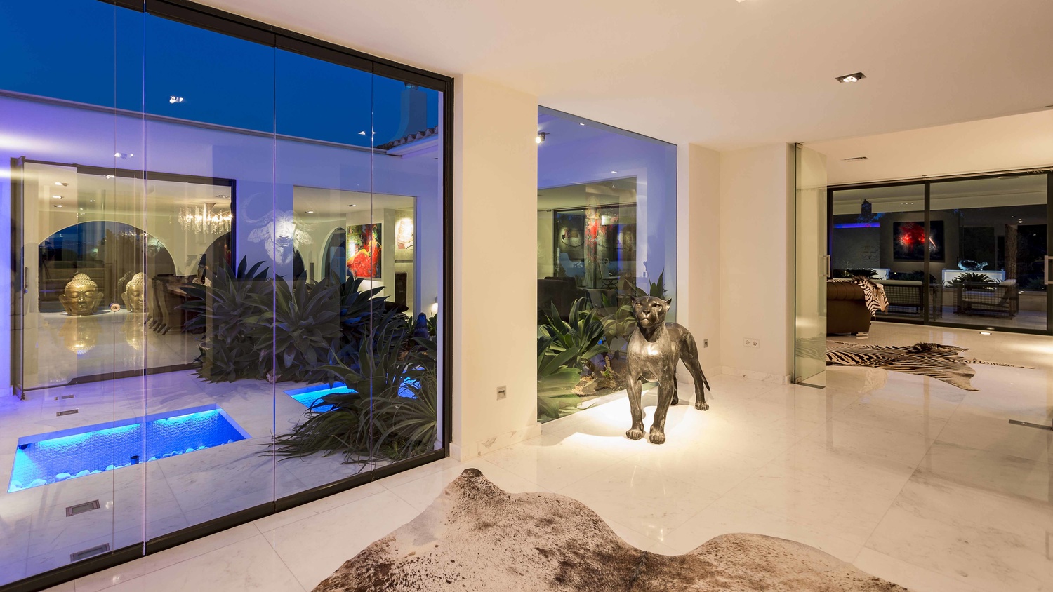Outside area: The villa is located on an 8000 sqm flat garden plot, with an extensive lawn. The gardens have their own entrance to access the plot, the garden is extremely well maintained and there are separate gardeners quarters. The large outdoor pool is a salt-water analyze pool and underneath the pool area there is one large independent accessible guesthouse with 3 bedrooms, open kitchen, living area and two bathrooms, as well as sauna.
