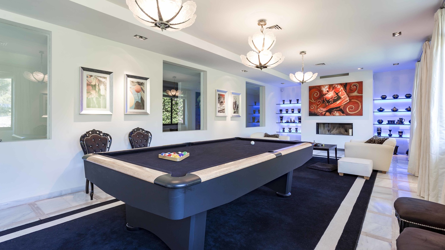 Ground floor: Large entrance hall with indoor patio with a fountain, play or billiard room, guest-powder room, living room with open fireplace and spacious dining area, kitchen with breakfast area, laundry room, garage in the main house suitable for two cars, office, 3 guest bedrooms with bathroom en-suite, large master suite with dressing room and separate bathroom.