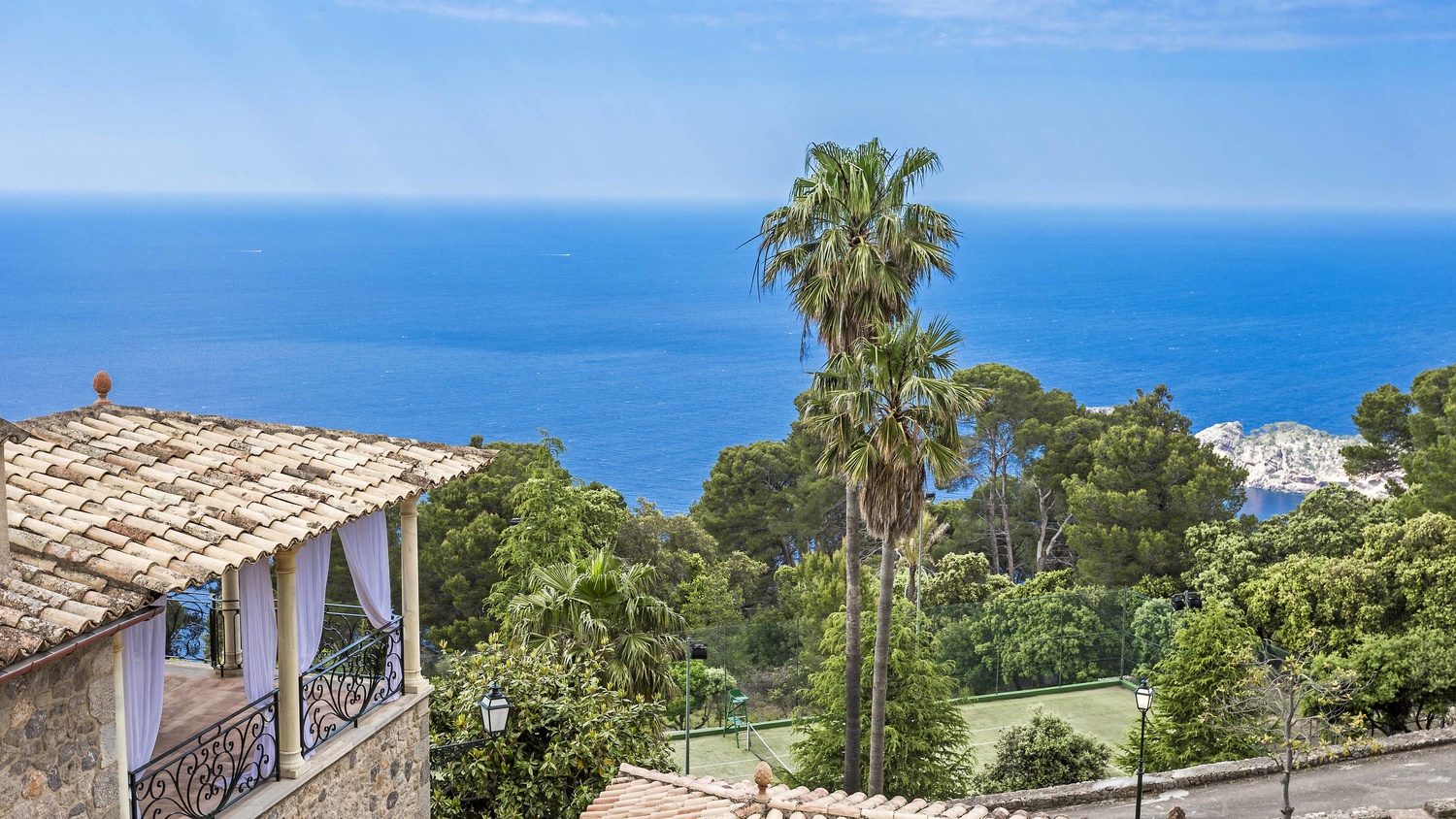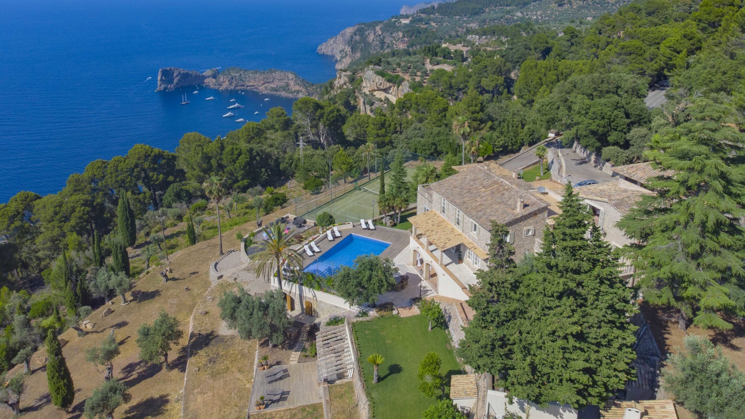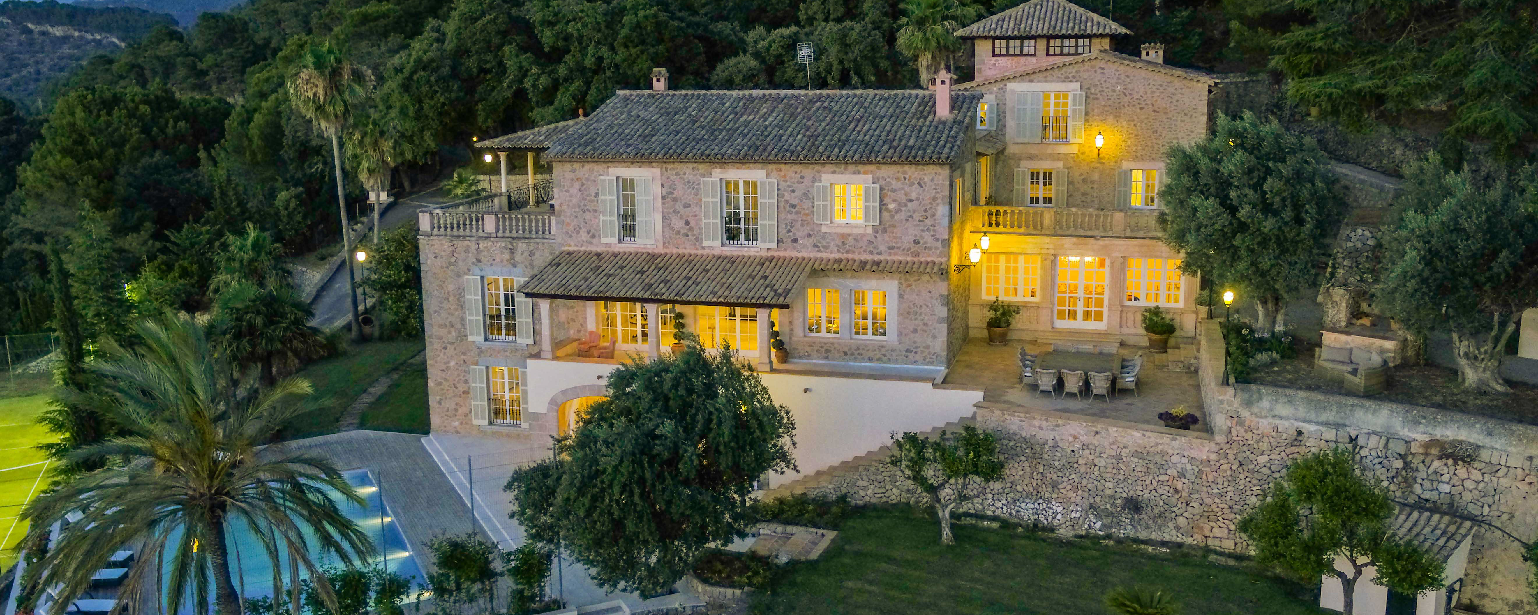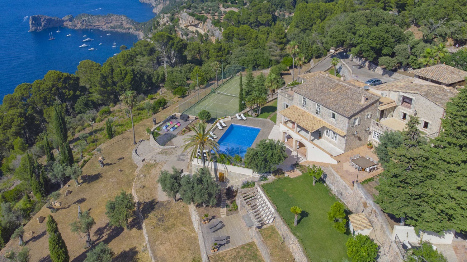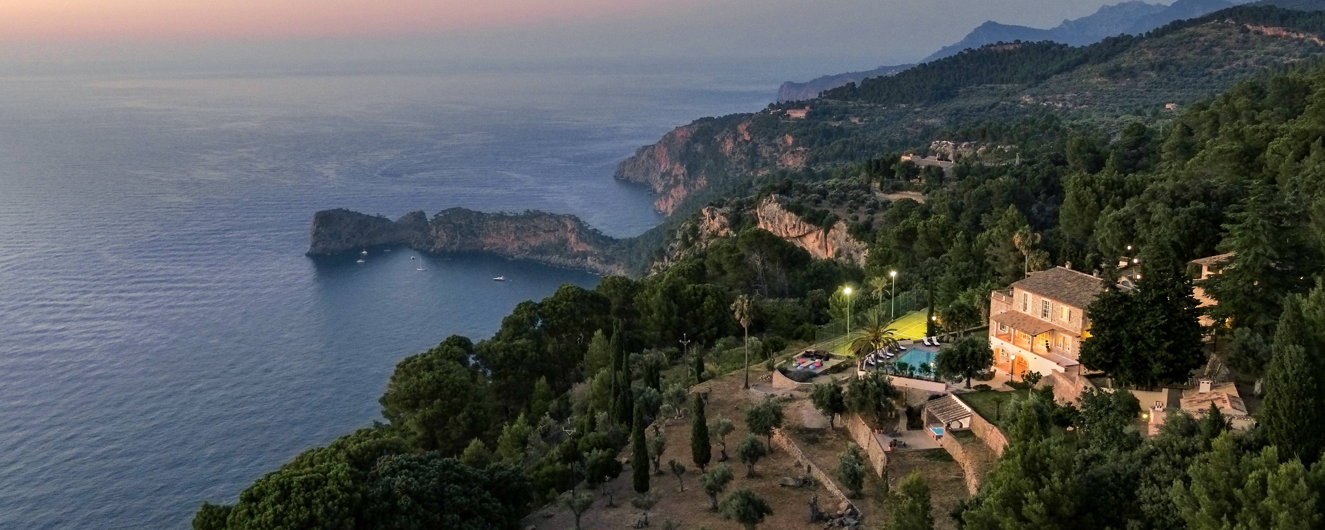 Majestically located on the west coast of Majorca in first line of the sea, this property generates a moment of astonishing silence as soon as you reach the property of more than 23.000 m2. Awe-stricken, the visitor admires the monument of architectural art in this fascinating setting. In any Hollywood classic, this set would be the star. The property invites to go for walks and the private tennis court has centre-court proportions.