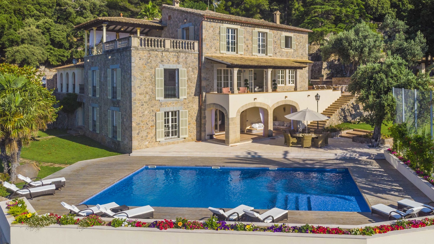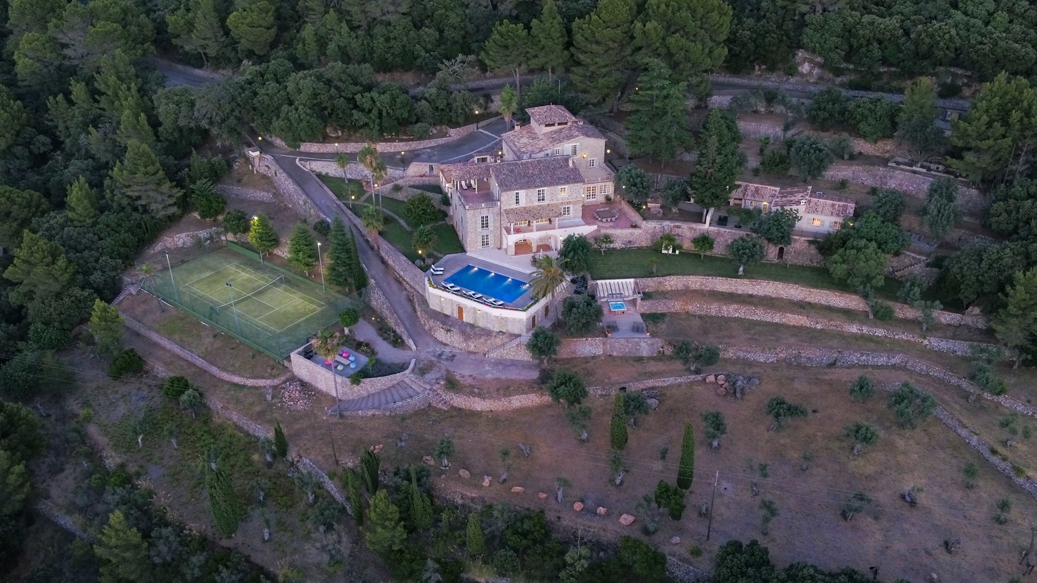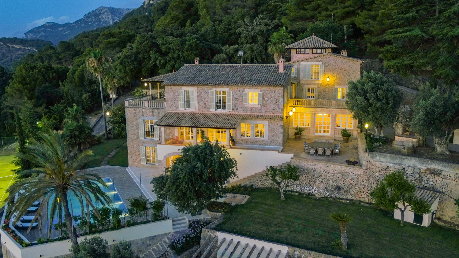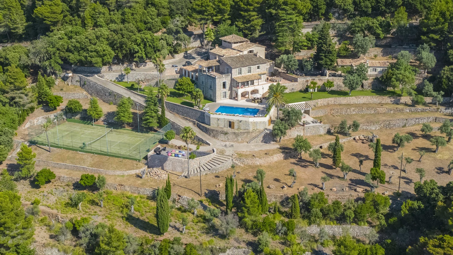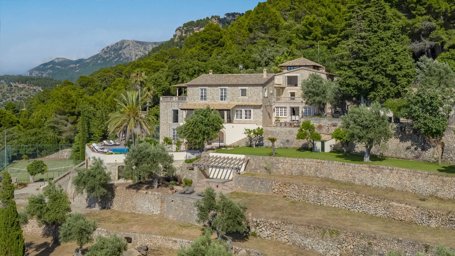 Majestically located on the west coast of Majorca in first line of the sea, this property generates a moment of astonishing silence as soon as you reach the property of more than 23.000 m2. Awe-stricken, the visitor admires the monument of architectural art in this fascinating setting. In any Hollywood classic, this set would be the star. The property invites to go for walks and the private tennis court has centre-court proportions.