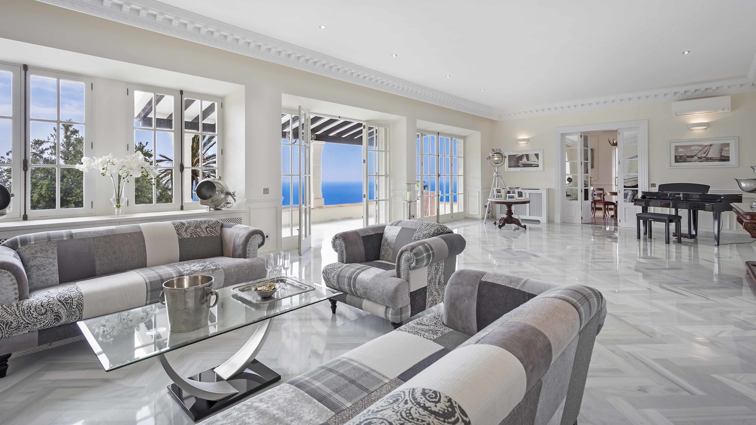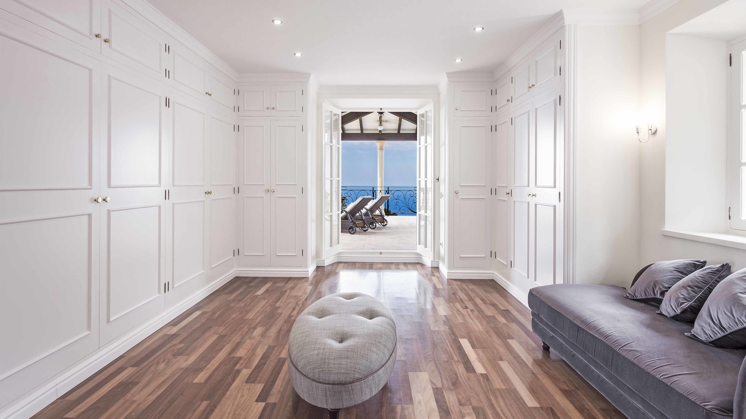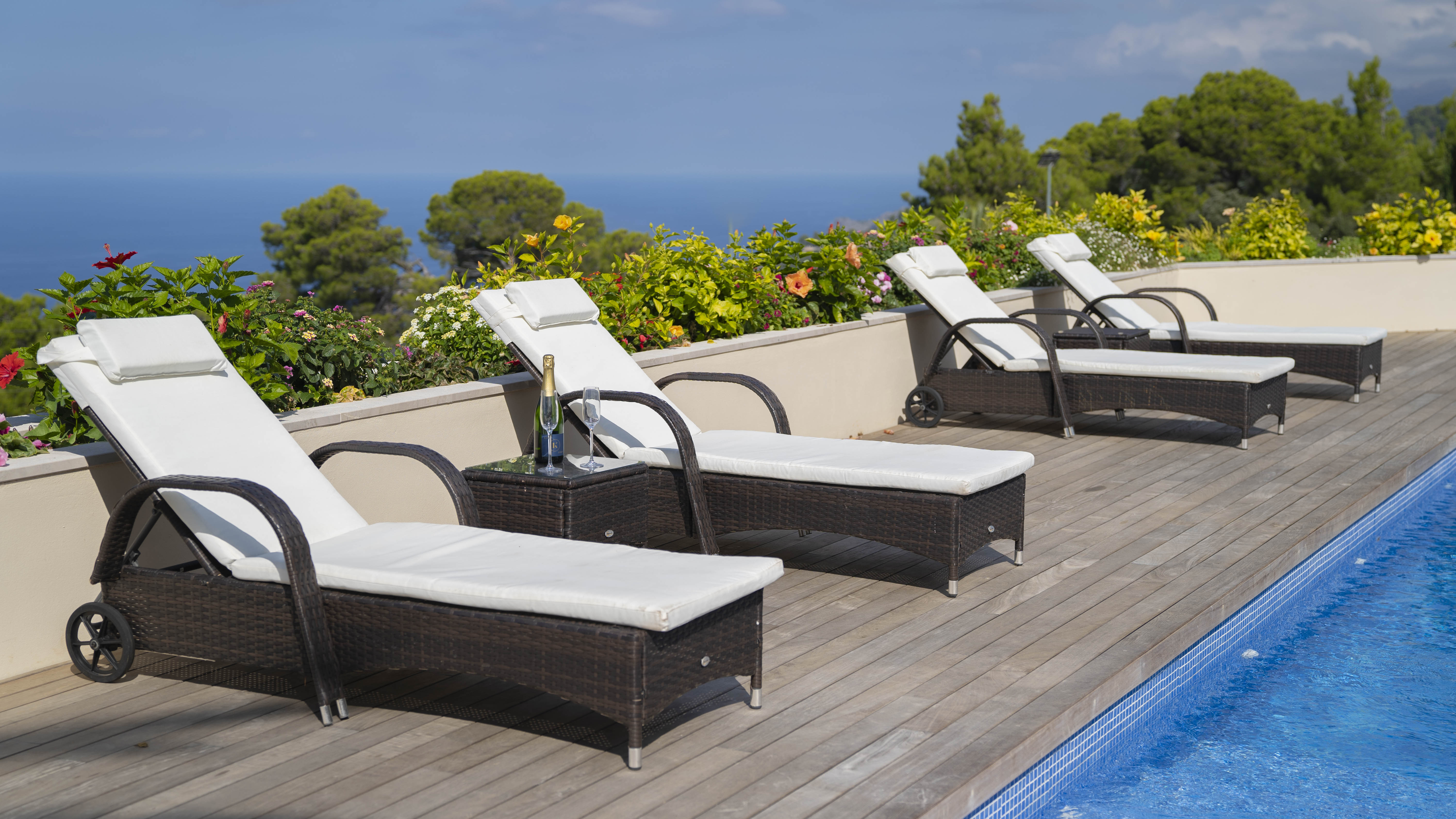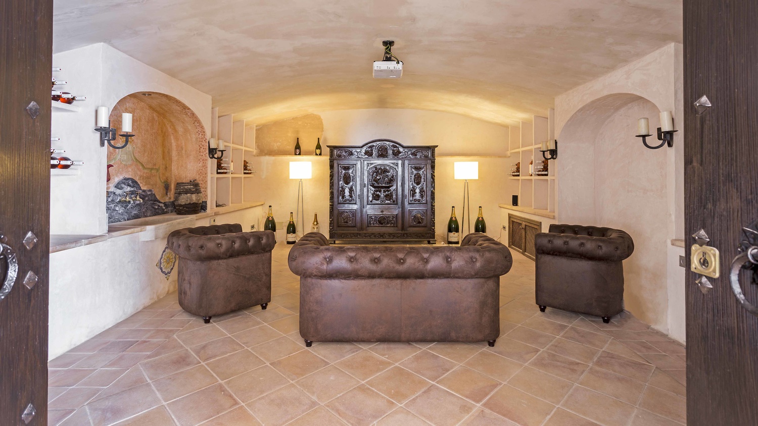 The main house has 6 bedrooms each with en-suite bathroom, 2 kitchens with Miele, equipped with Gaggenau and TM ITALIA appliances, one dining room, a lounge, a piano room, a pool-lounge as well as a gym, a wine cellar, and a home cinema.