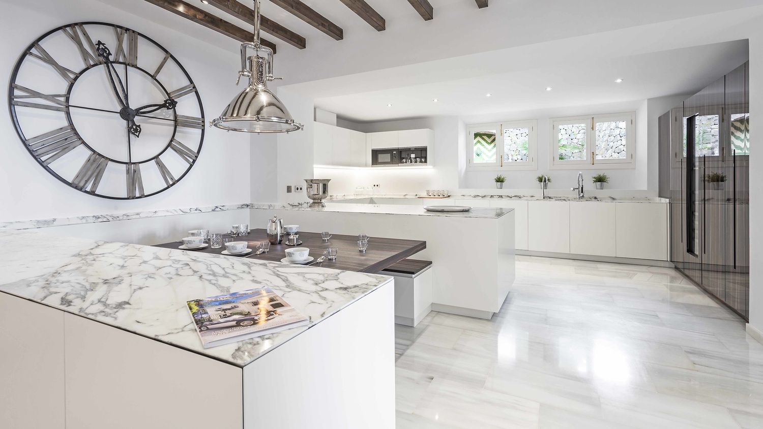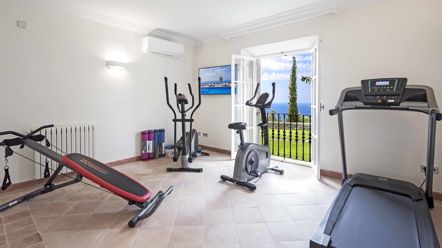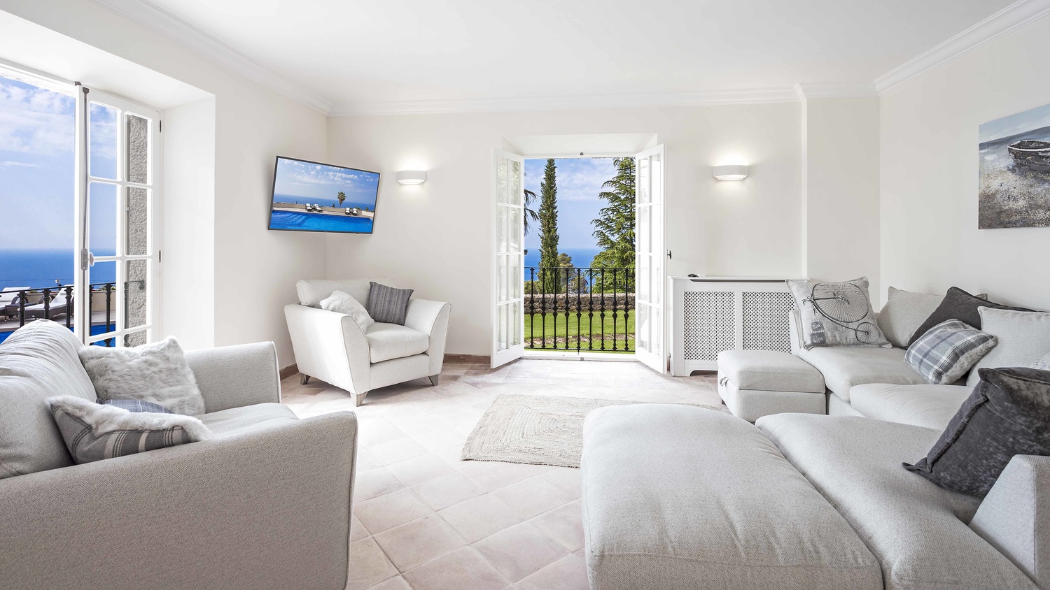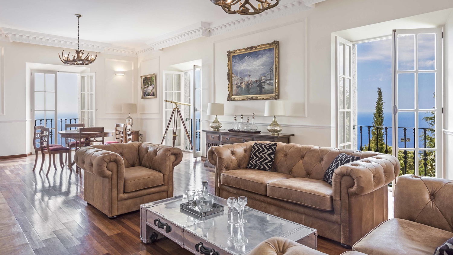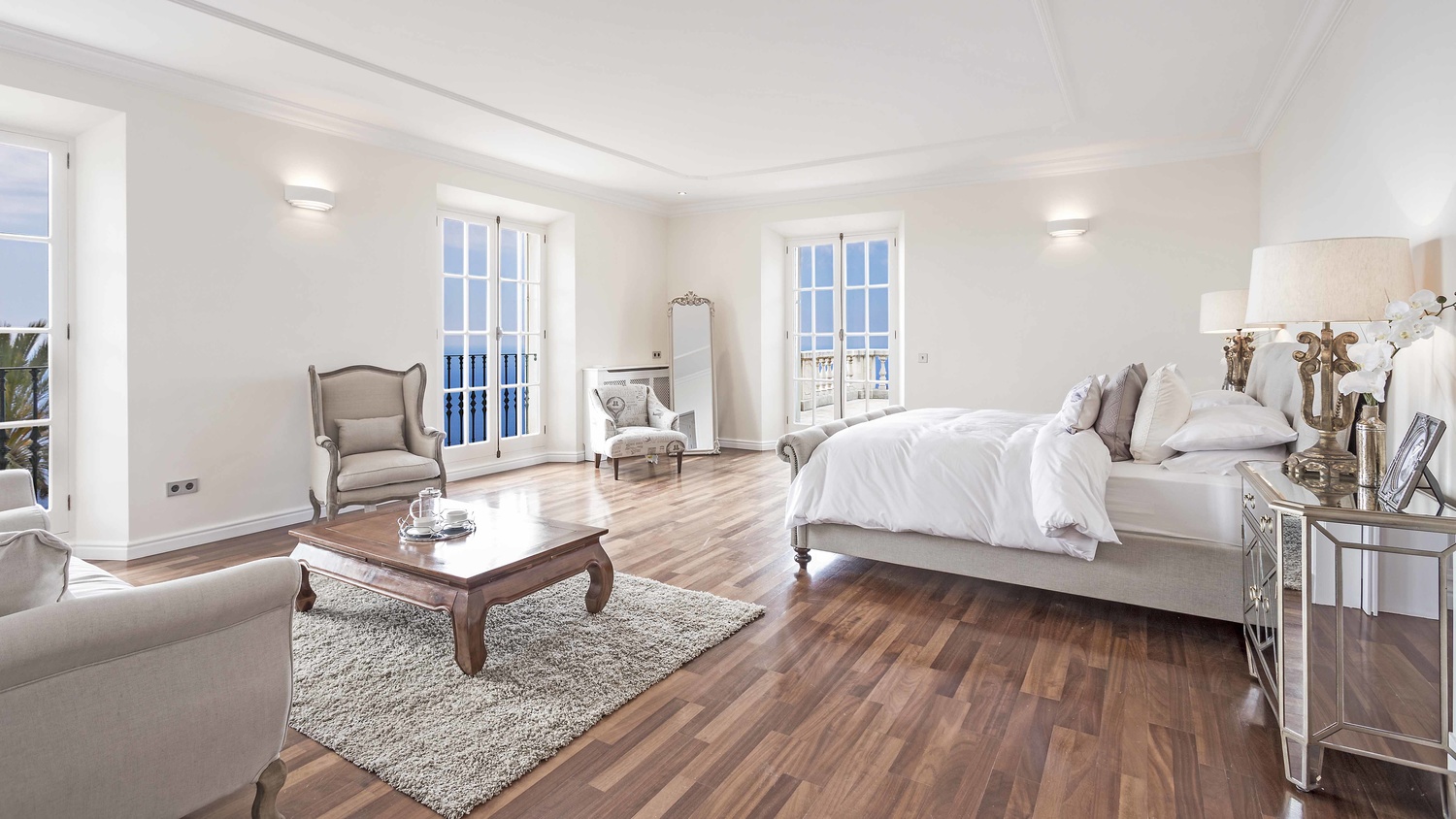 The main house has 6 bedrooms each with en-suite bathroom, 2 kitchens with Miele, equipped with Gaggenau and TM ITALIA appliances, one dining room, a lounge, a piano room, a pool-lounge as well as a gym, a wine cellar, and a home cinema.