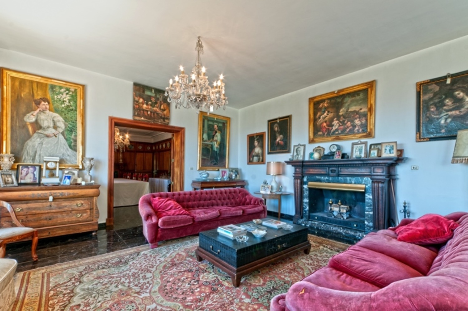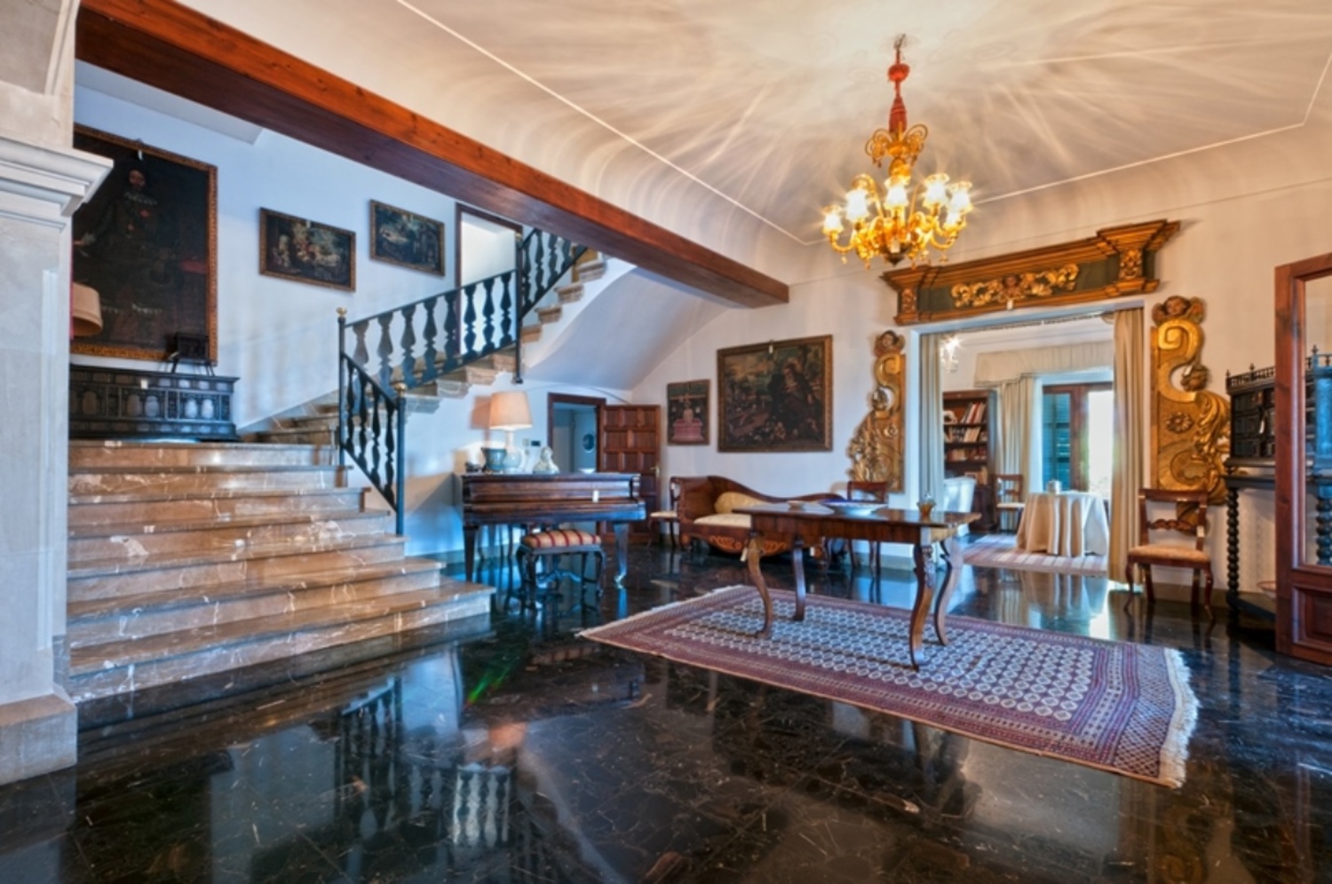 Ground floor: Grand entrance hall, main living room with fireplace, library sitting room, dining room, serving kitchen, grand marble staircase.
