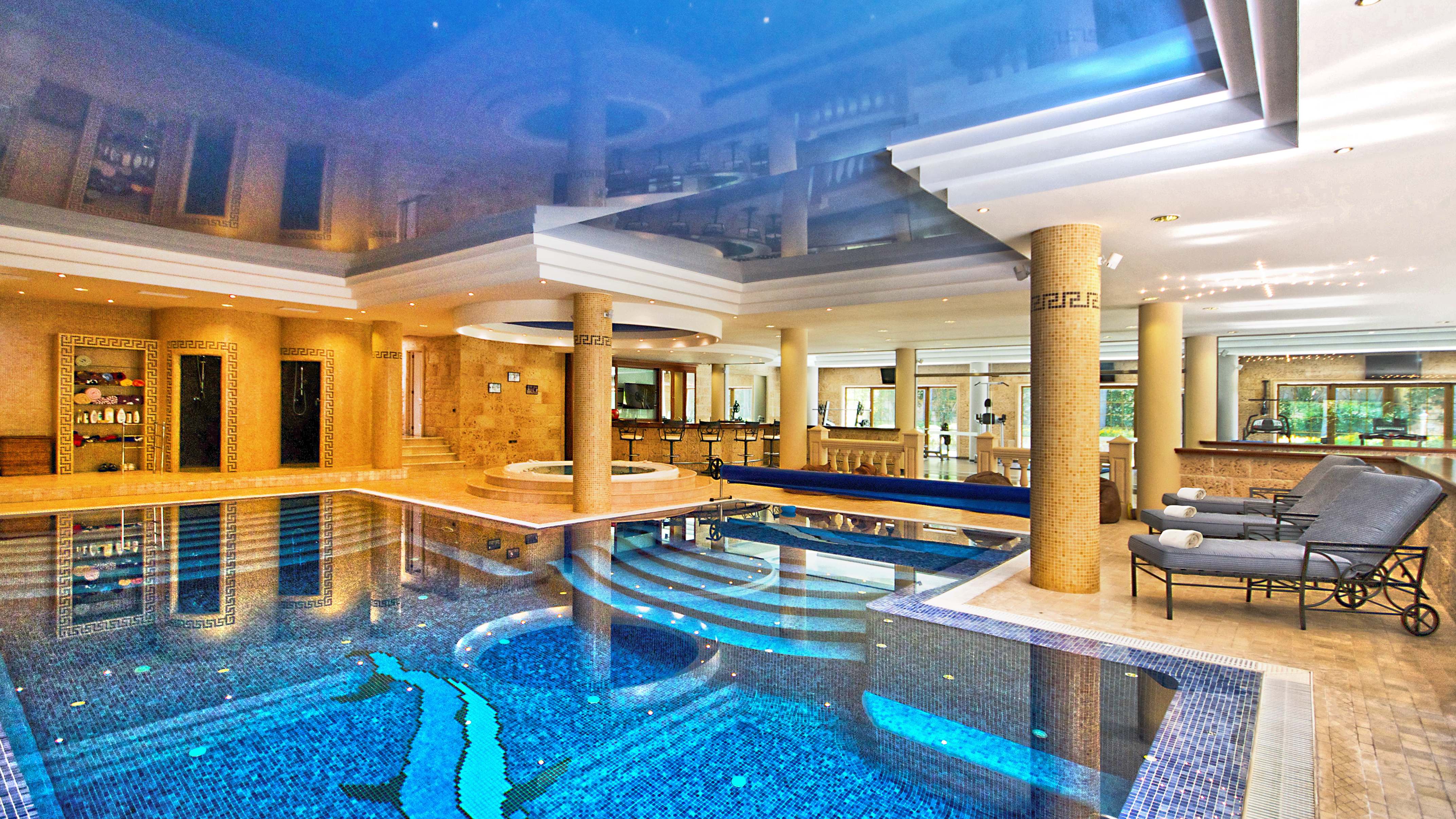 Separate Spa and Wellness area of 500 m2 with indoor swimming pool, gym, sauna, massage room, whirlpool, changing rooms and bathrooms.