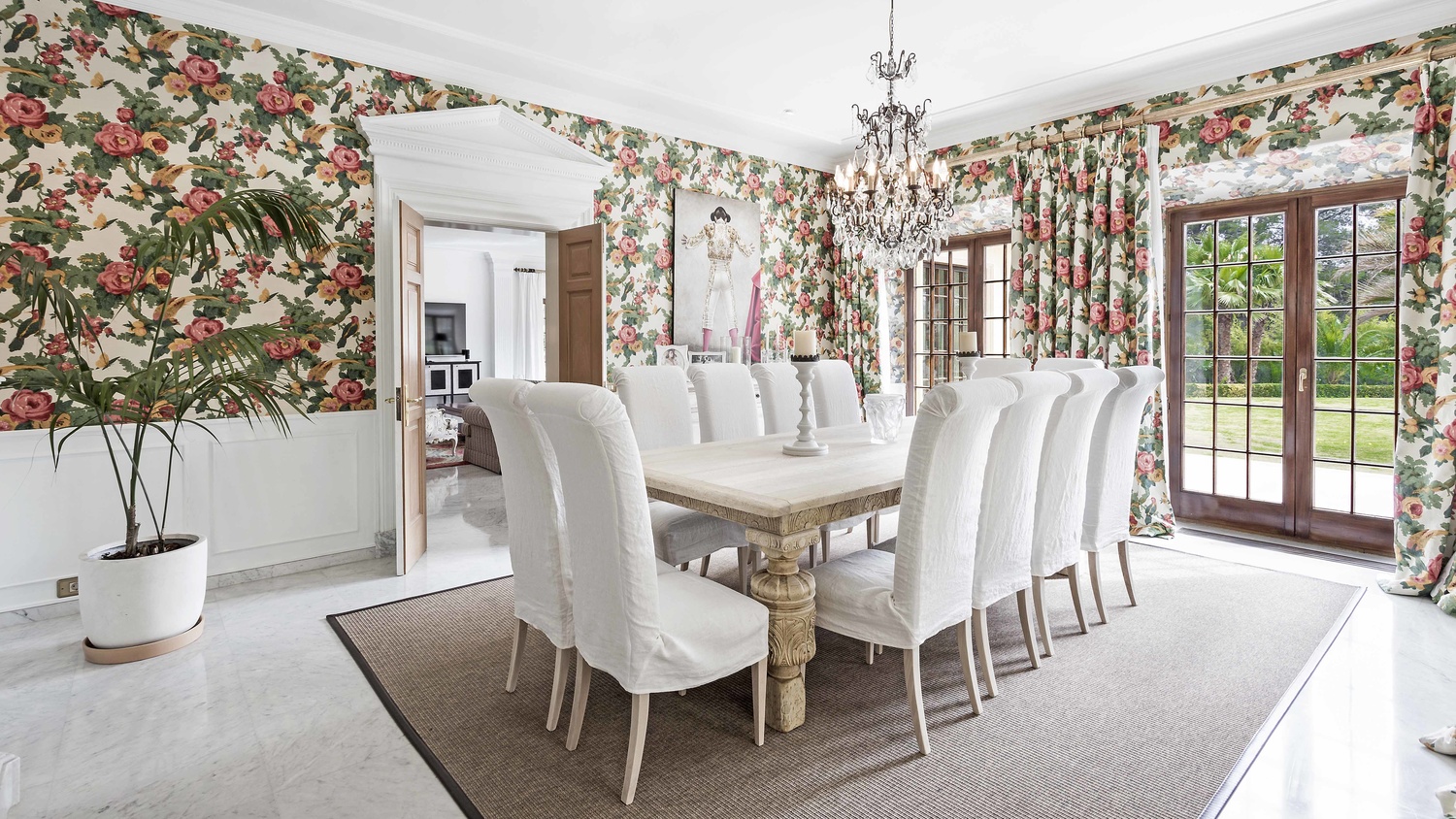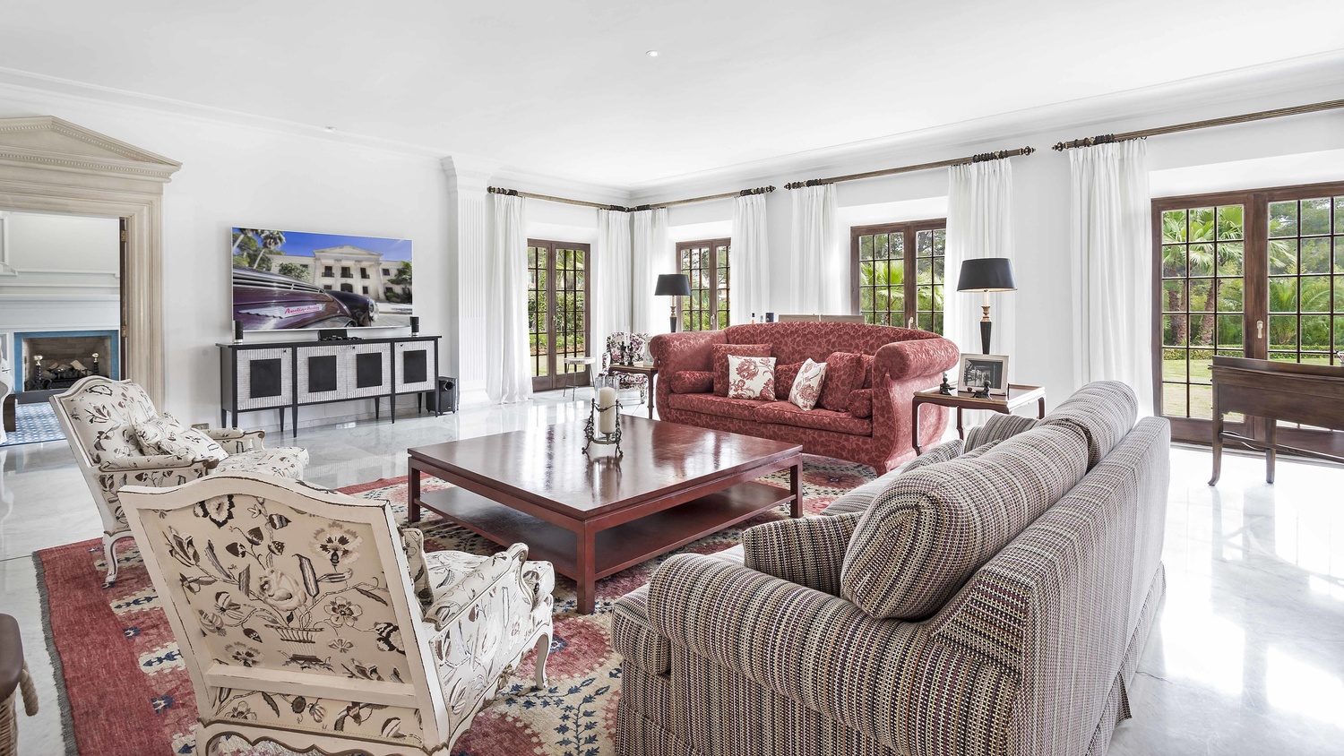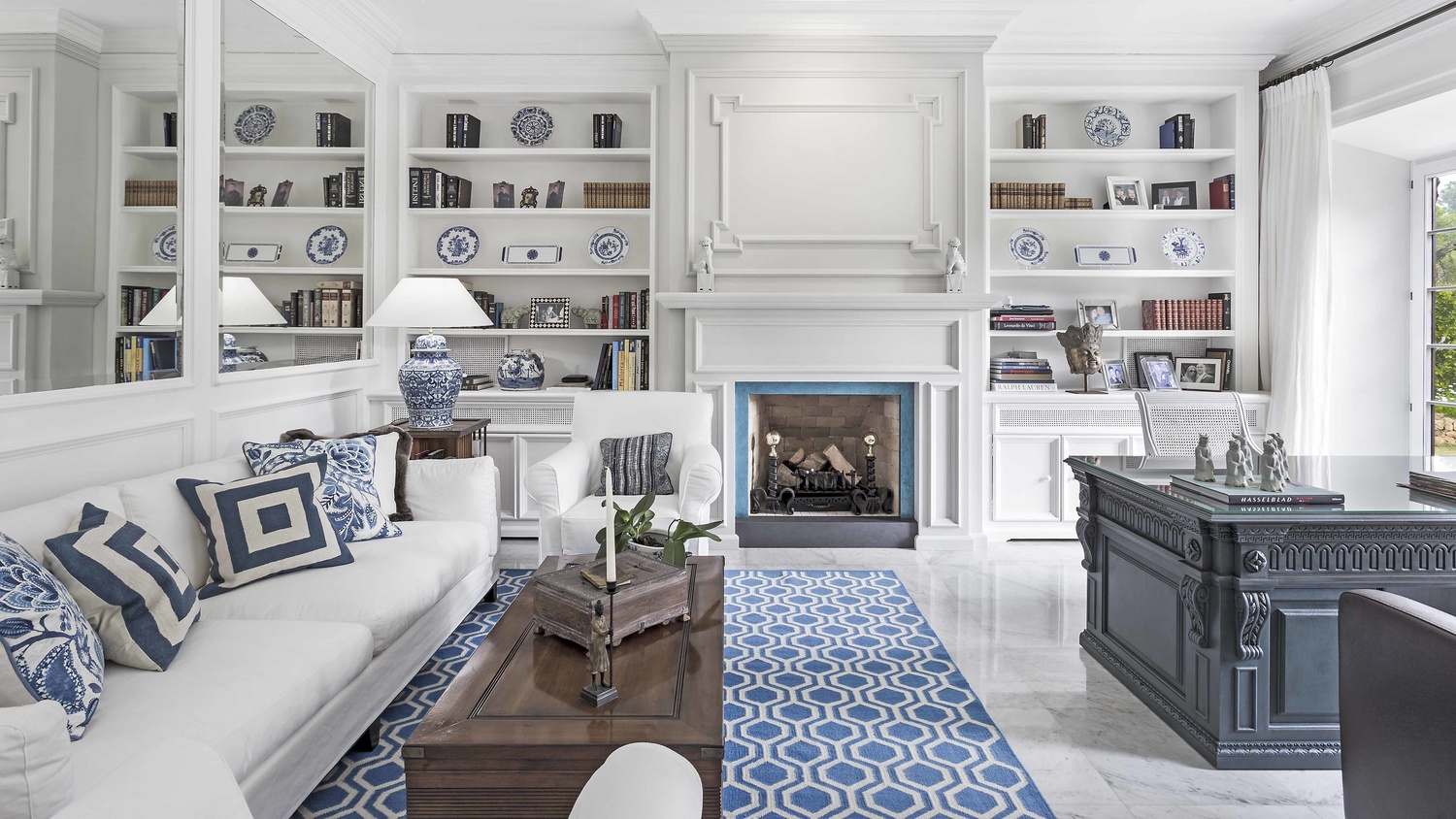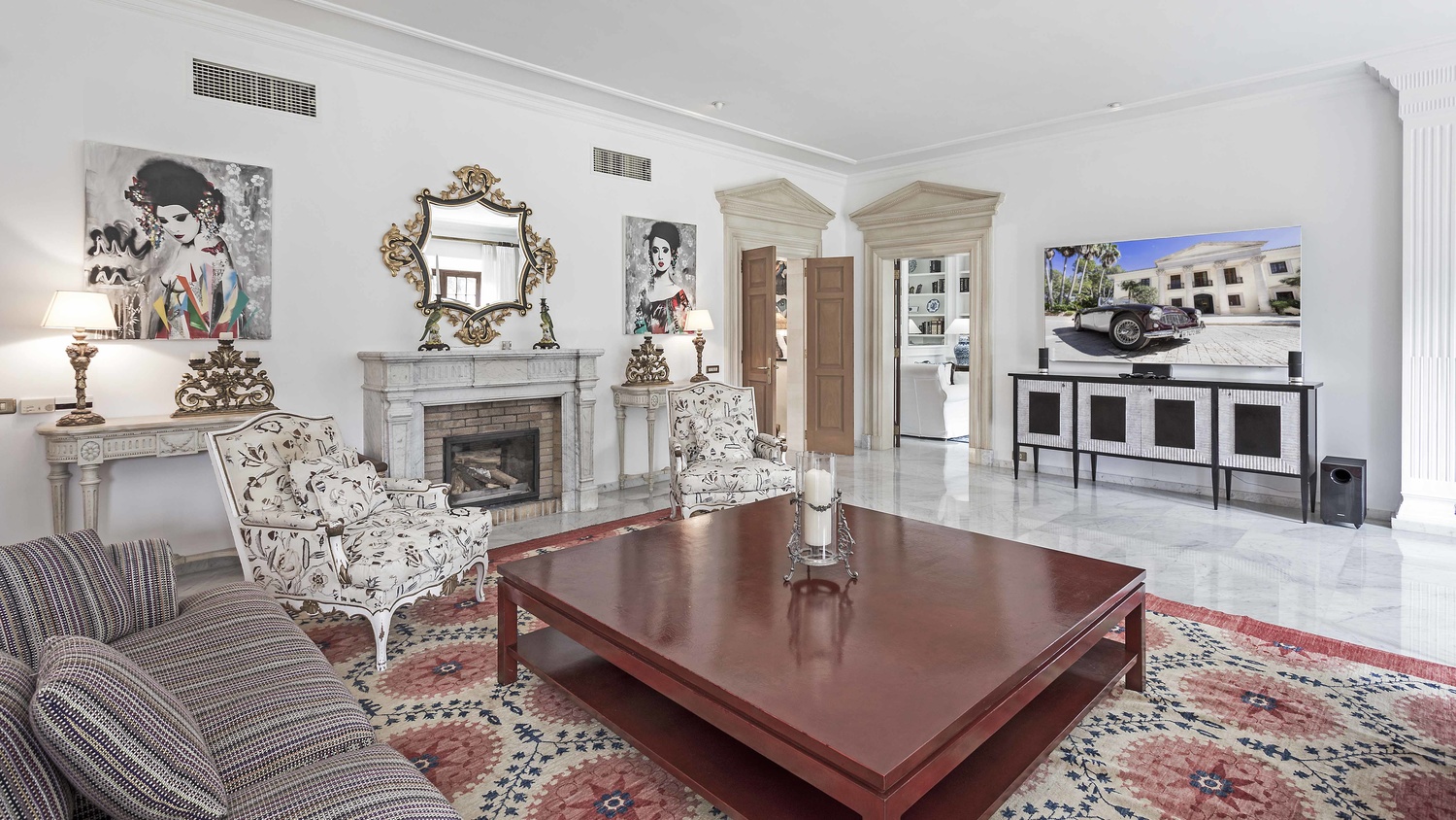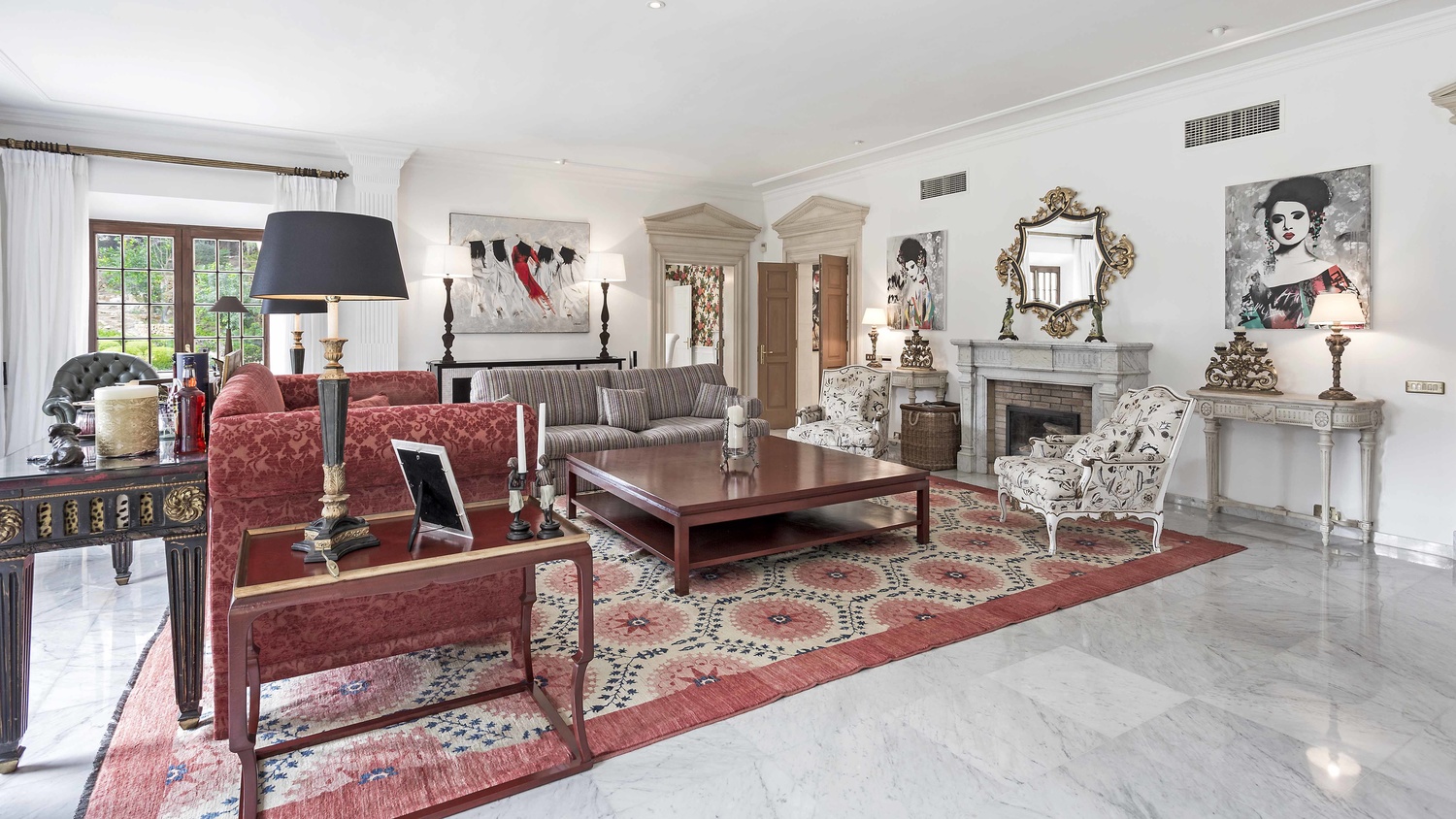 Ground floor: Spacious entrance hall with fireplace, ample living room with dining area and fireplace, library with fireplace, 1 guest bedroom with bathroom en suite and dressing room, large kitchen, various utility rooms, guest cloak room.