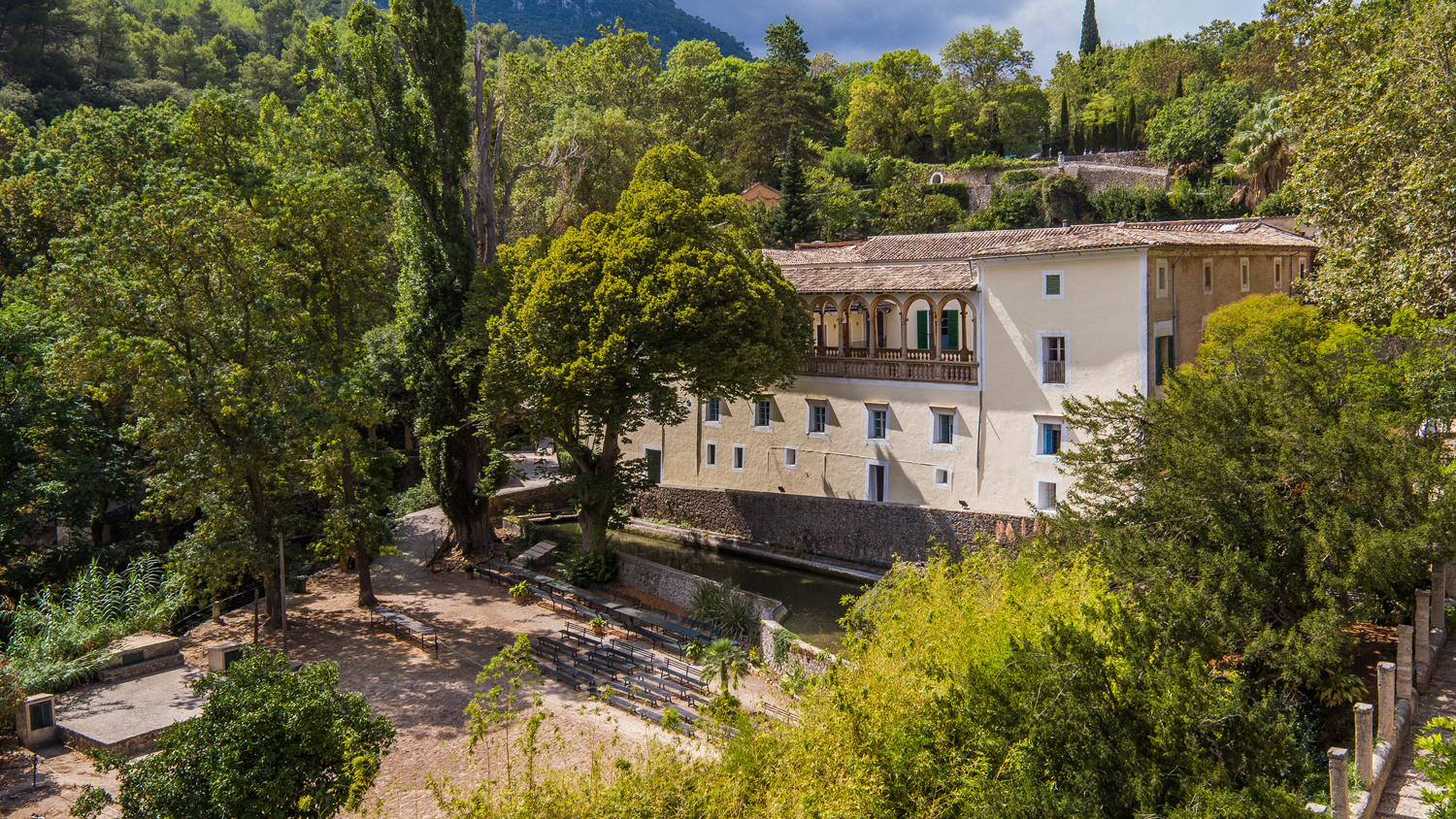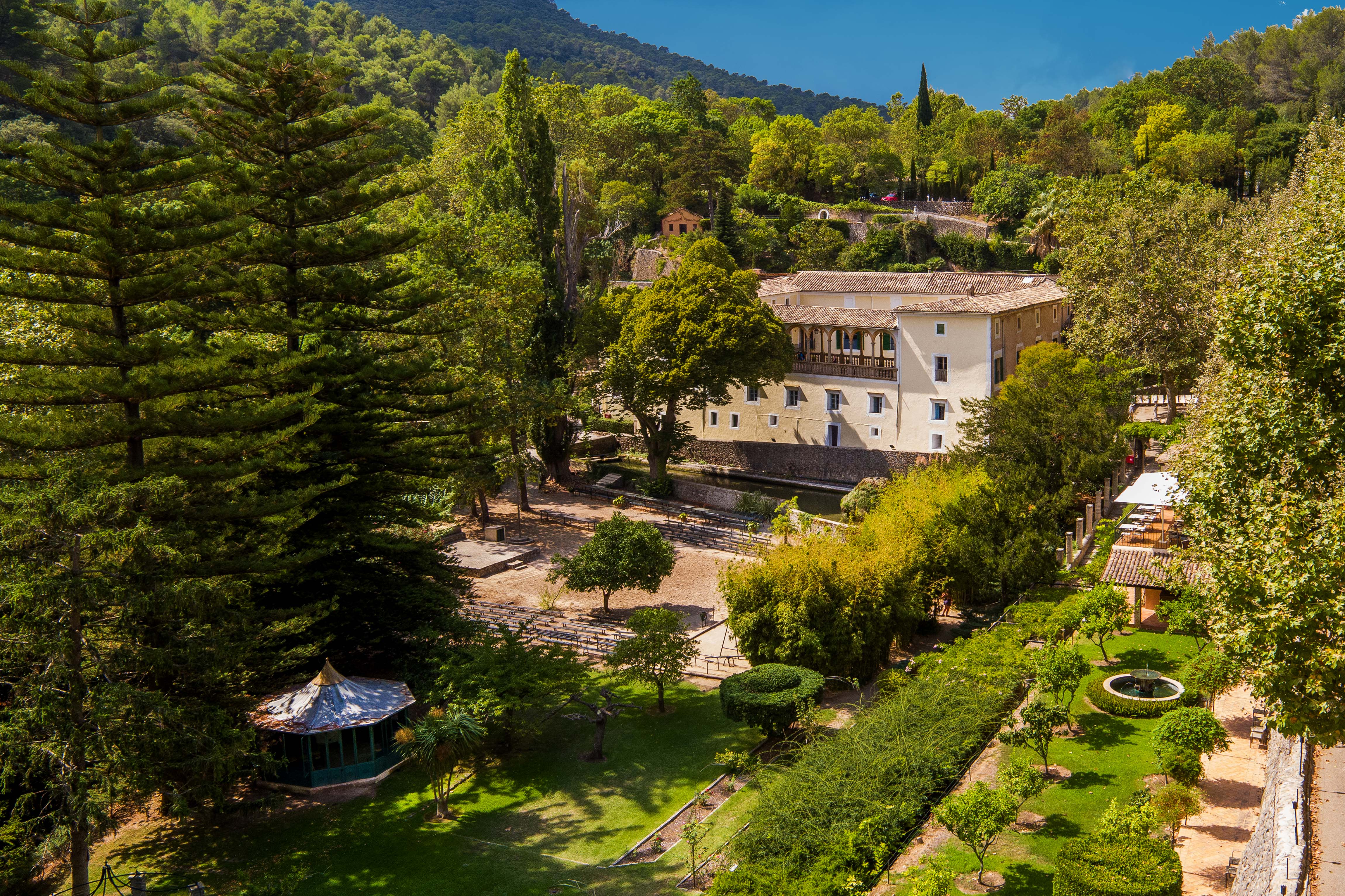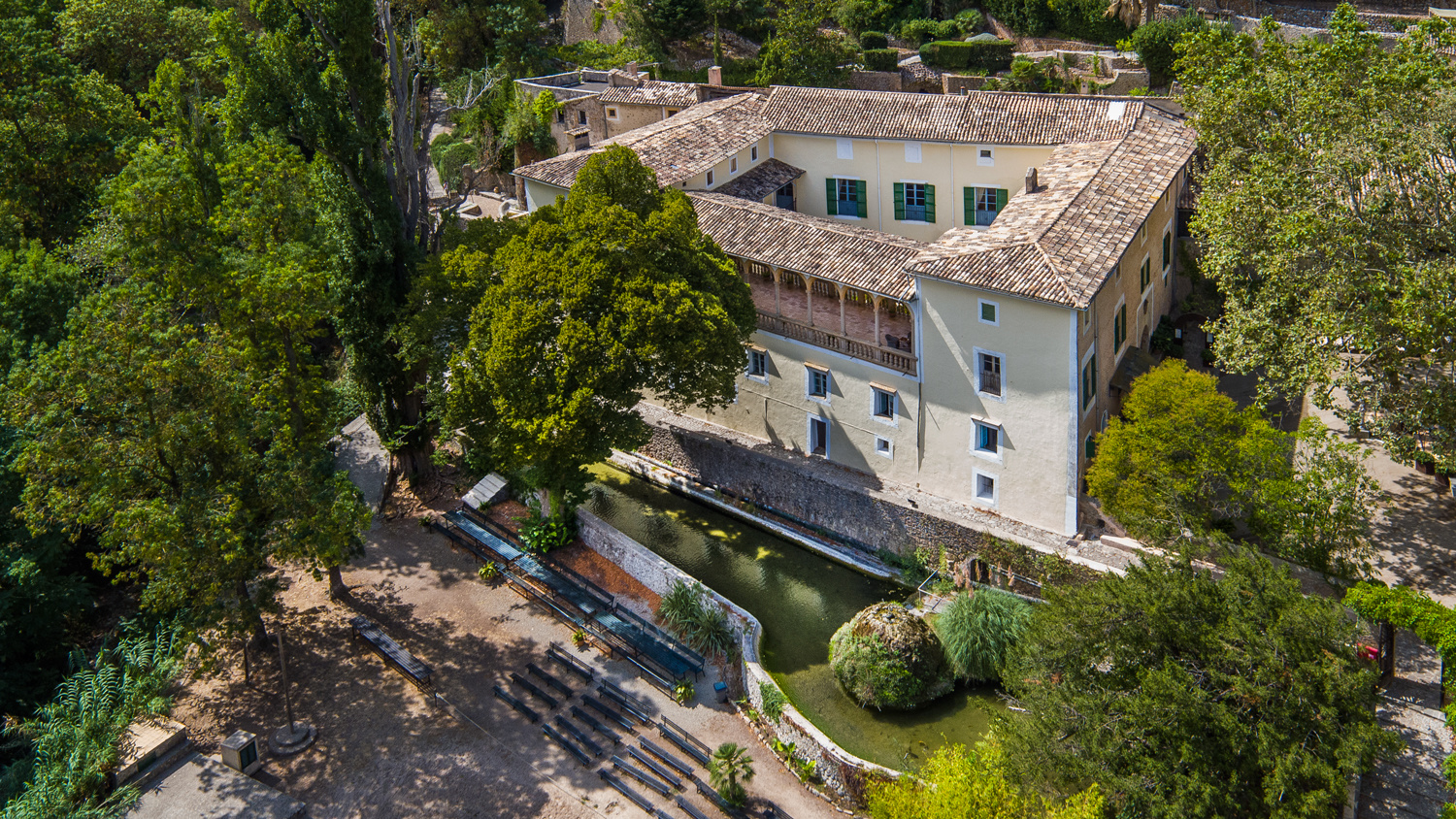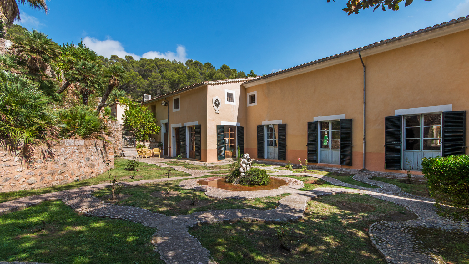 The exterior offers lush gardens with natural waterfalls and a stream running through the typical woodland of the Serra de Tramuntana Mountains.
