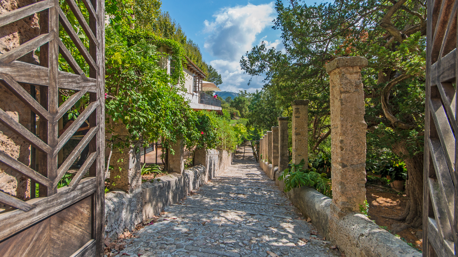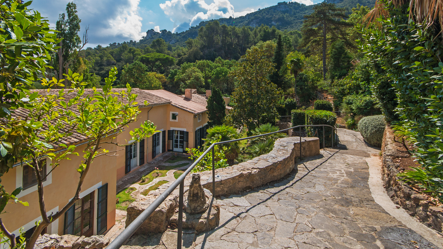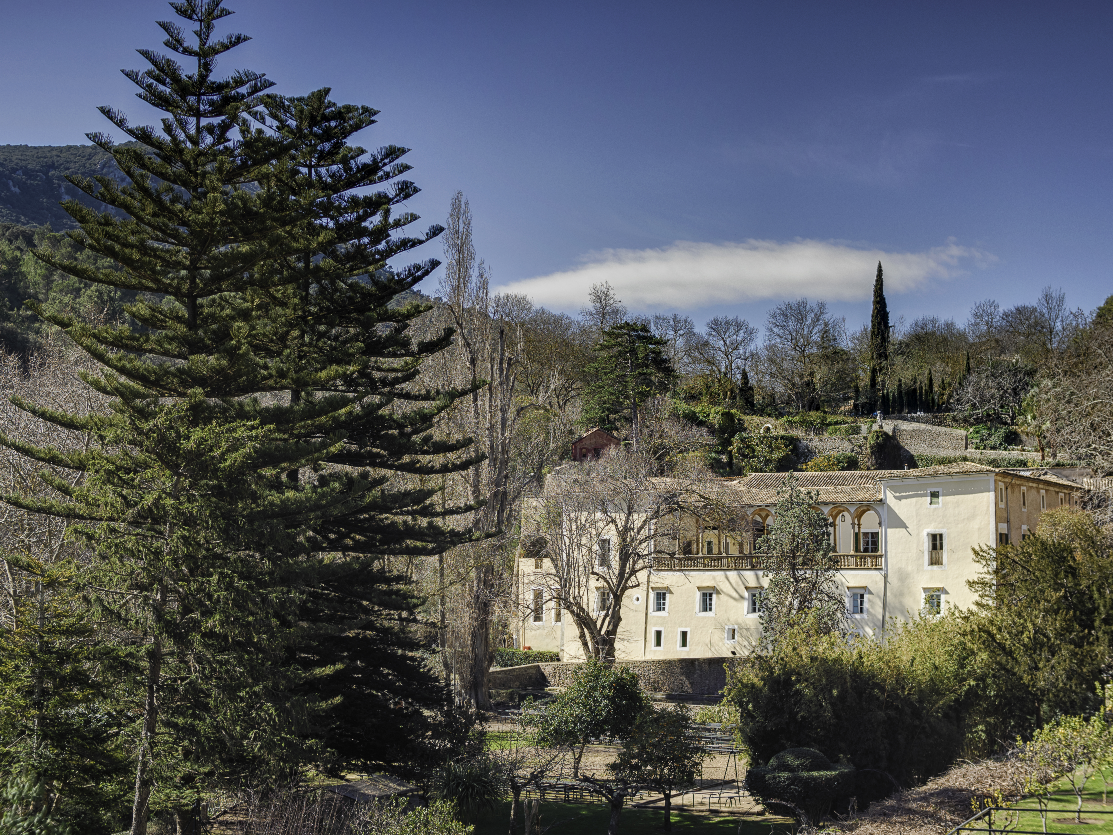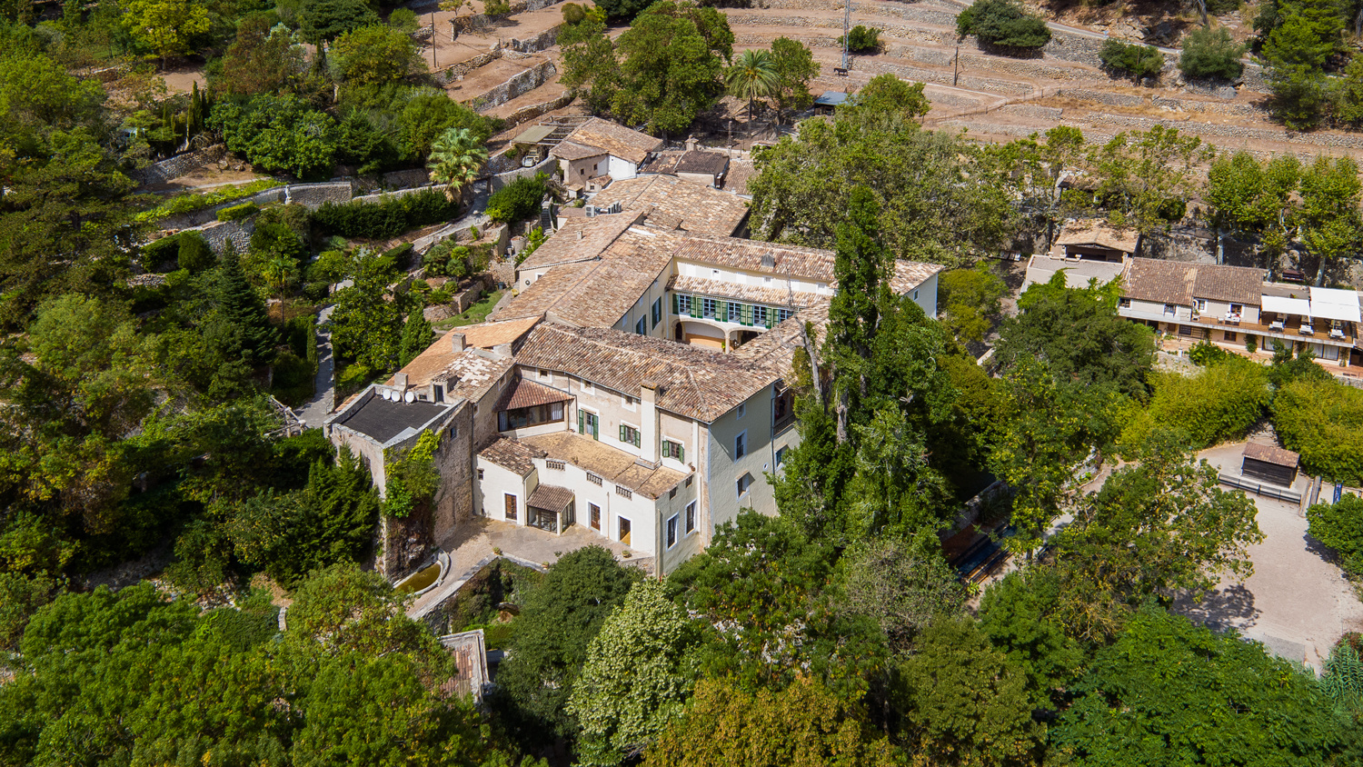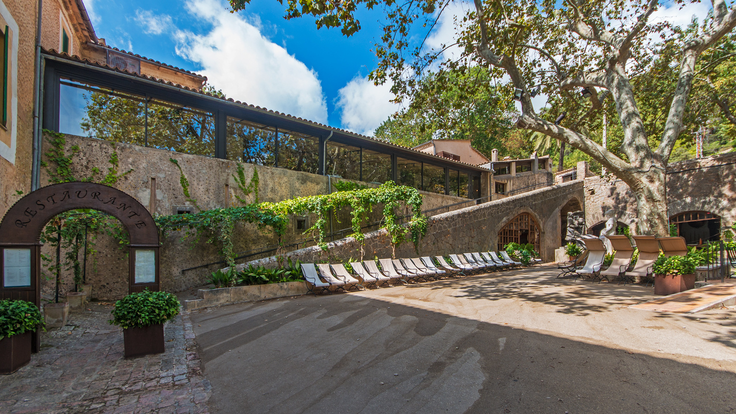 The exterior offers lush gardens with natural waterfalls and a stream running through the typical woodland of the Serra de Tramuntana Mountains.