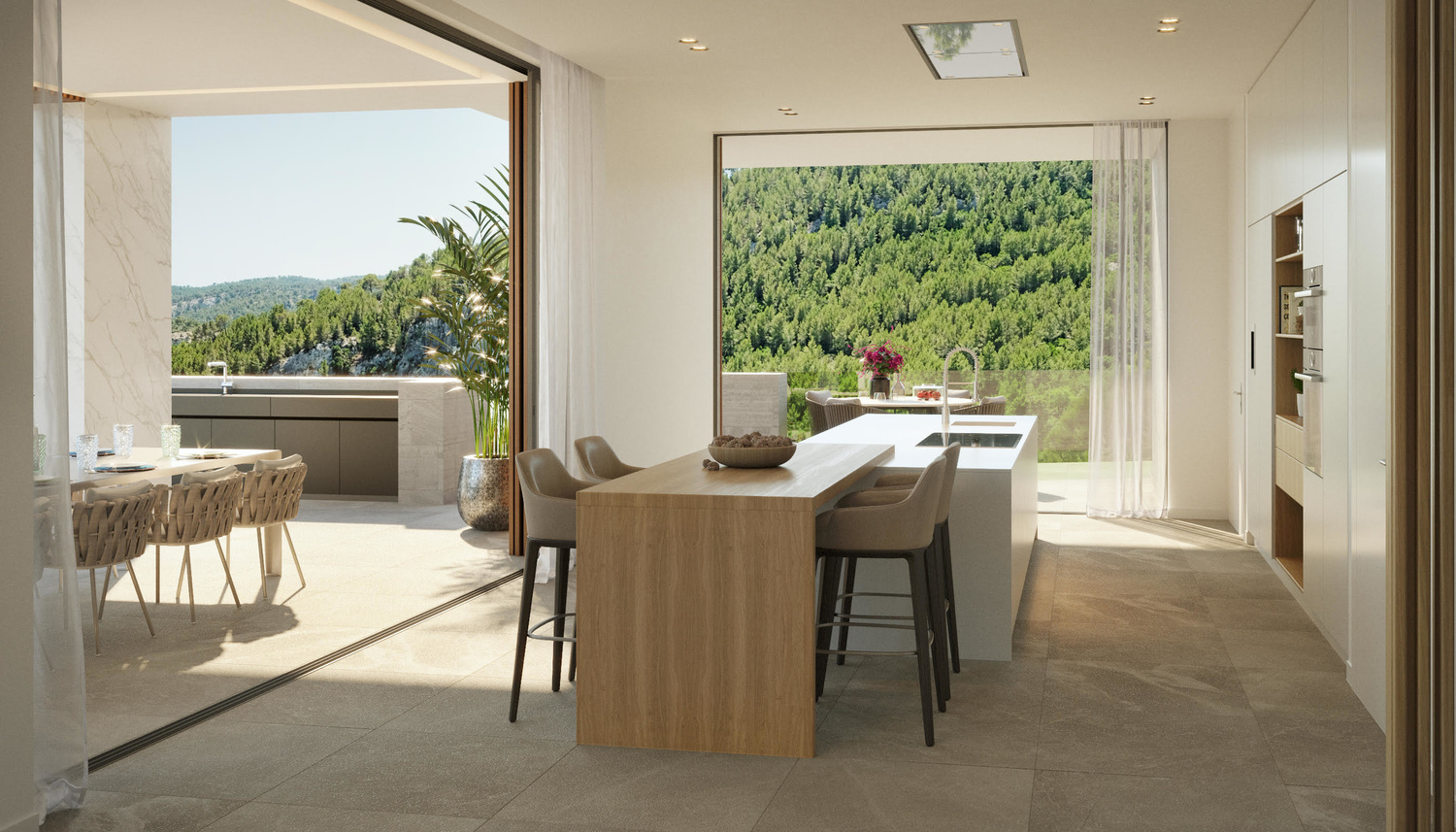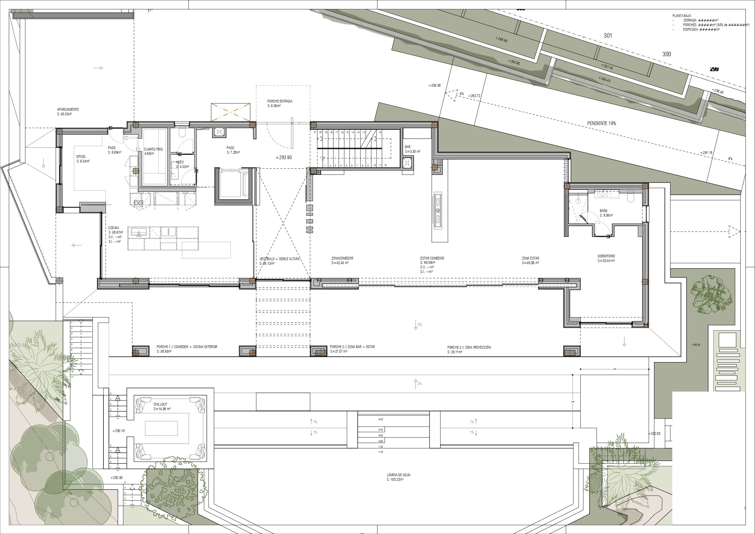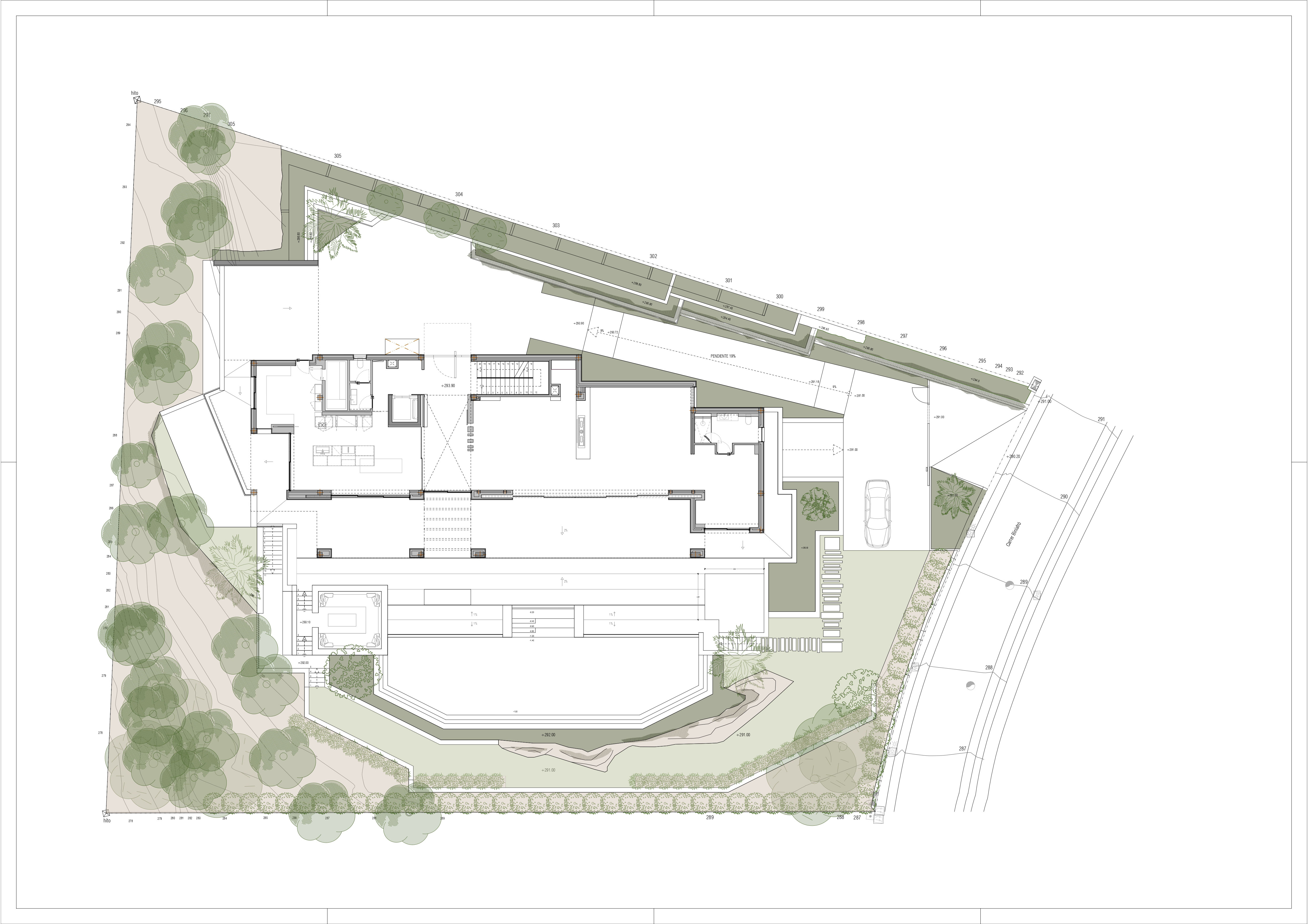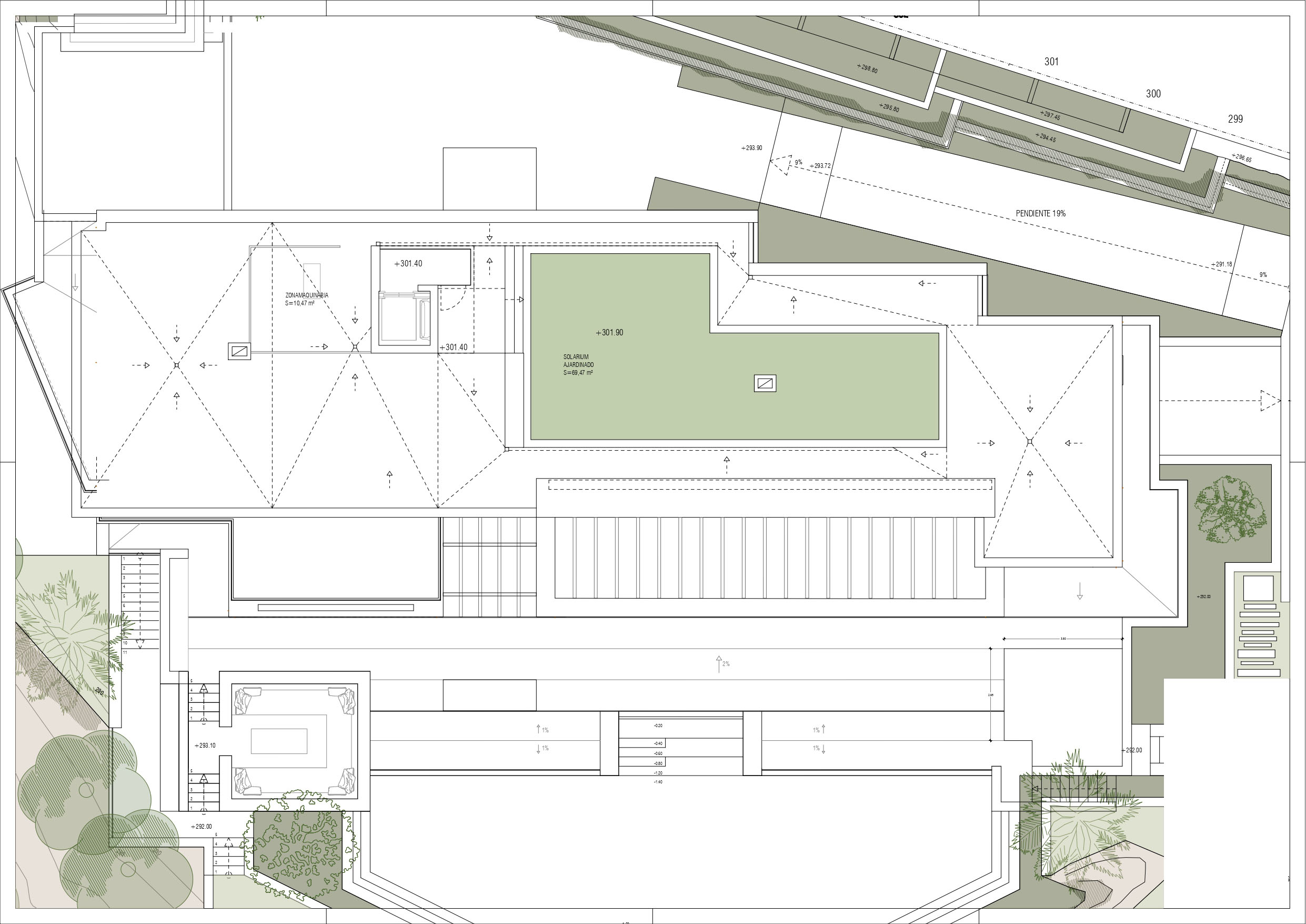 The net living area of 590 m2 plus terraces is distributed over three floors.