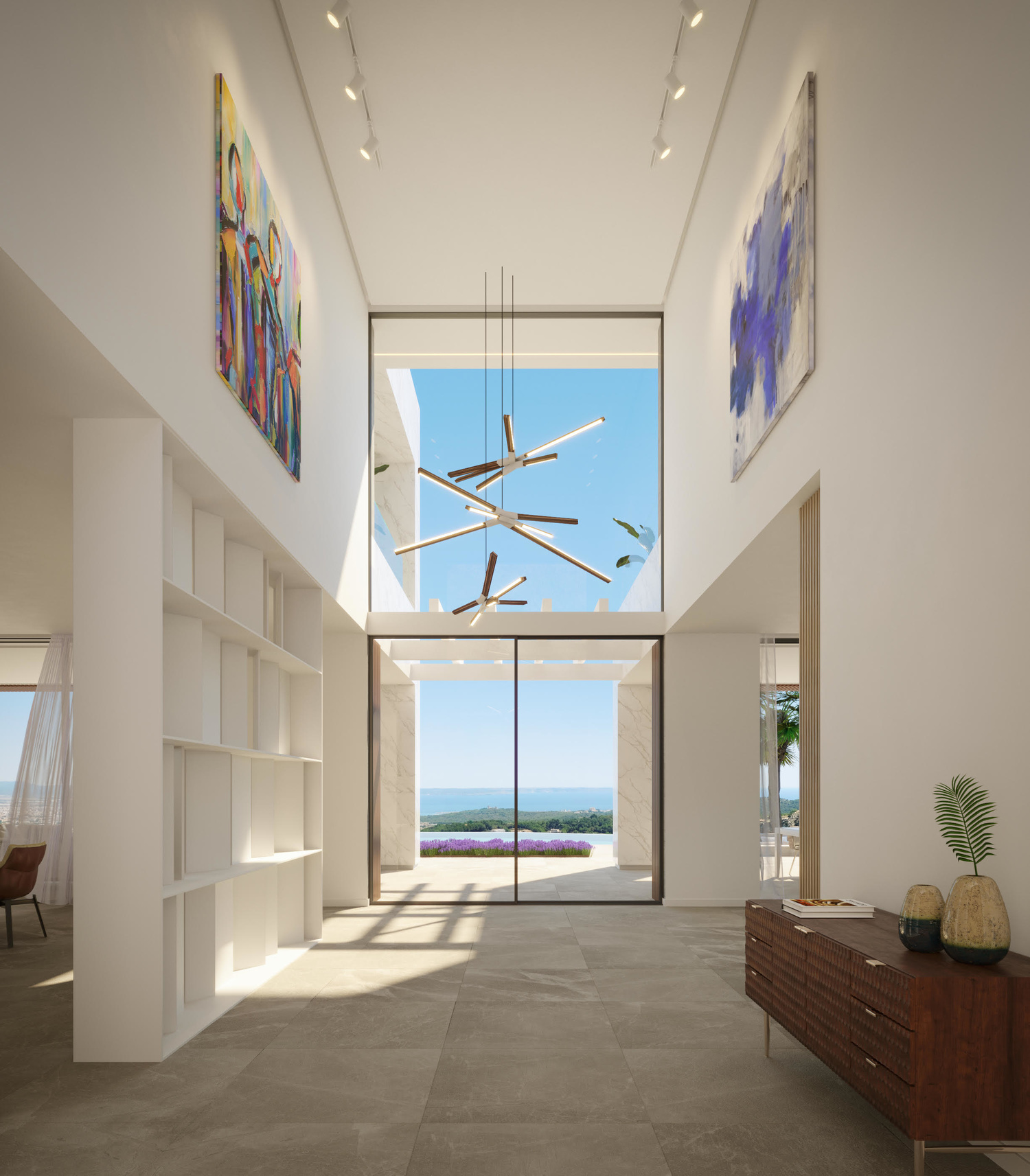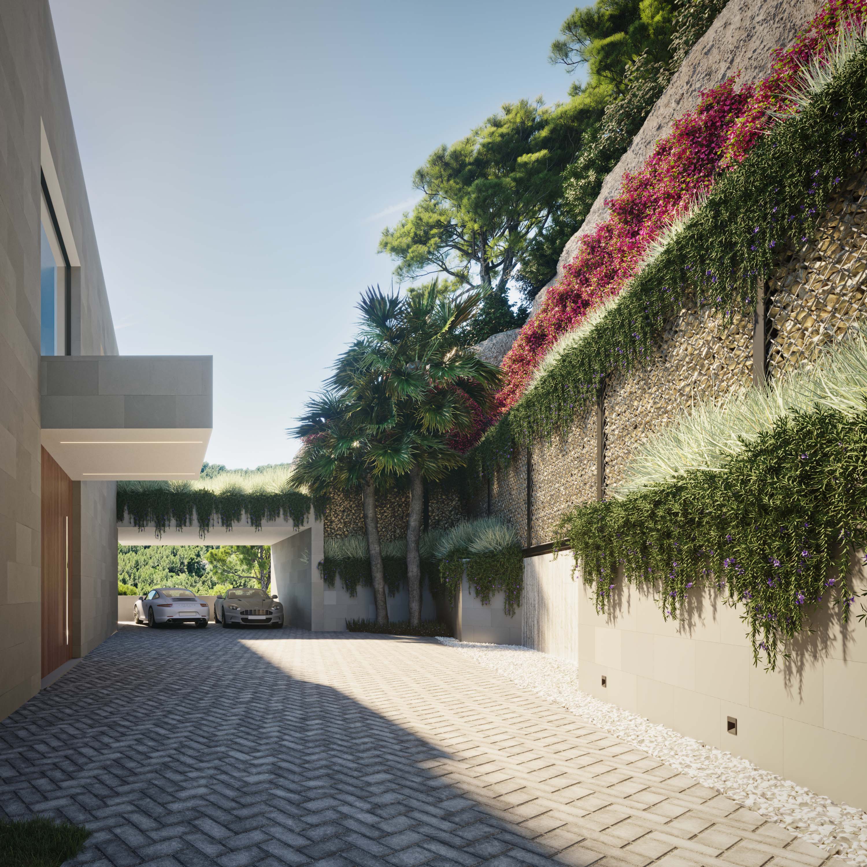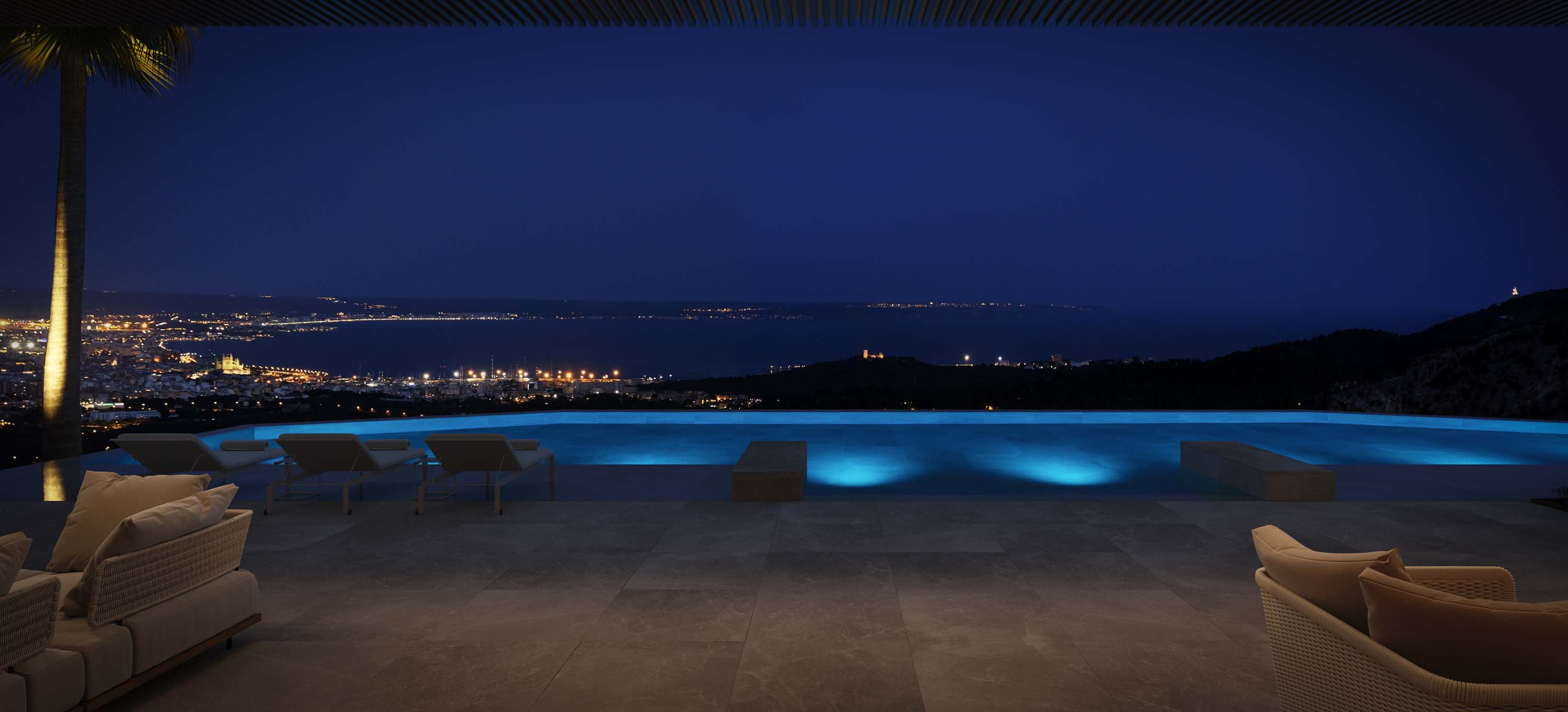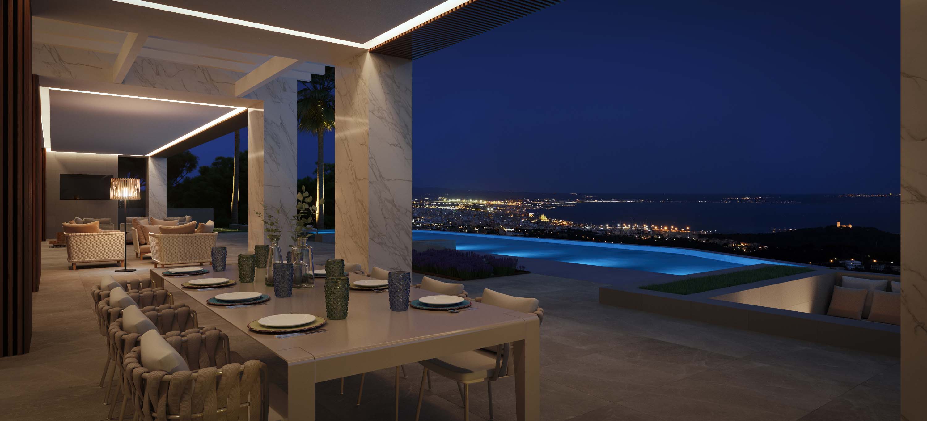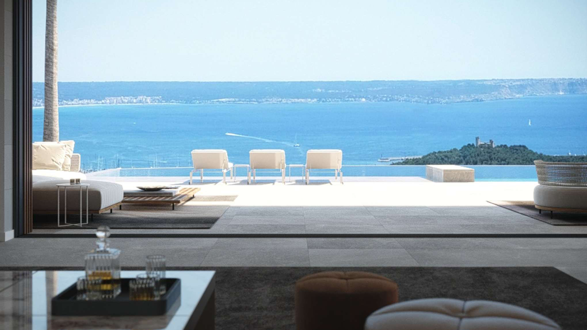 Ground floor: a comfortable access ramp leads to the landscaped main entrance with parking for 2 cars, which gives access to a large double-height distributor. Here you have to stop to contemplate the wonderful views of the entire bay of Palma, and the uniqueness of the property, which allows you to combine the main access, the interior noble areas, a luxurious front porch and a large terrace with its infinity - pool on a single level, all integrated in a modern design and with maximum privacy.