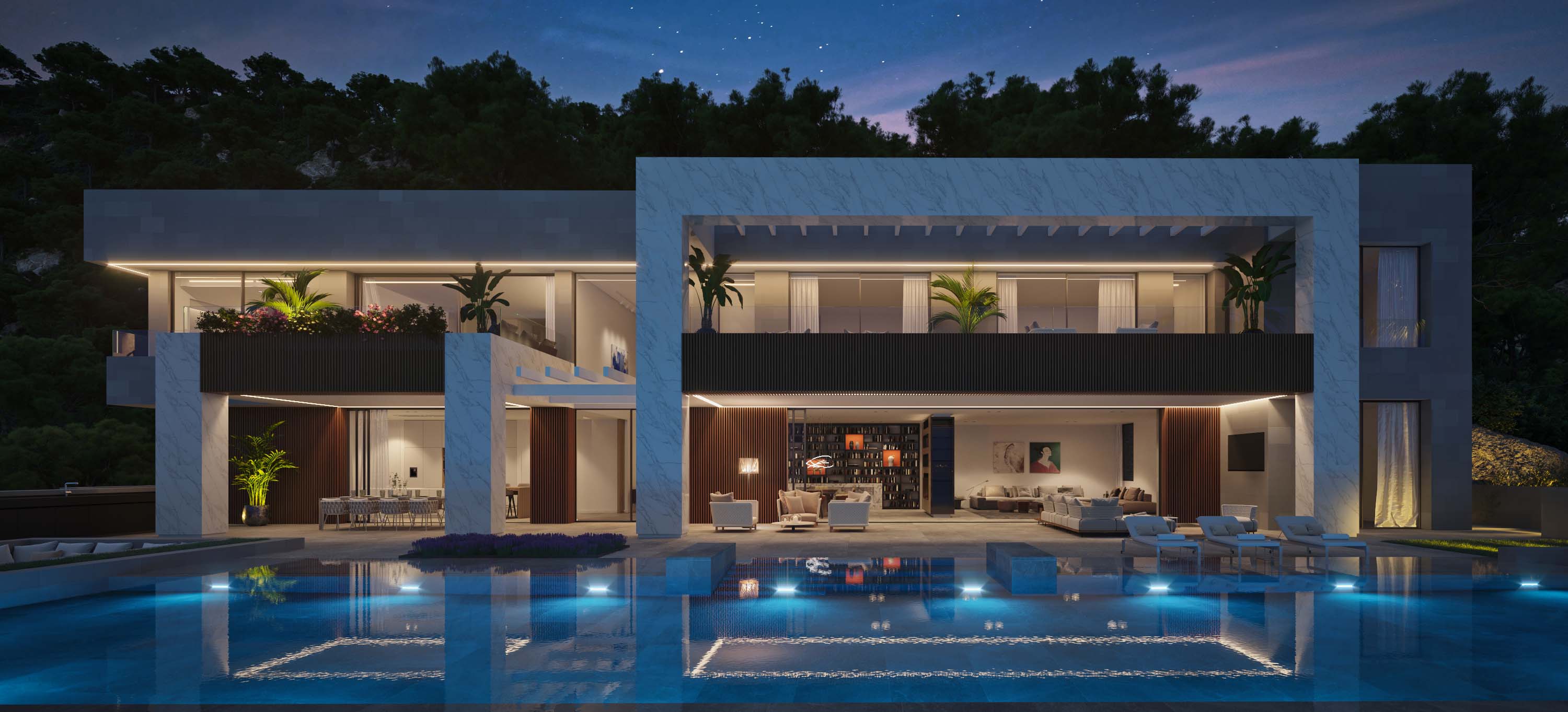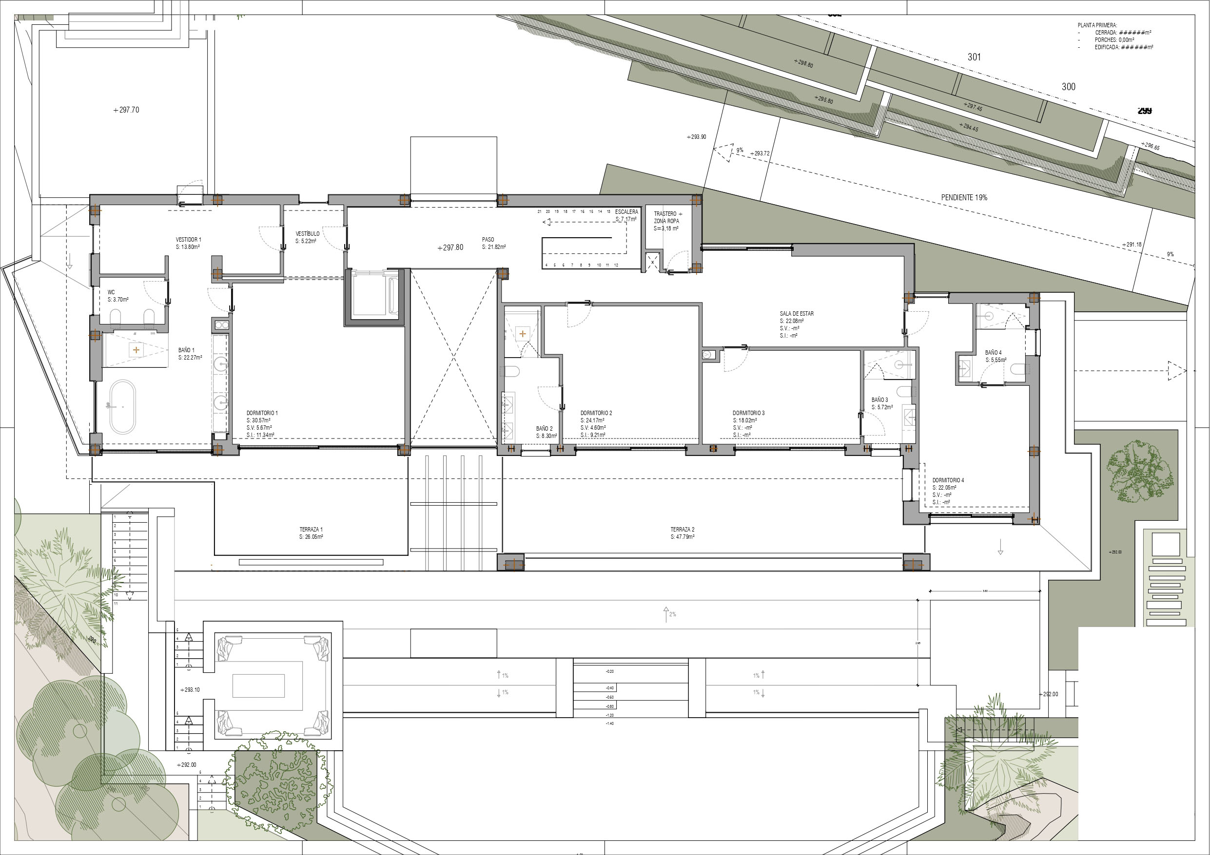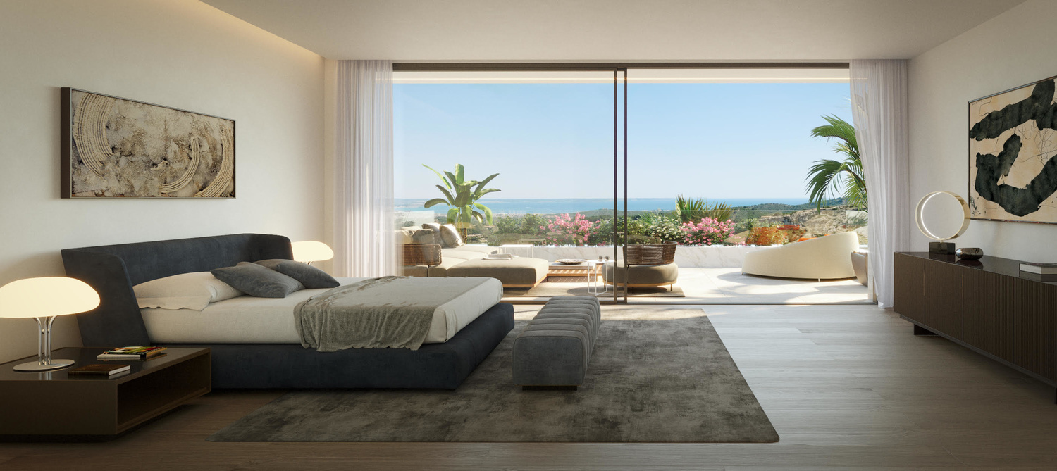 First floor: on one side is the master room with a large dressing room and panoramic bathroom, also a private terrace. There is another guest suite and two identical bedrooms that share a living room, all with en-suite bathrooms and a front terrace.