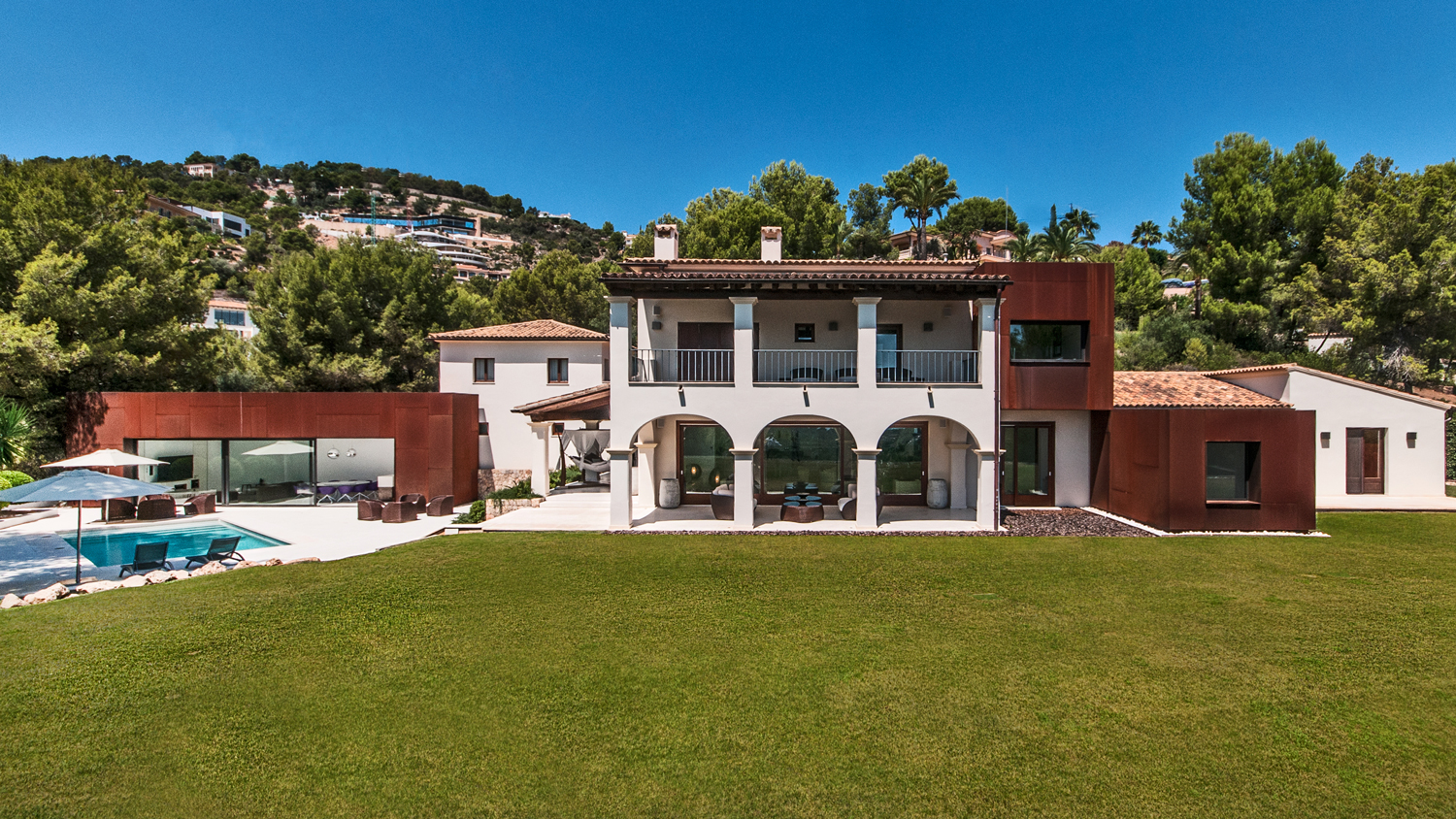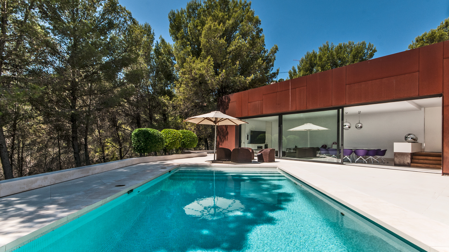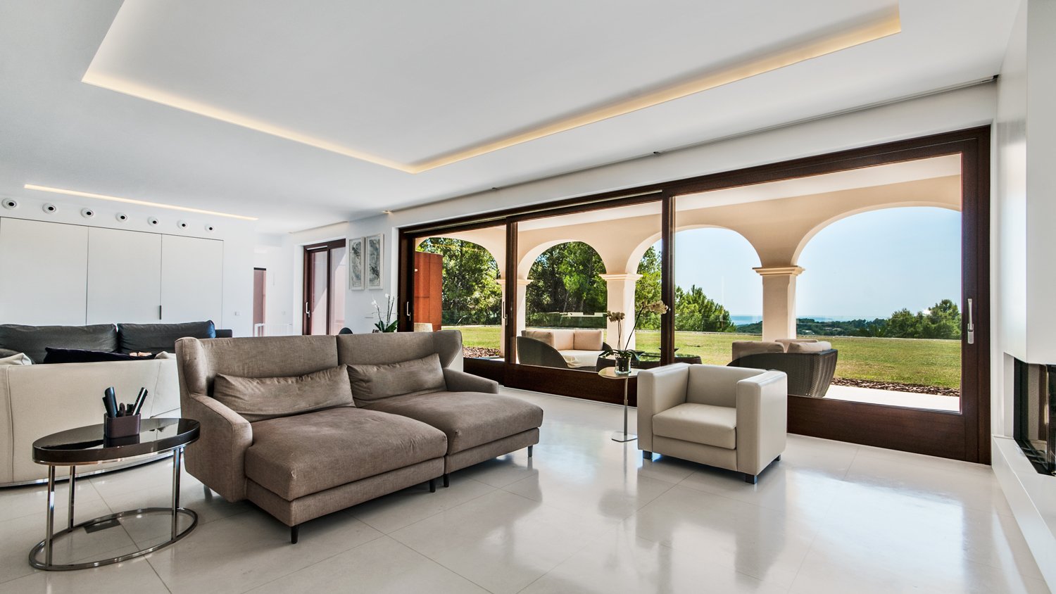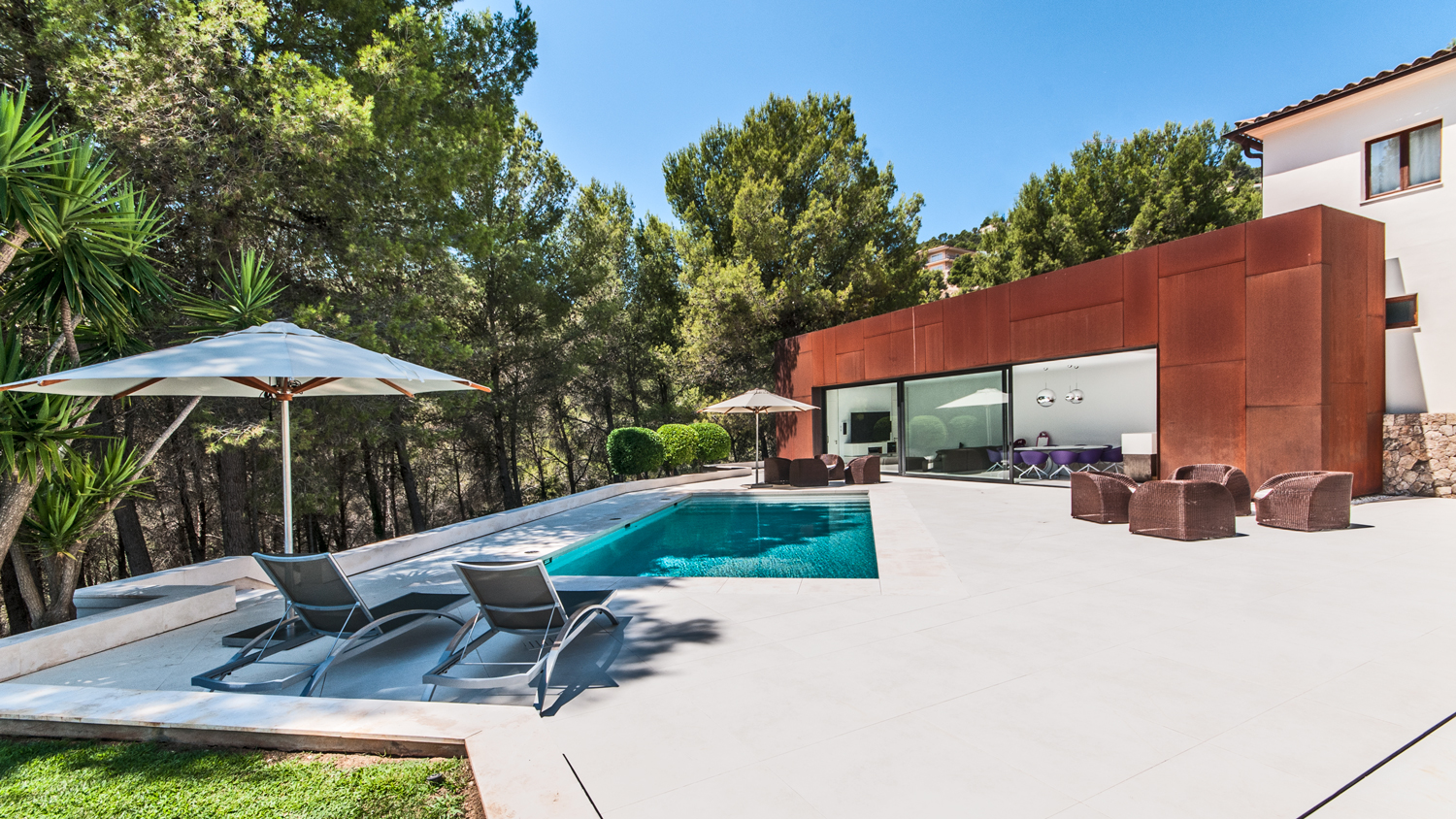 The villa is situated on the largest plot in Son Vida. Inviting open and covered terraces with swimming pool and fantastic views to the bay of Palma.