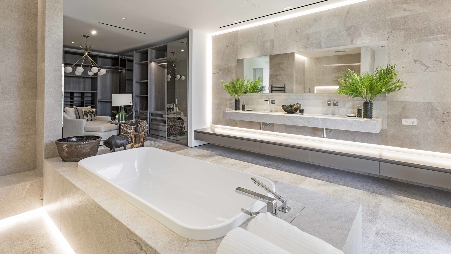 On the second floor is the daily area with double height ceiling in the living room, dining room and lounge, kitchen, guest cloak room and office. On the same level, the swimming pool of about 19 m2. One level further down there is Spa, Wellness and facilities area.