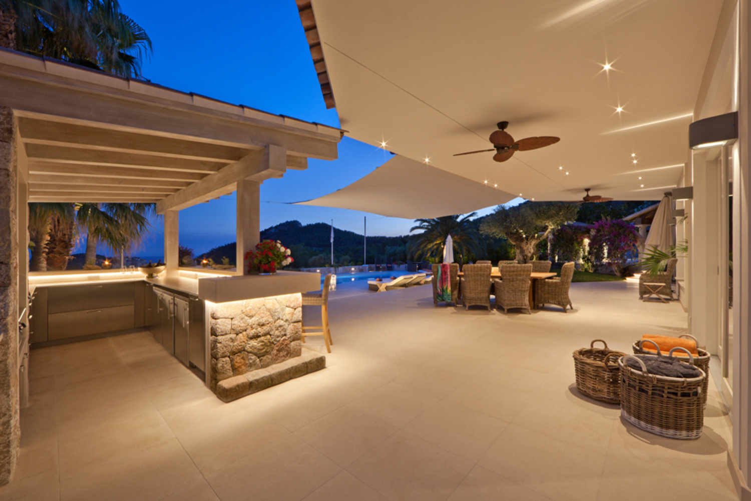 The large, south-west facing heated pool is surrounded by spacious terraces, some of which are covered, as well as lawns and a Mediterranean garden. The large outdoor kitchen with BBQ and outdoor dining area, built in the beach house style, is a wonderful place to linger and after sunset you can spend unforgettable evenings barbecuing while enjoying the wonderful evening lighting of the pool, garden and the wonderful view of the illuminated harbour.