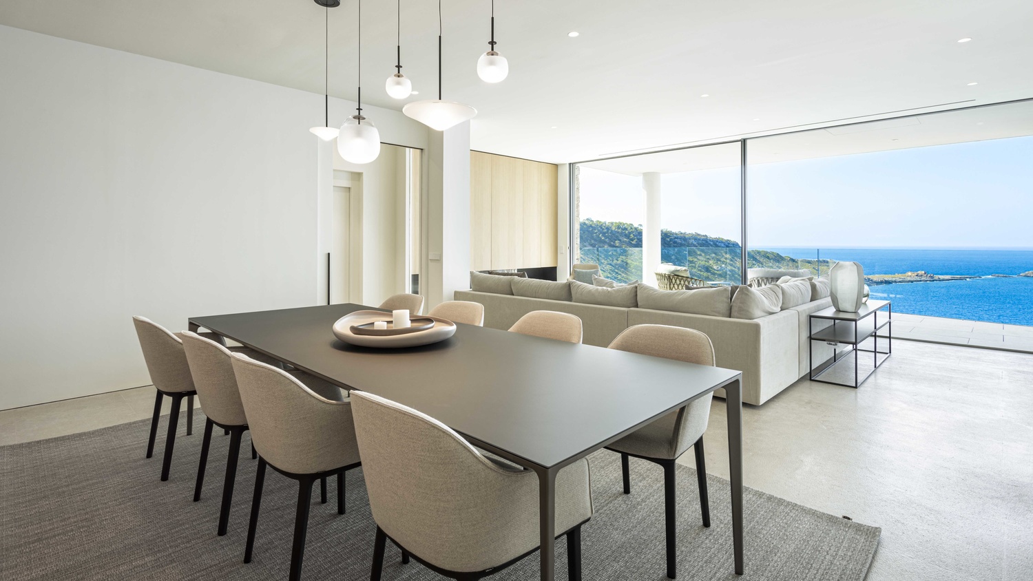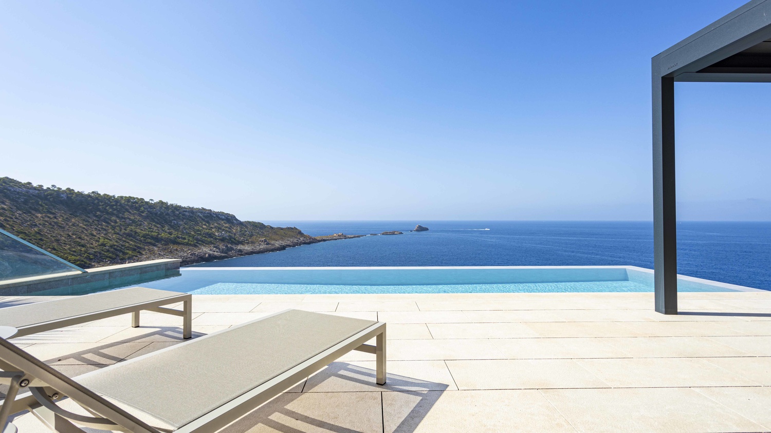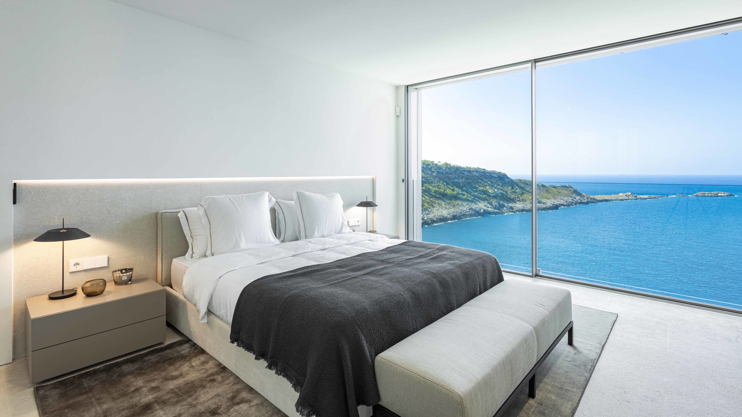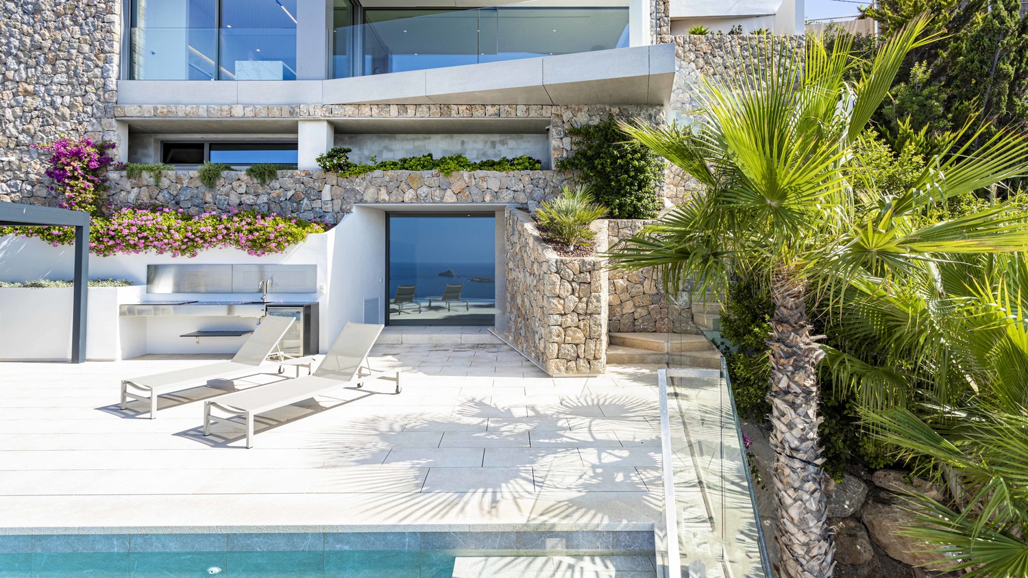 This luxury villa for sale on the first line in Port Adriano has been completed in the summer of 2019 with the latest facilities in home automation, underfloor heating, heat pump, etc. An elevator connects the three floors to the indoor and outdoor pool. This beautiful villa is located at the end of Avenida del Mar just in front of the El Toro Islands and very close to the green zone, which is a very quiet and sunny location.