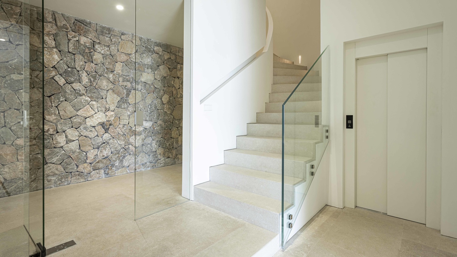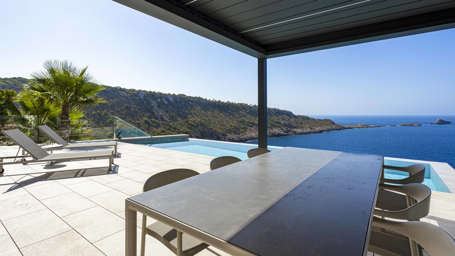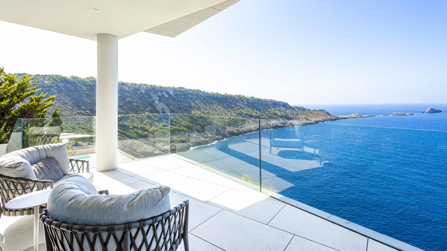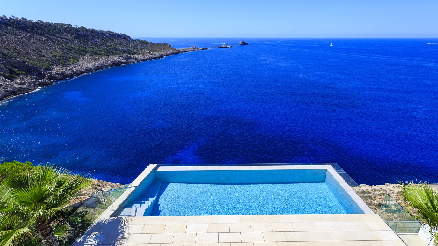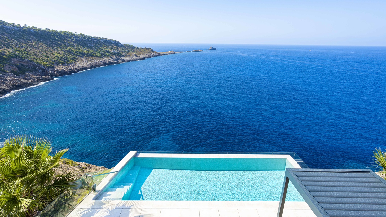This luxury villa for sale on the first line in Port Adriano has been completed in the summer of 2019 with the latest facilities in home automation, underfloor heating, heat pump, etc. An elevator connects the three floors to the indoor and outdoor pool. This beautiful villa is located at the end of Avenida del Mar just in front of the El Toro Islands and very close to the green zone, which is a very quiet and sunny location.