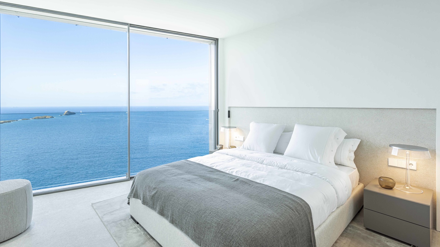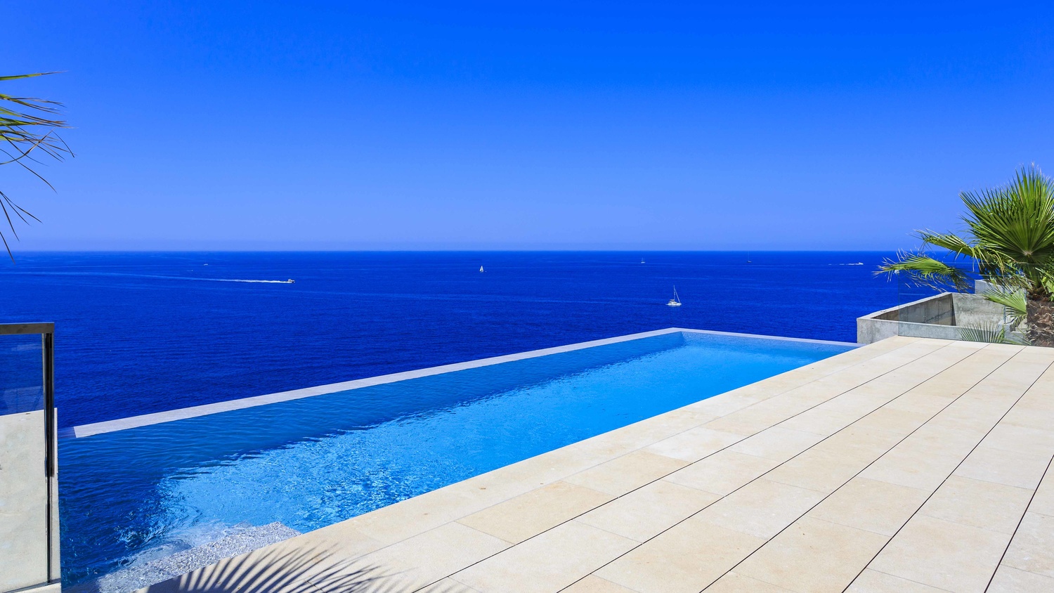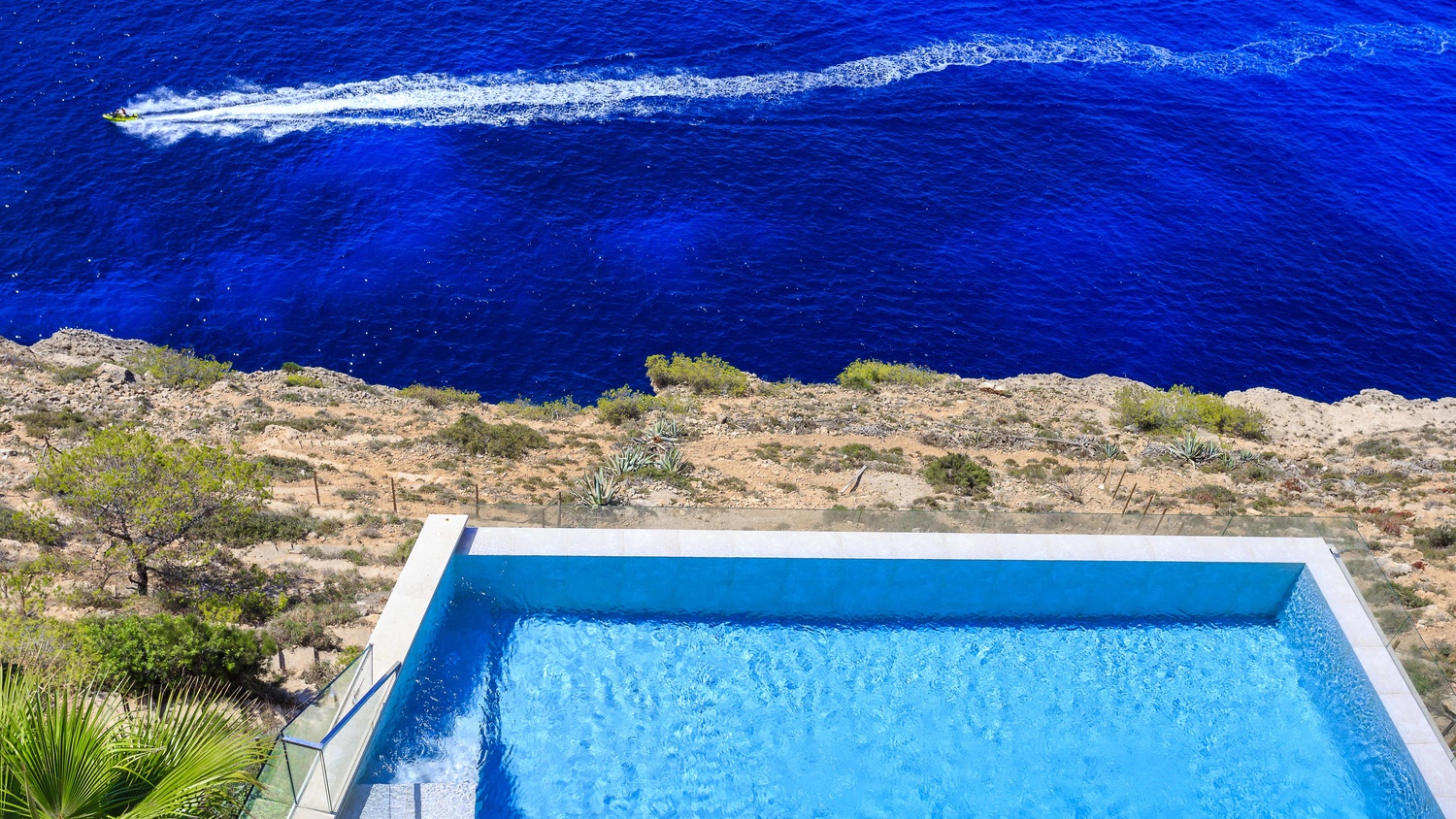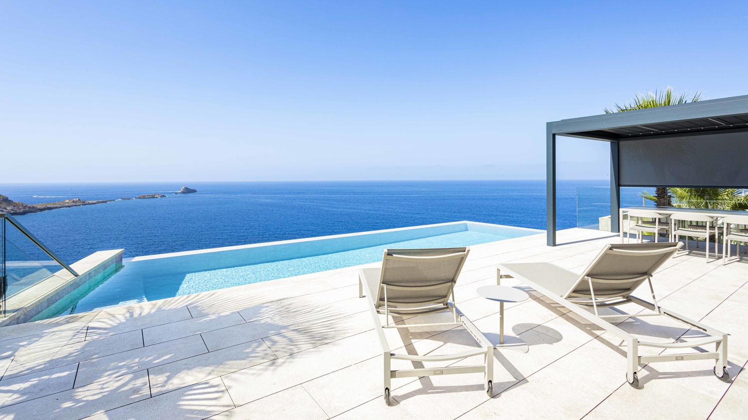 This luxury villa for sale on the first line in Port Adriano has been completed in the summer of 2019 with the latest facilities in home automation, underfloor heating, heat pump, etc. An elevator connects the three floors to the indoor and outdoor pool. This beautiful villa is located at the end of Avenida del Mar just in front of the El Toro Islands and very close to the green zone, which is a very quiet and sunny location.