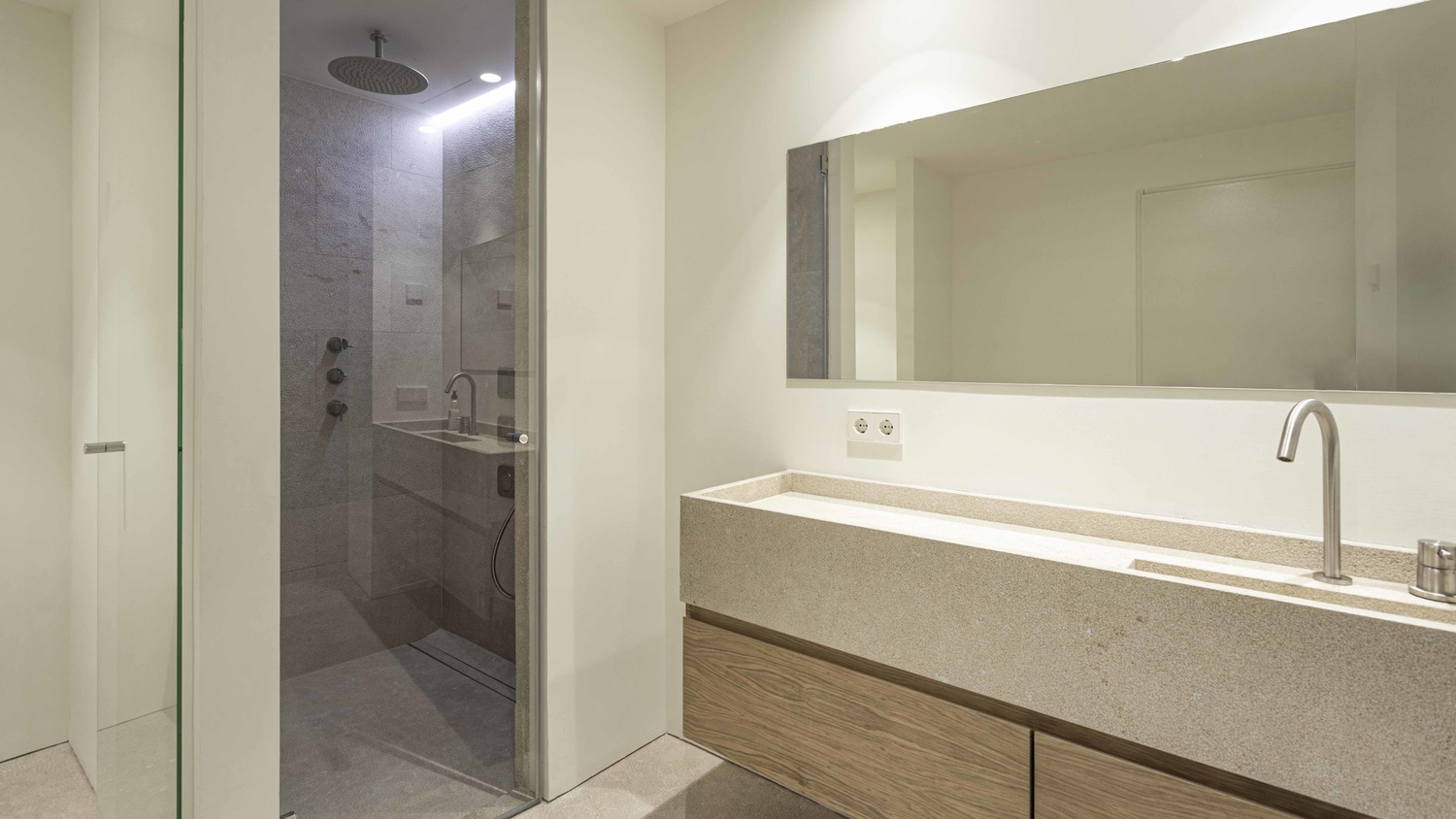 Ground floor: large open space with an open plan kitchen - living - dining room, a guest toilet and a large covered terrace. There is also a support kitchen that leads to a service room with a laundry room and access to a storage room on a lower level.