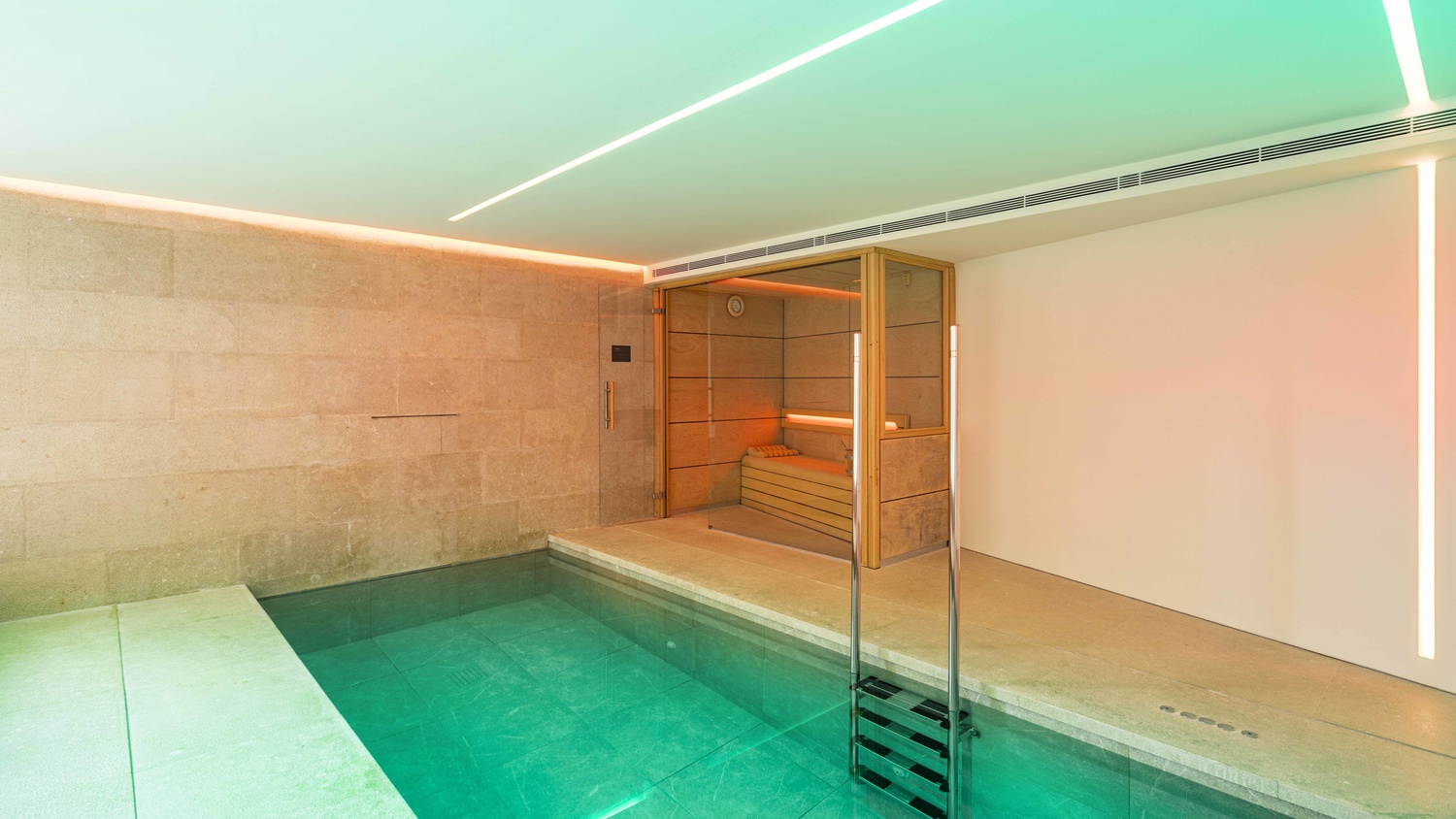 On the lower floor there is a multifunction room with the indoor and outdoor pool and sauna, which could be a porch type lounge for the pool. Under the pool there is another multifunction room that could be either the fifth bedroom or gym, with its small terrace and large windows from which you also enjoy the panoramic sea views. From this level, a path leads to the sea.