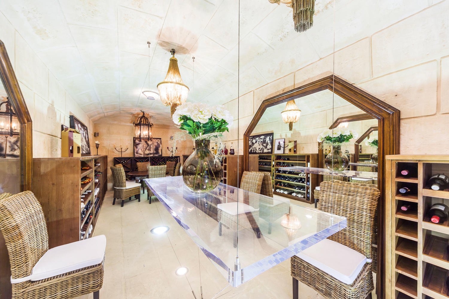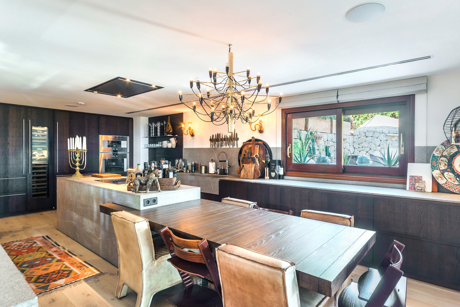 Upon entering the property on the first floor, you are greeted with comfortable hall with double height ceilings, which currently houses a large dining table. On one side, through a short hallway you enter the Italian designer kitchen, which has been custom made for this property and features the best appliances on the market, such as Sub Zero, and Gaggenau. The kitchen opens to the main living area, which features double height ceilings, large open fireplace and leads directly to a large covered terrace with a comfortable dining table for up to 20 guests. On this level, there is also a large guest bedroom, with bathroom en suite and private access to the pool area. Comfortable laundry room and a guest cloak room.