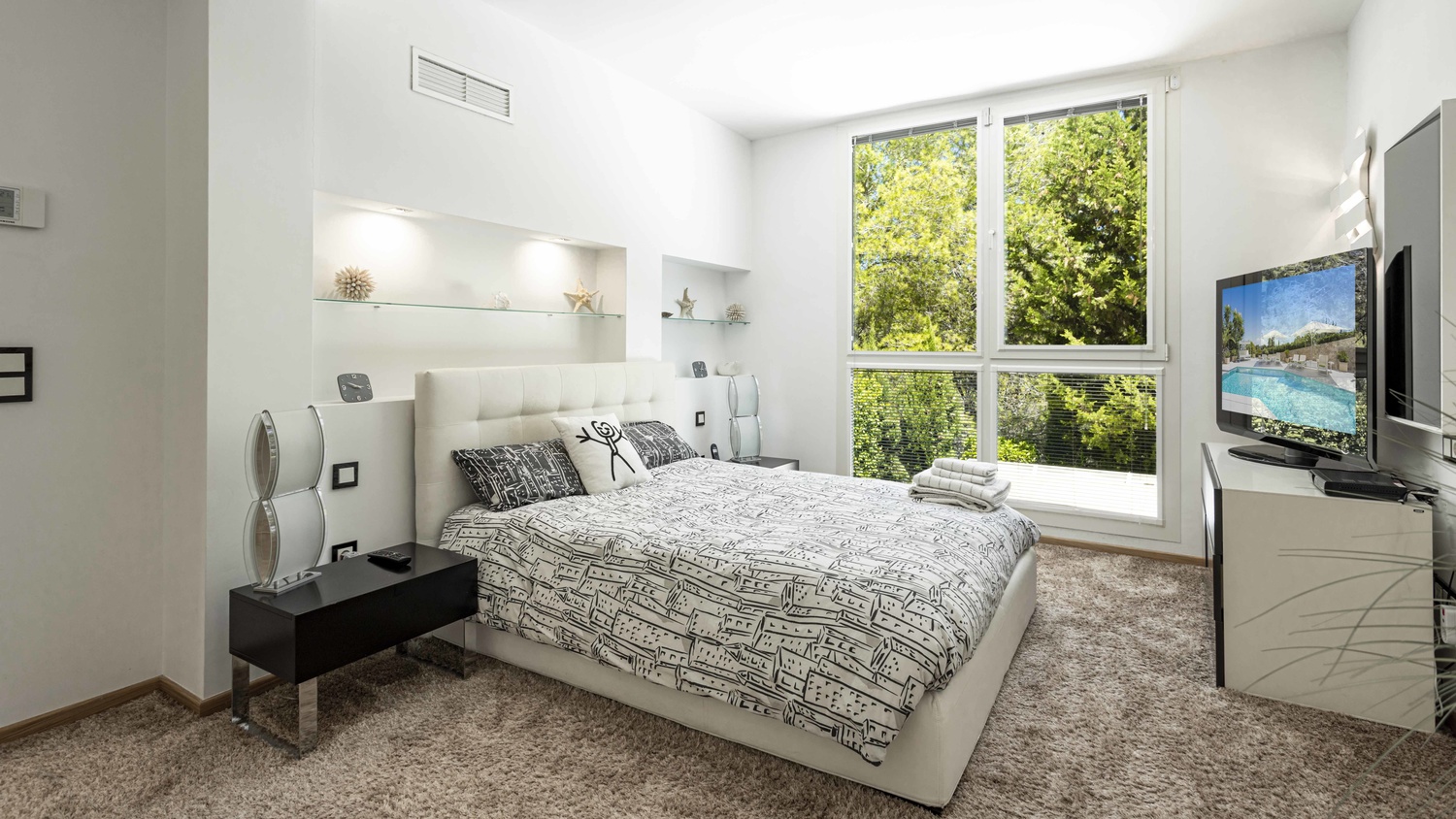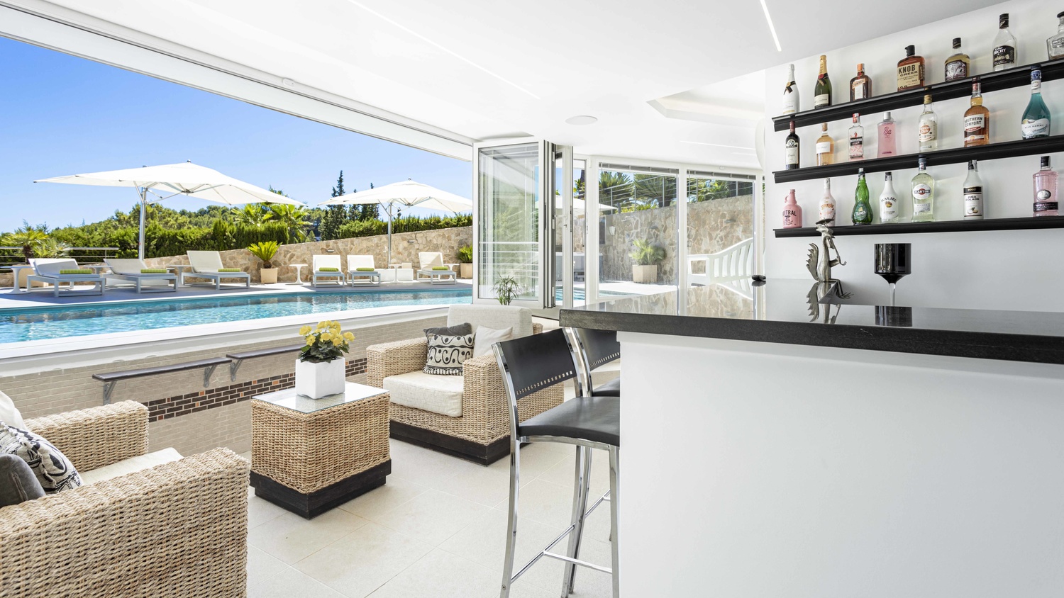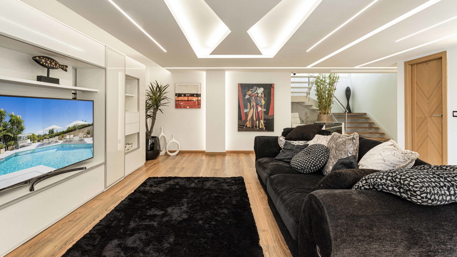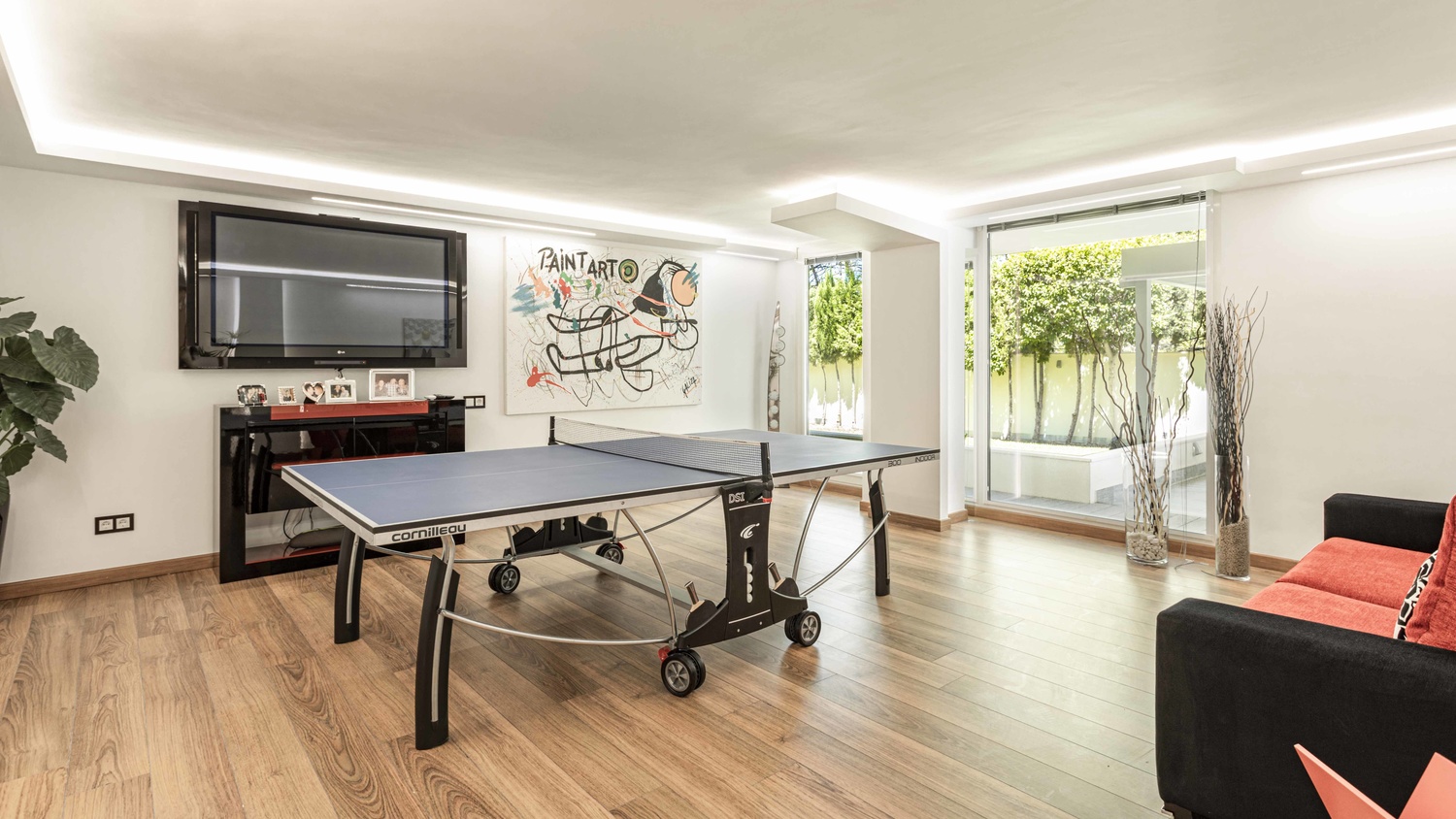 When you move downstairs there is another living area/TV room and guest WC. Move to the left side and you will find two additional bedrooms, again complete with ensuite bathrooms, a utility room and a games room. On the other side is a bar and sauna which opens out to the pool area. The pool and its terrace have just been entirely retiled and now enjoy inset lighting and a jacuzzi. The pool has heating for cooler months. What becomes most apparent is that these spaces still enjoy lots of light as they have floor-to-ceiling windows. The basement level is effectively the ground floor. It has not been constructed underground seeing as the entrance level is one storey above.
