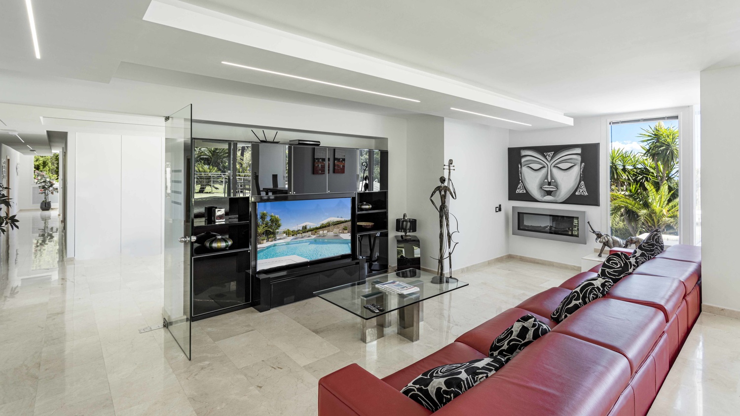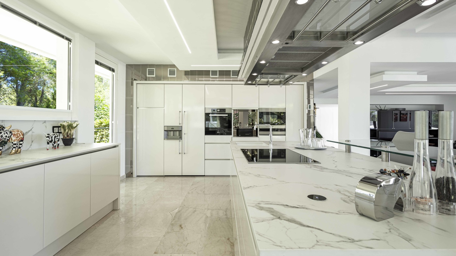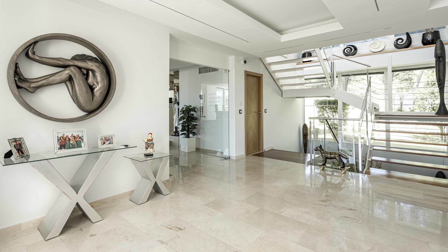 First impressions are excellent as you step in. Turning left on the entrance level will bring you to a very large, open plan living-dining area with a newly installed kitchen. This is complete with high end German brand appliances. Floor to ceiling glass panels make the space very luminous. Moving outside you can find a terrace overlooking the pool for al fresco dining as well as numerous other dining areas dotted around. There is a generous amount of lawn area meaning the villa would cater well to families or pet lovers. Also located on this floor is a guest WC and three generously sized bedrooms all complete with ensuite bathrooms. There is also a well-proportioned office which could become an additional bedroom if required.