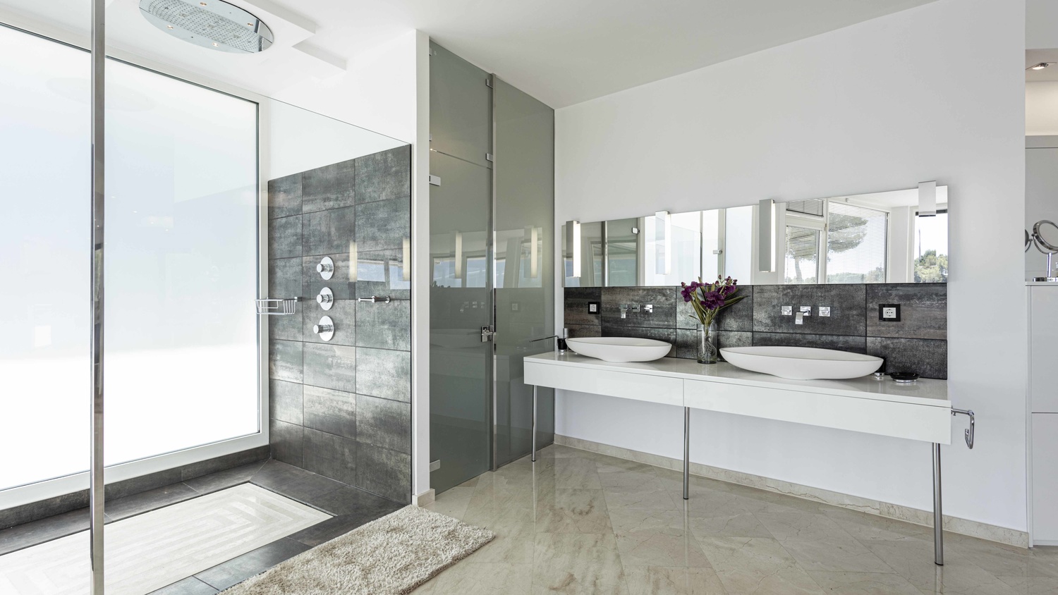 The upper floor is split between a TV room and a very large master suite which enjoys views across the golf and towards Palma. Another stand out feature upstairs is the outdoor terrace which wraps around the entire front of the villa. It enjoys the same enticing view and could be developed into a number of zones.