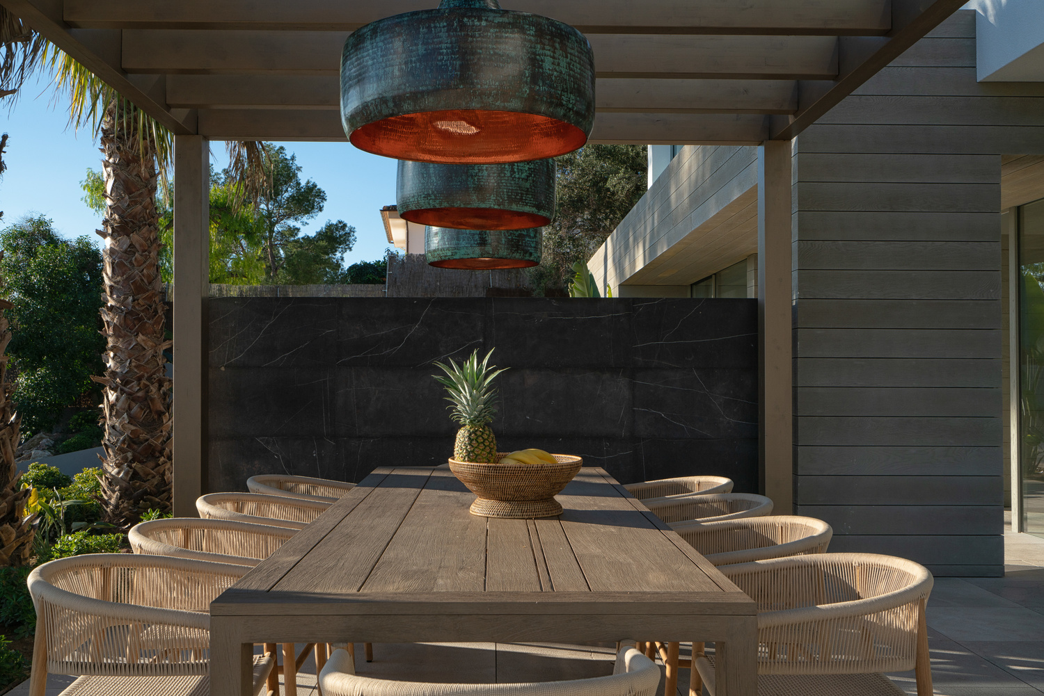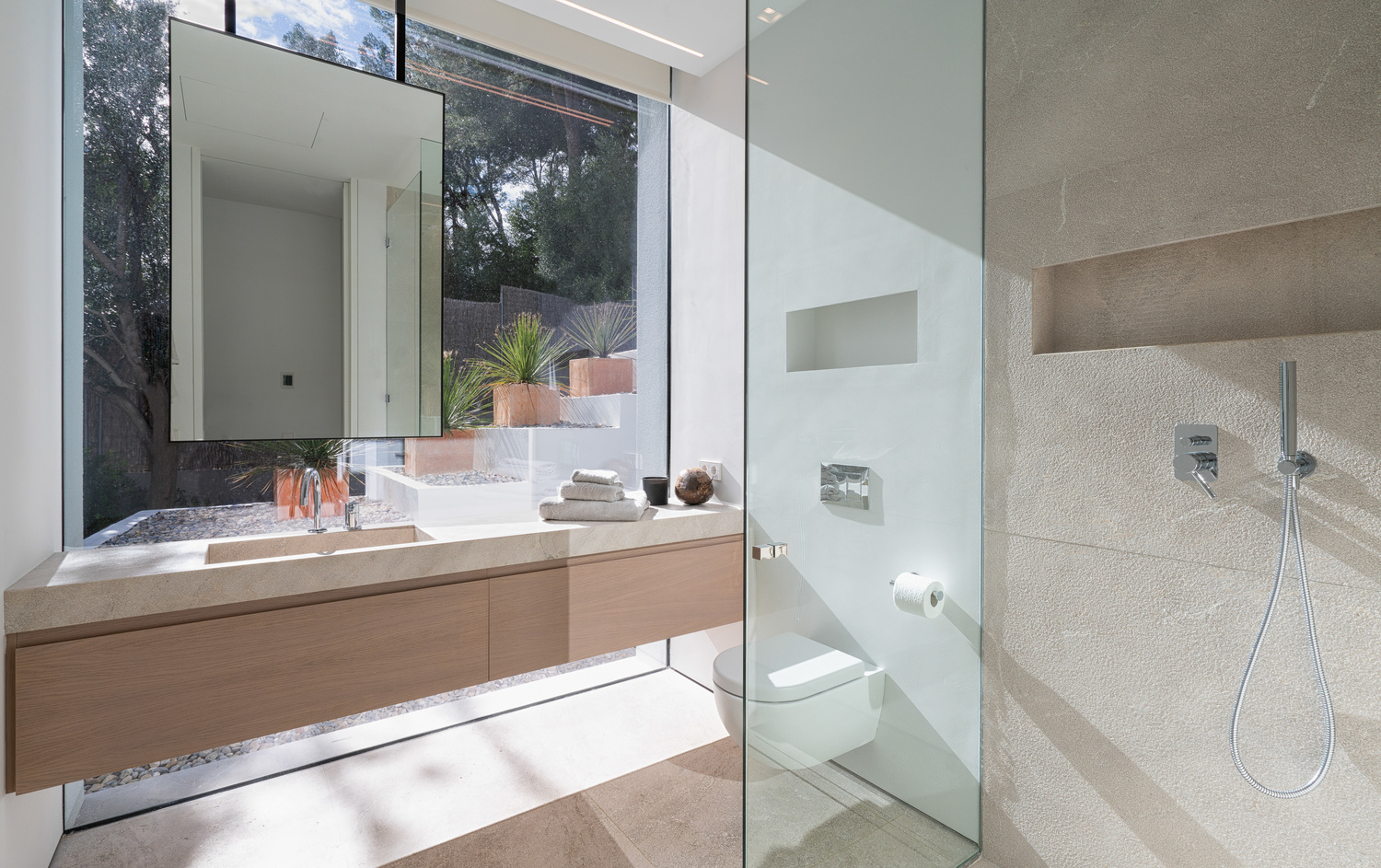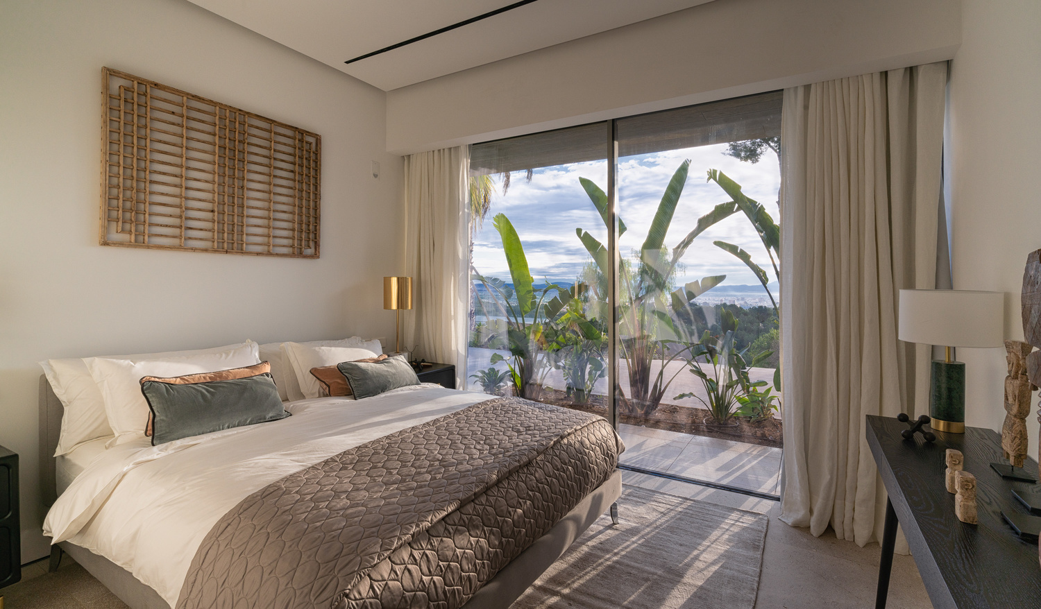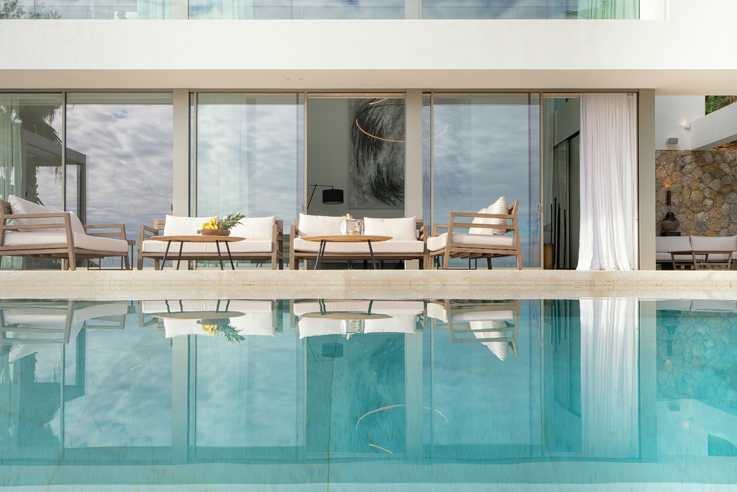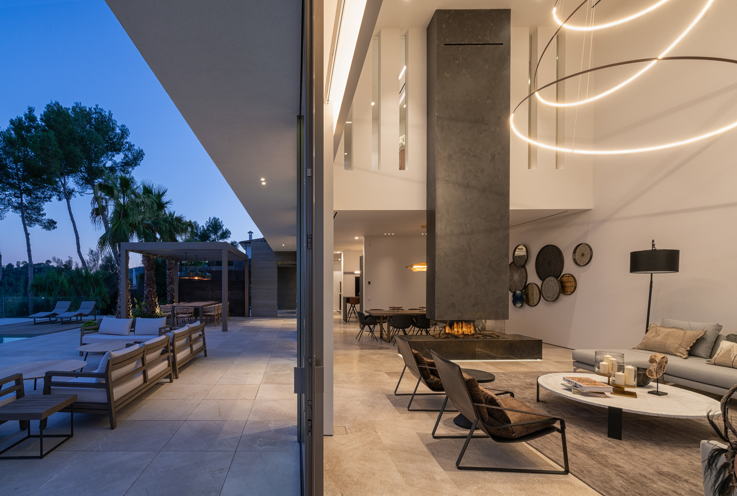 Ground floor: spacious entrance hall with open staircase, open luxury designer kitchen, living room with dining area, open fireplace and direct access to the spacious outdoor area with pool, covered terraces and various chill-out and dining areas. There is also a guest bedroom with bathroom en-suite and a garage for two large cars on this level.