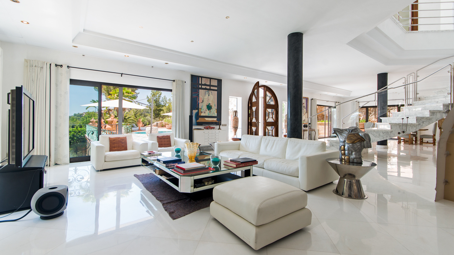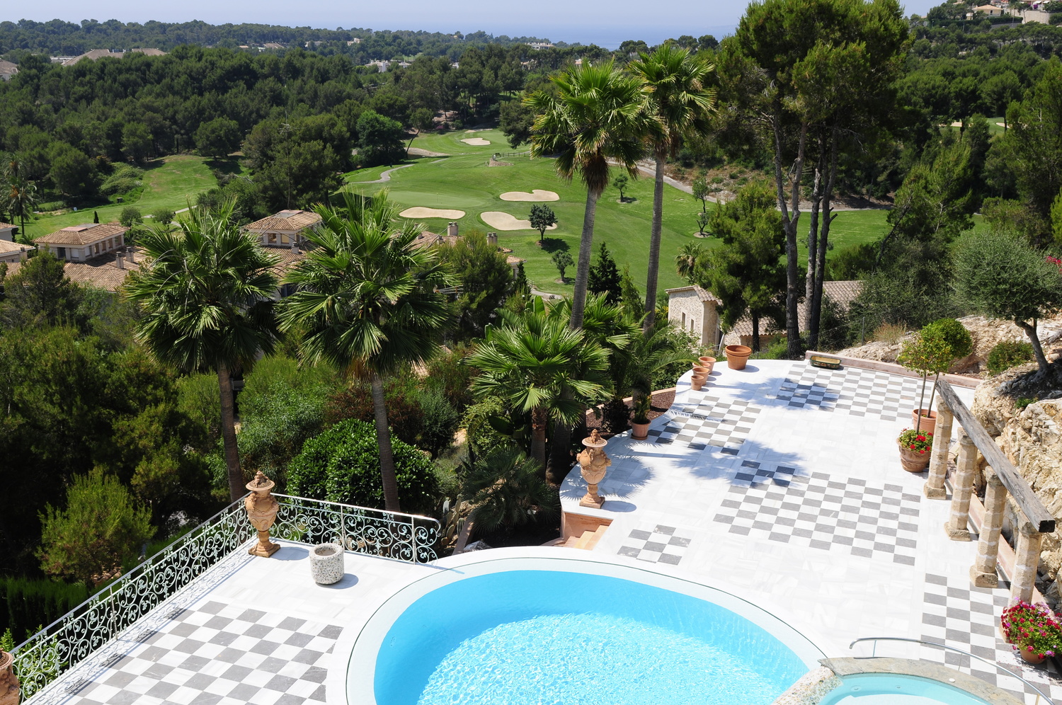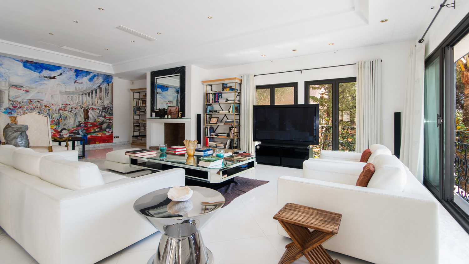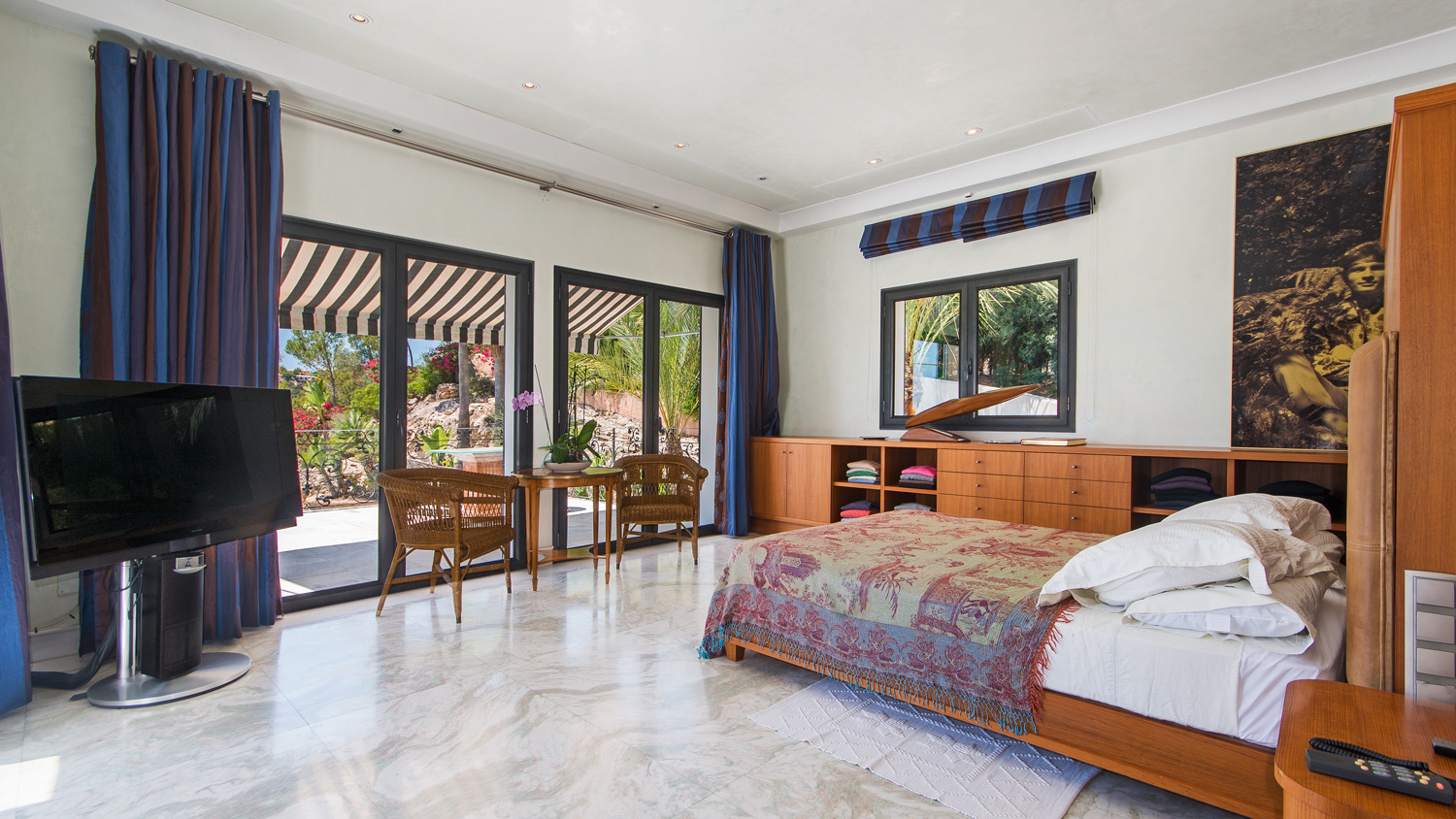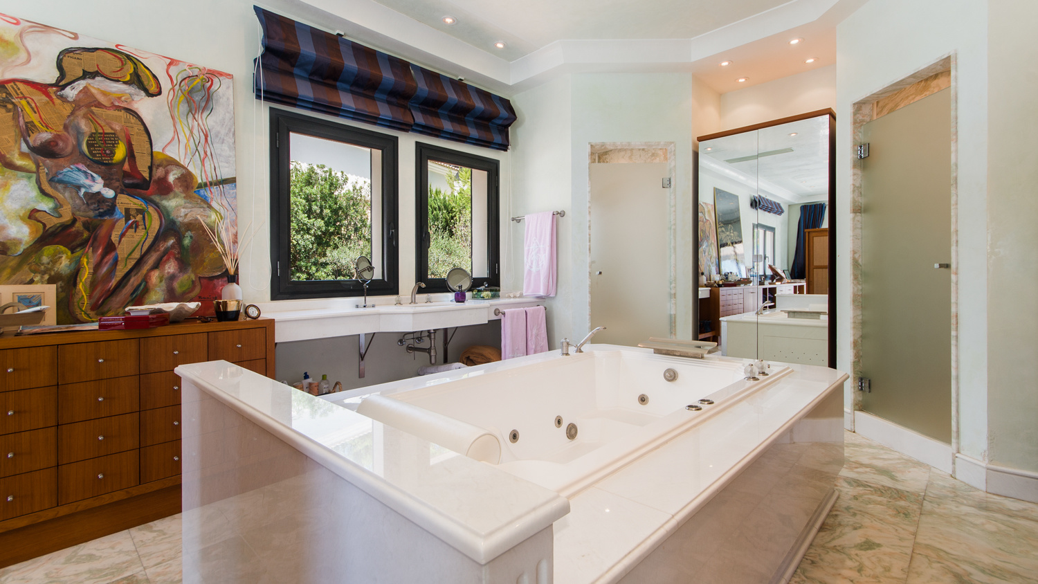 The villa has a very large roof terrace, terraces from the bedrooms, an organic shaped swimming pool with separate Jacuzzi, large open marble clad terrace with barbecue area, a mature Mediterranean garden with palms, bougainvillea and ficus and water features.