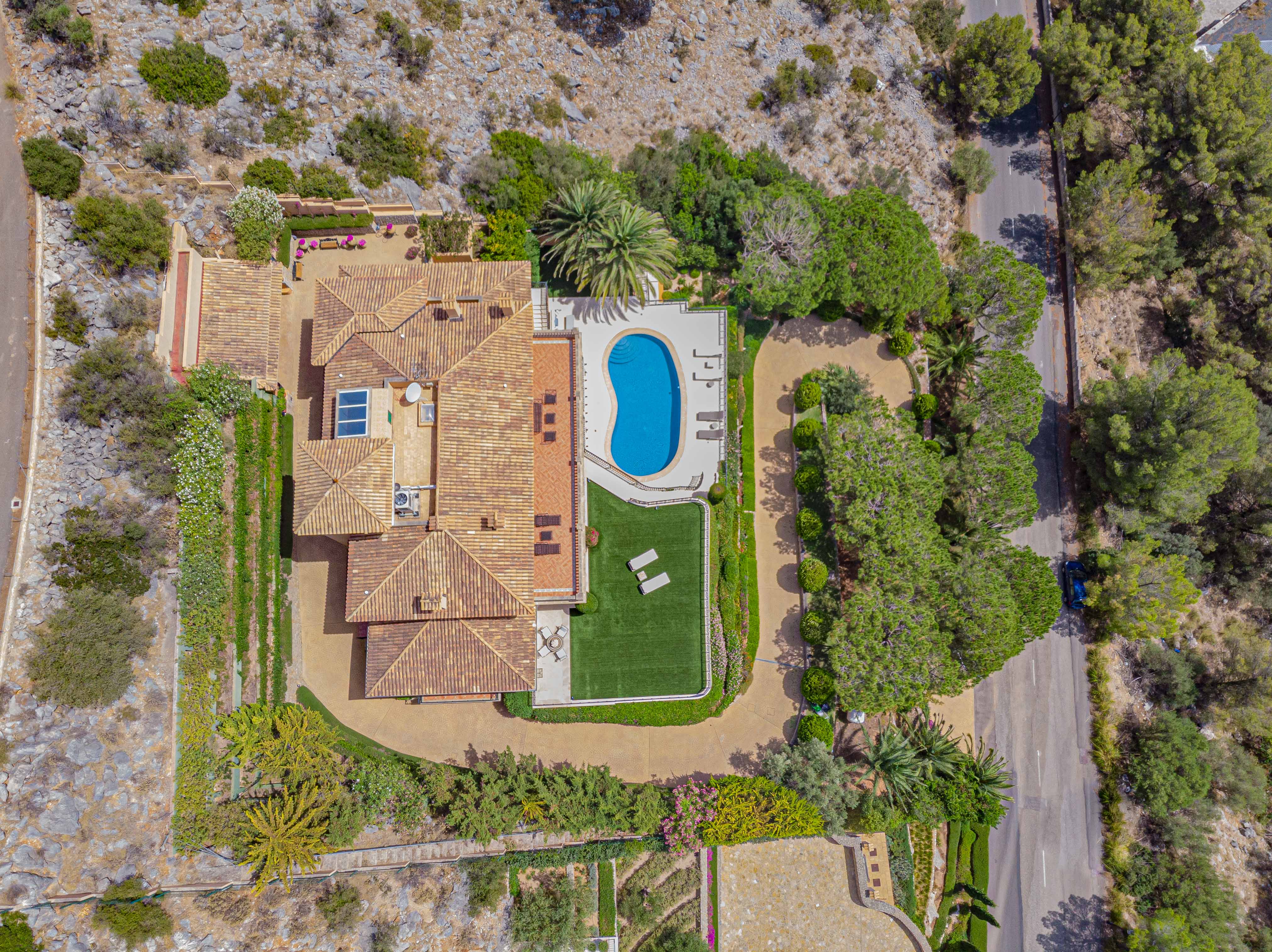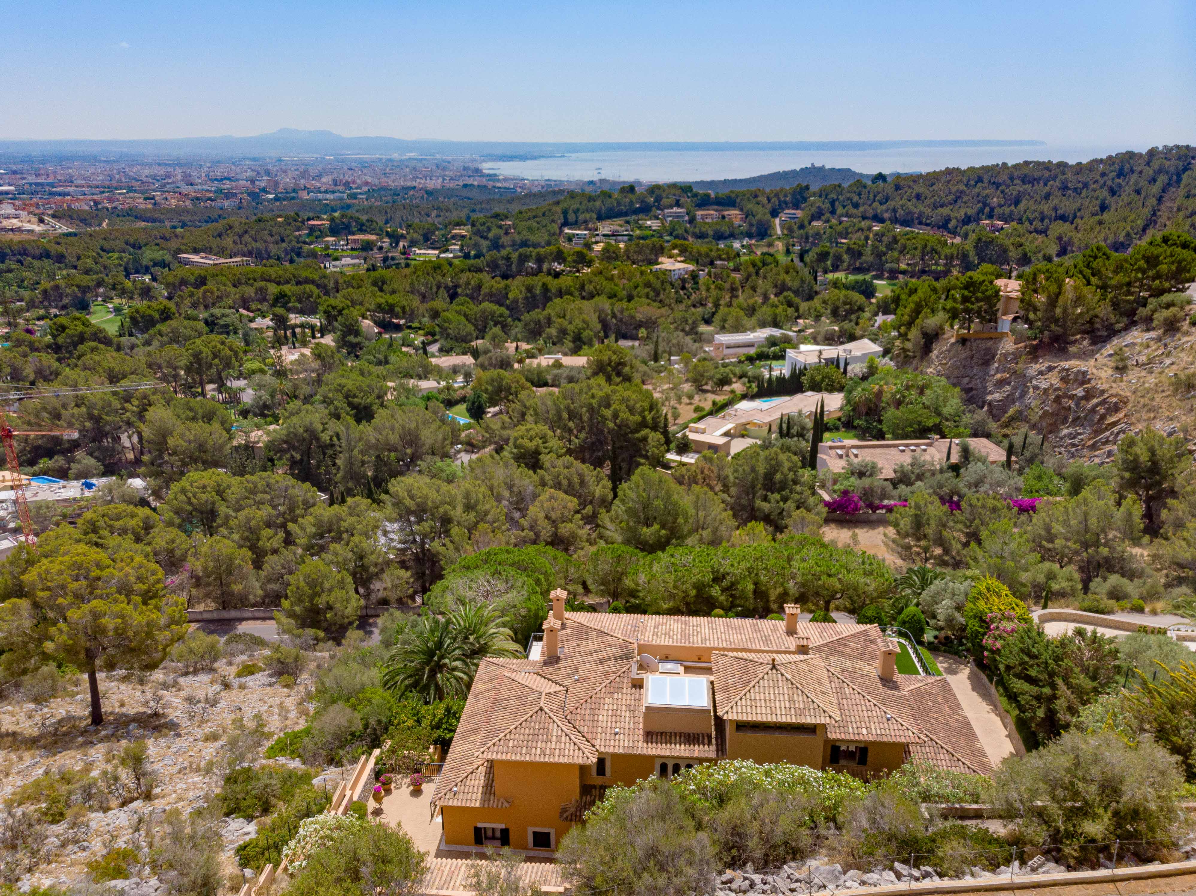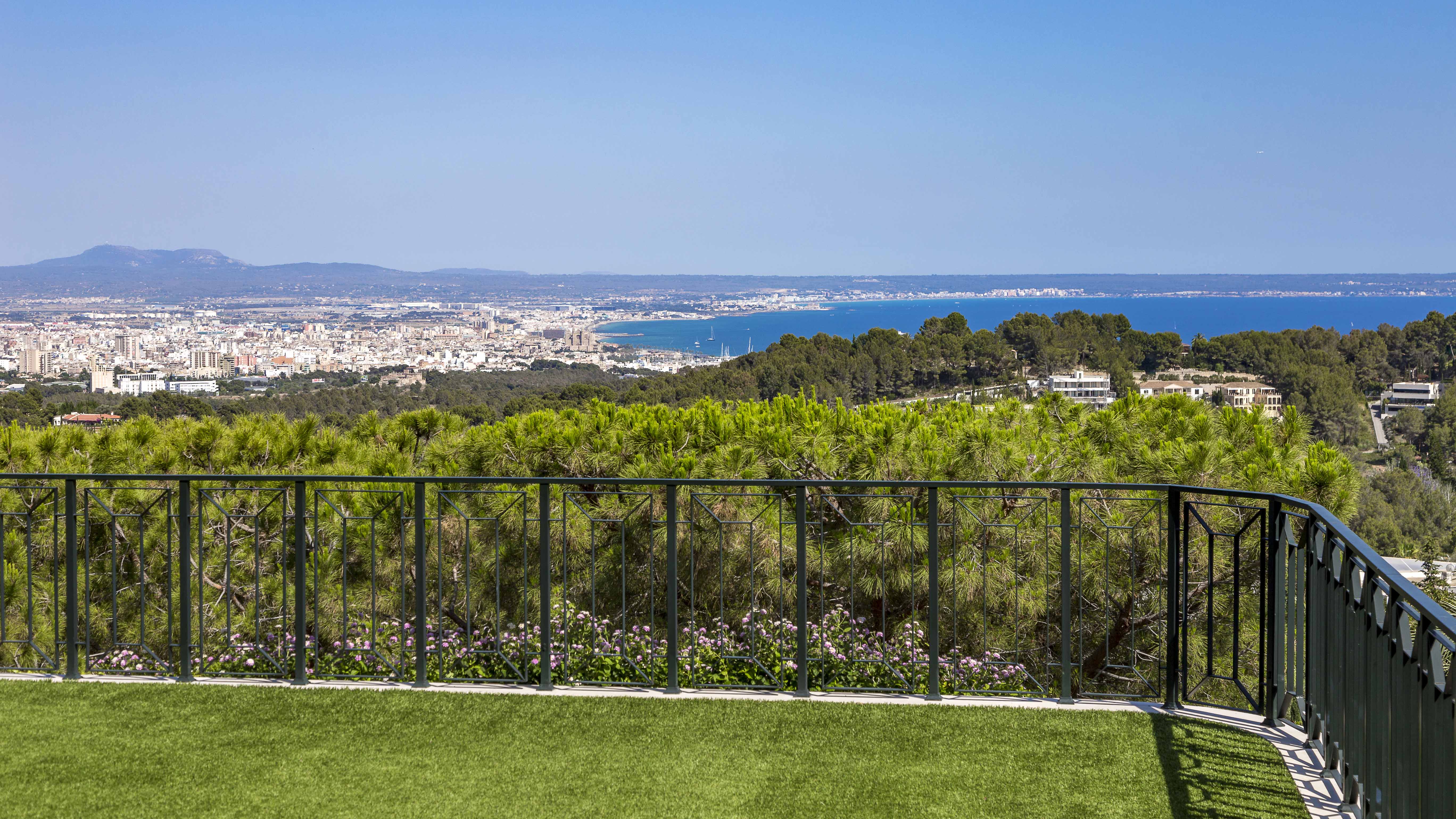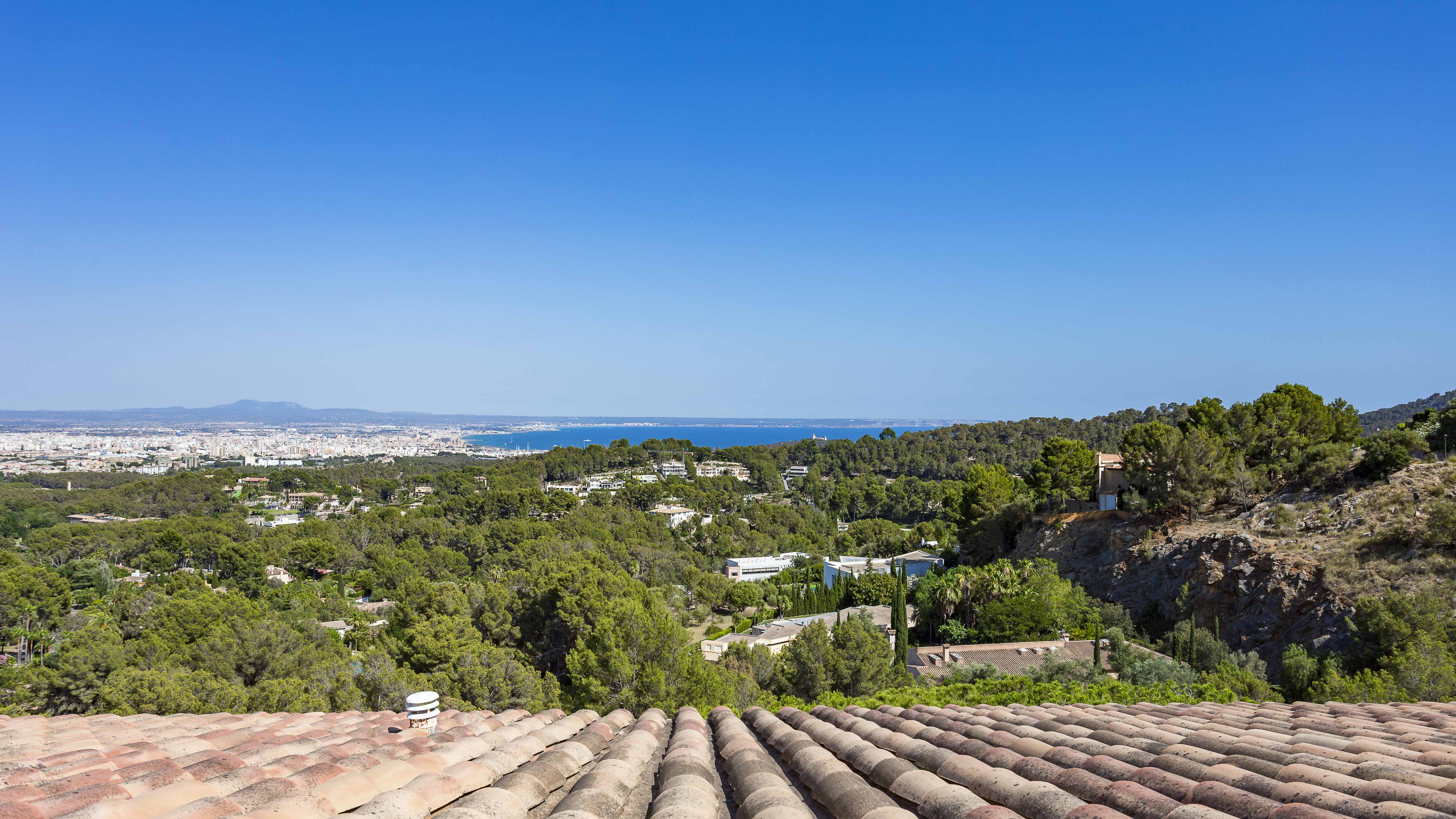 The villa presents itself in its best condition, has a beautiful driveway with Mallorcan stone walls and a lush diversity of plants, various large open and covered terraces and a magnificent panoramic view over the bay of Palma and the cathedral.