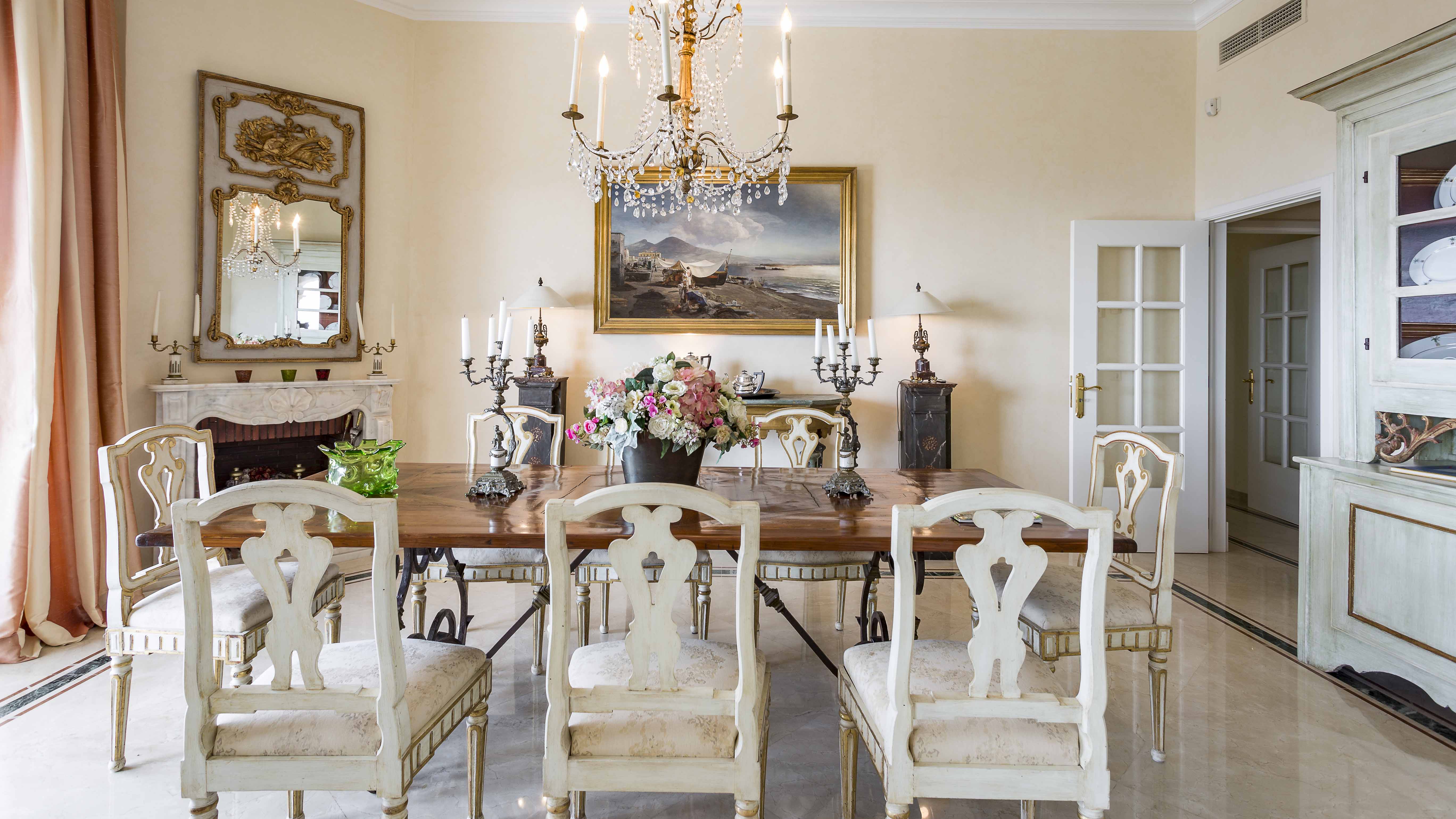 Ground floor: bright entrance hall with open marble staircase and fascinating sea views, spacious living room with fireplace, large windows and high ceilings, separate dining room with fireplace, fully equipped kitchen with breakfast table, home office with fireplace, 1 large bedroom with bathroom en-suite, dressing room and private terrace, very spacious covered terrace area.