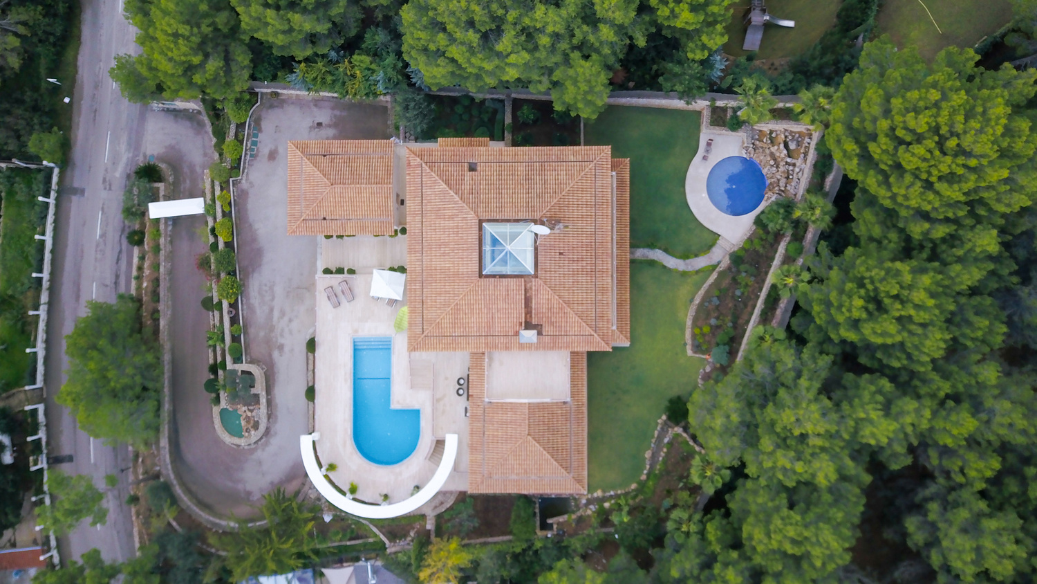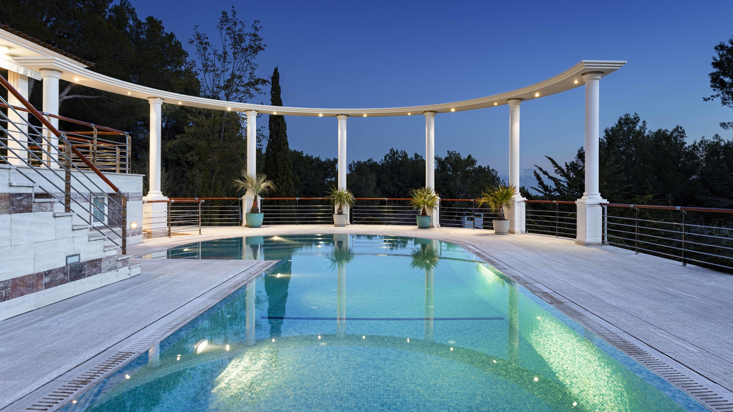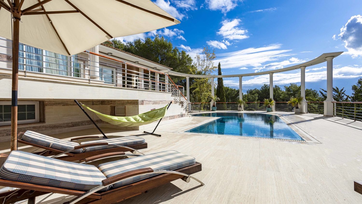 Flat garden area with pretty Mediterranean plants, fishpond, large swimming pool with large Roman Columns around the pool, kids swimming pool with a waterfall. Great views over Son Vida and partial view over the bay of Palma.