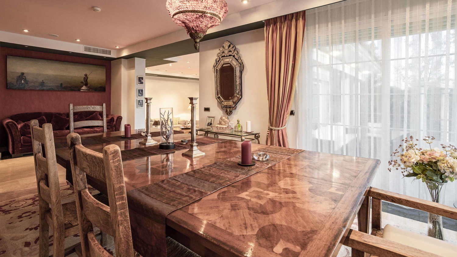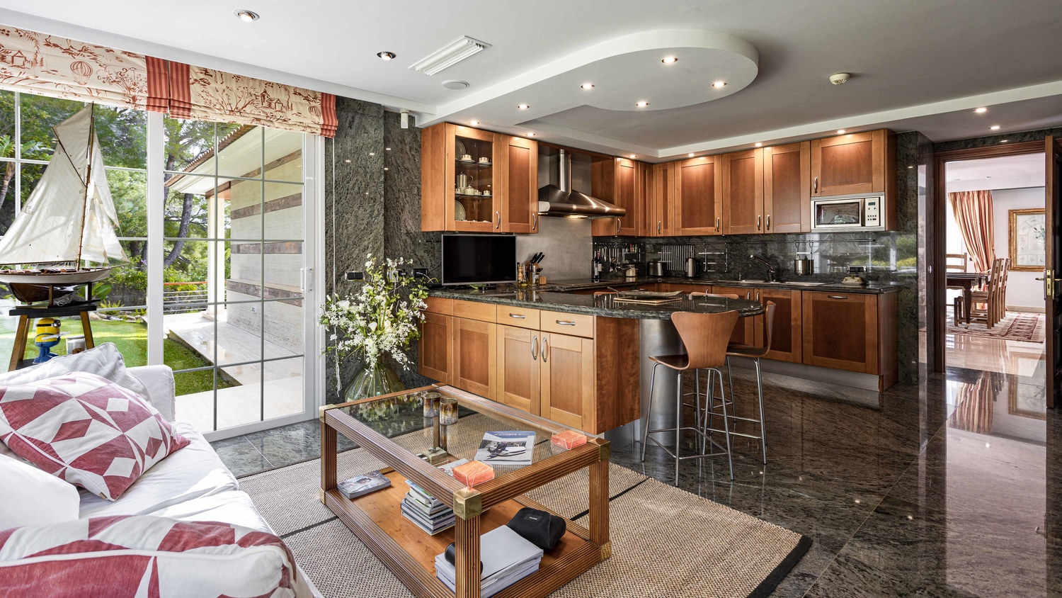 Ground floor: Imposing entrance hall, living/dining room, fully equipped kitchen with dining area and view to the garden and to the kids pool, laundry room, utility room, guest cloaks room and glass lift. Bedroom with en-suite bathroom.
