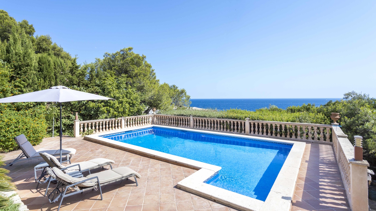 The garden below the pool and the side gardens, give this Mediterranean villa almost total privacy and beautiful contrast of the green with the blue of the sea.
