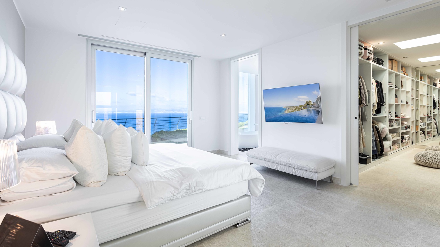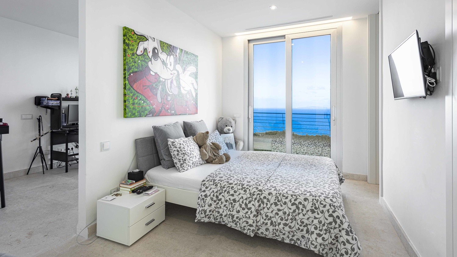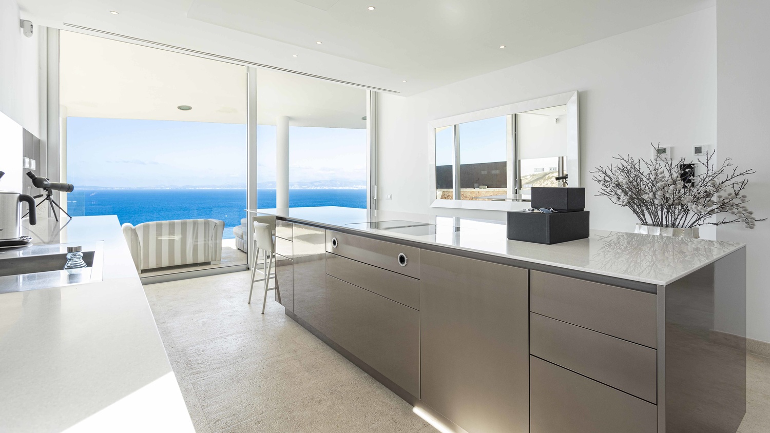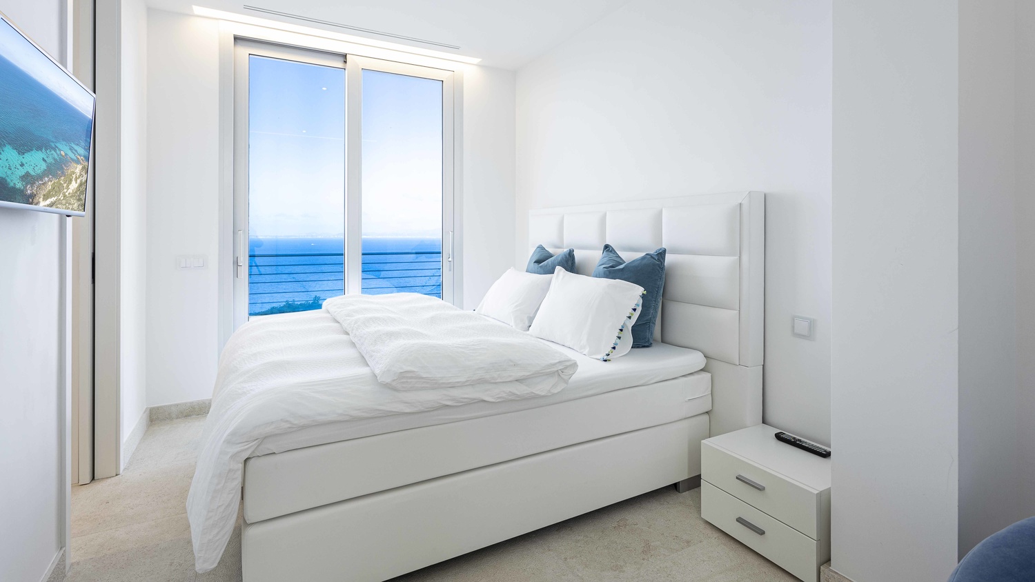 Entrance hall, open loft-style living-dining area with guest toilet and powder room, designer kitchen, food storage room with American fridge as well as 3 guest bedrooms with en-suite bathrooms. Extra large master suite with en-suite bathroom including waterfall shower and bathtub as well as spacious walk-in closet. Every room offers breath-taking sea views and access to the outside terraces with floor to ceiling panorama windows.