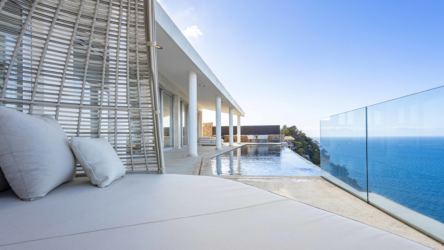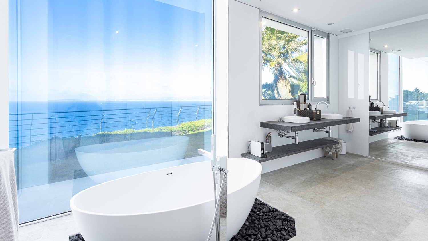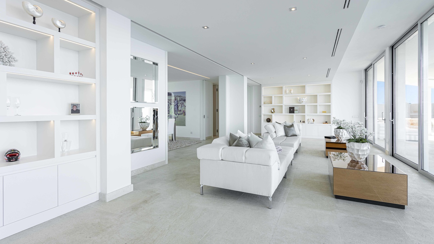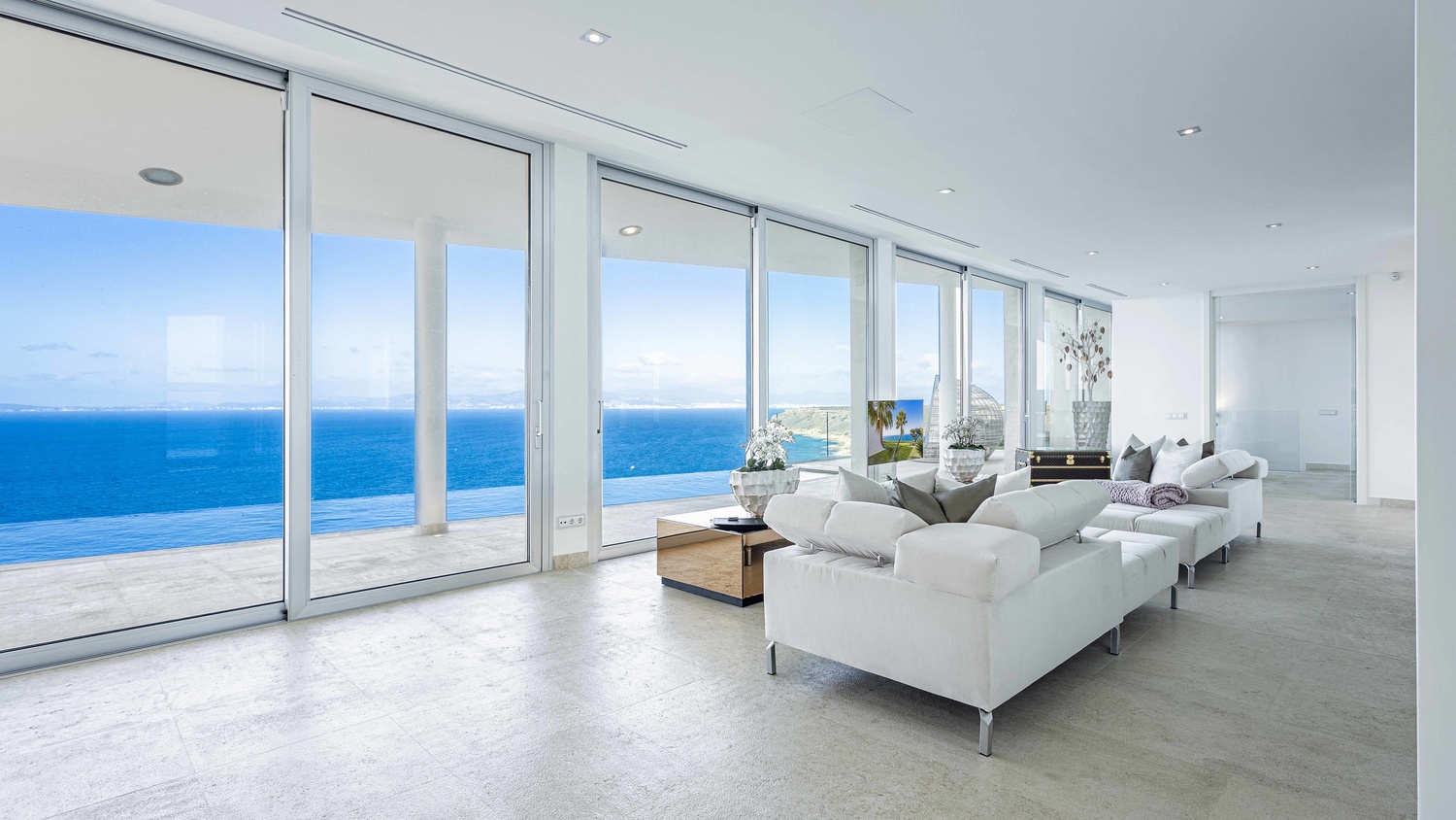 Entrance hall, open loft-style living-dining area with guest toilet and powder room, designer kitchen, food storage room with American fridge as well as 3 guest bedrooms with en-suite bathrooms. Extra large master suite with en-suite bathroom including waterfall shower and bathtub as well as spacious walk-in closet. Every room offers breath-taking sea views and access to the outside terraces with floor to ceiling panorama windows.