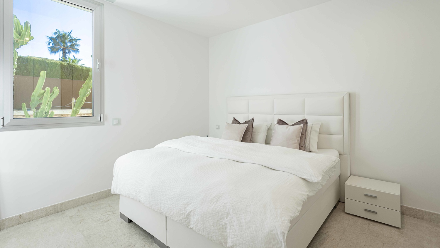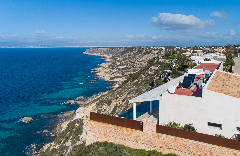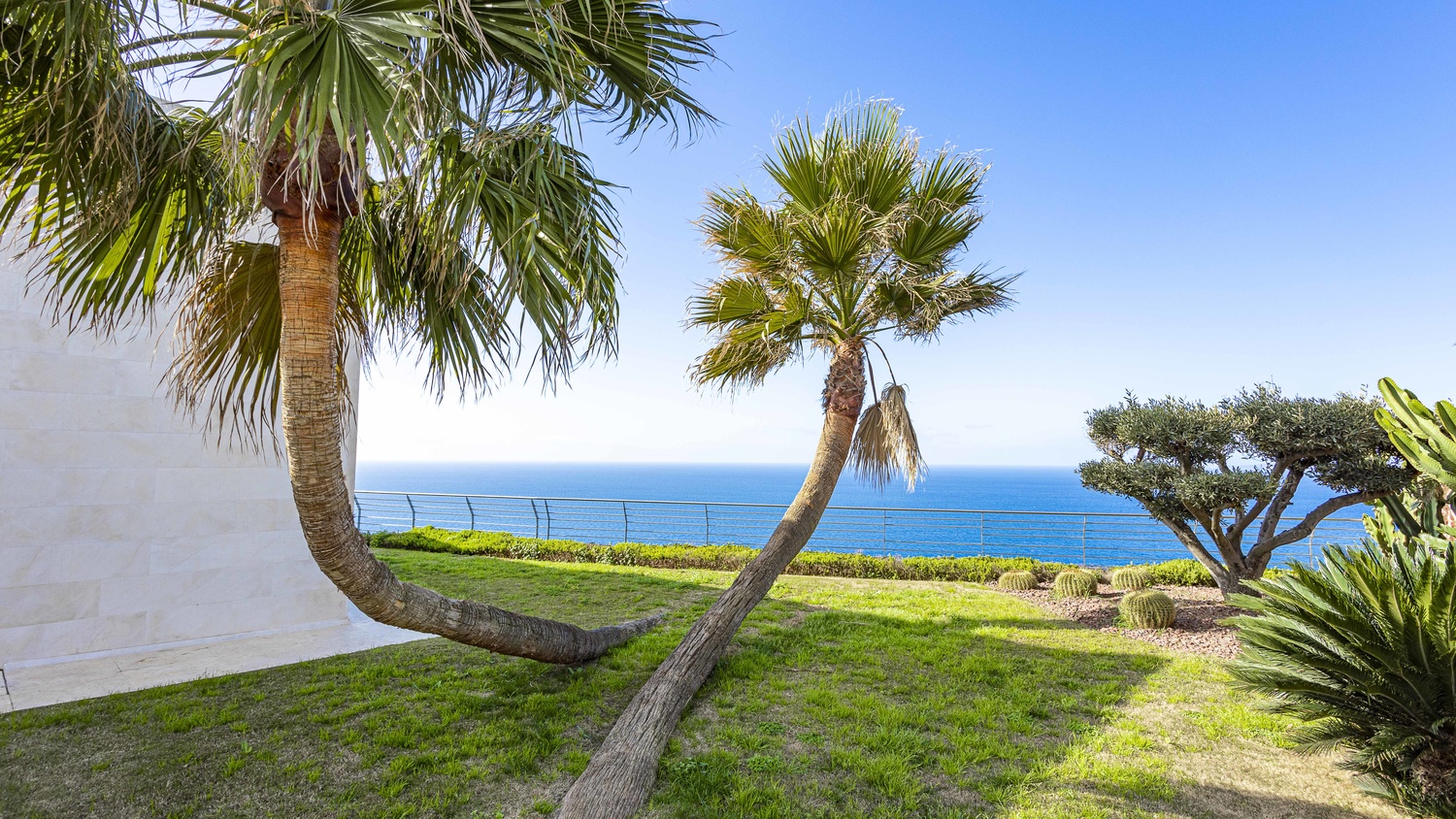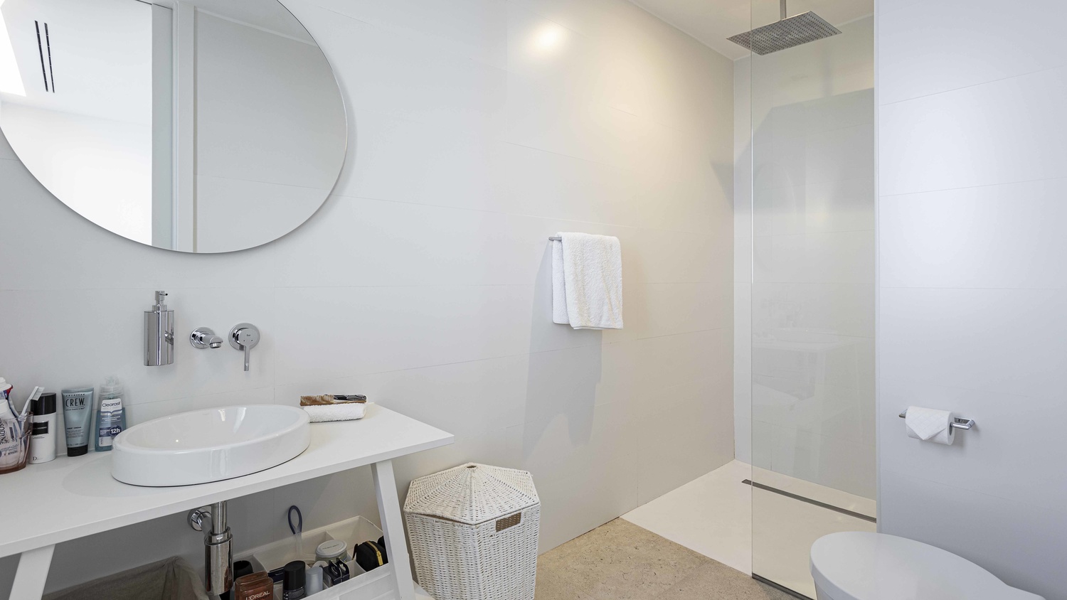 Entrance hall, open loft-style living-dining area with guest toilet and powder room, designer kitchen, food storage room with American fridge as well as 3 guest bedrooms with en-suite bathrooms. Extra large master suite with en-suite bathroom including waterfall shower and bathtub as well as spacious walk-in closet. Every room offers breath-taking sea views and access to the outside terraces with floor to ceiling panorama windows.