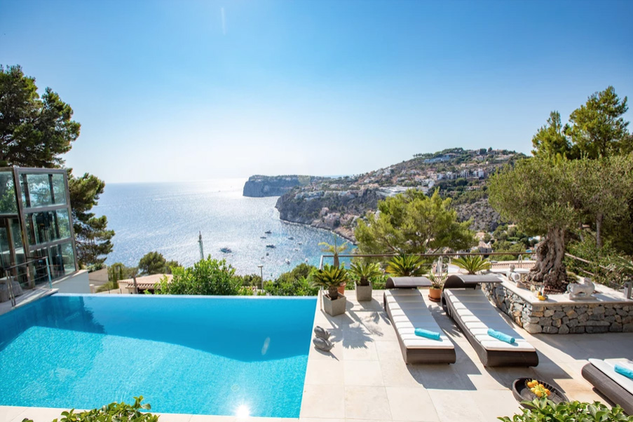 The living area leads to the covered terrace from which you can enjoy a wonderful sea view. A few steps take you from the terrace to the pool and the sundeck.