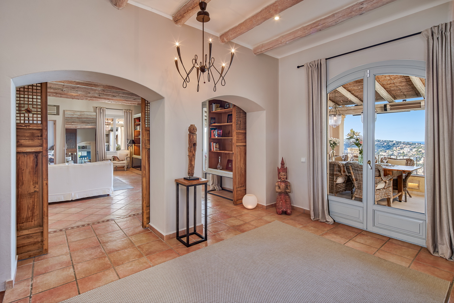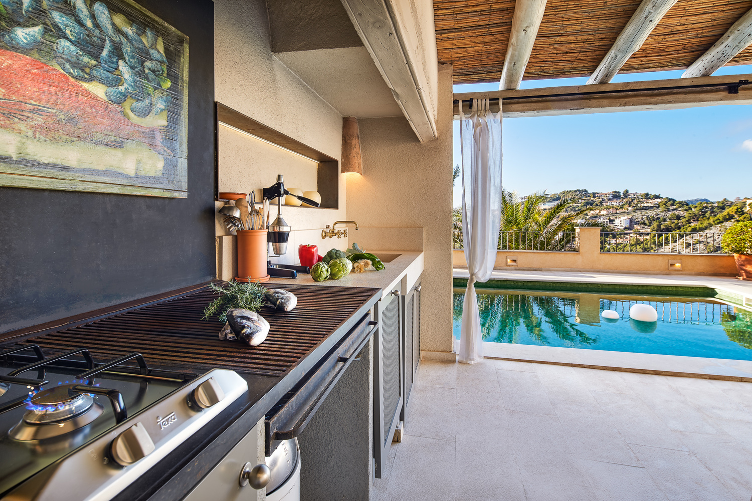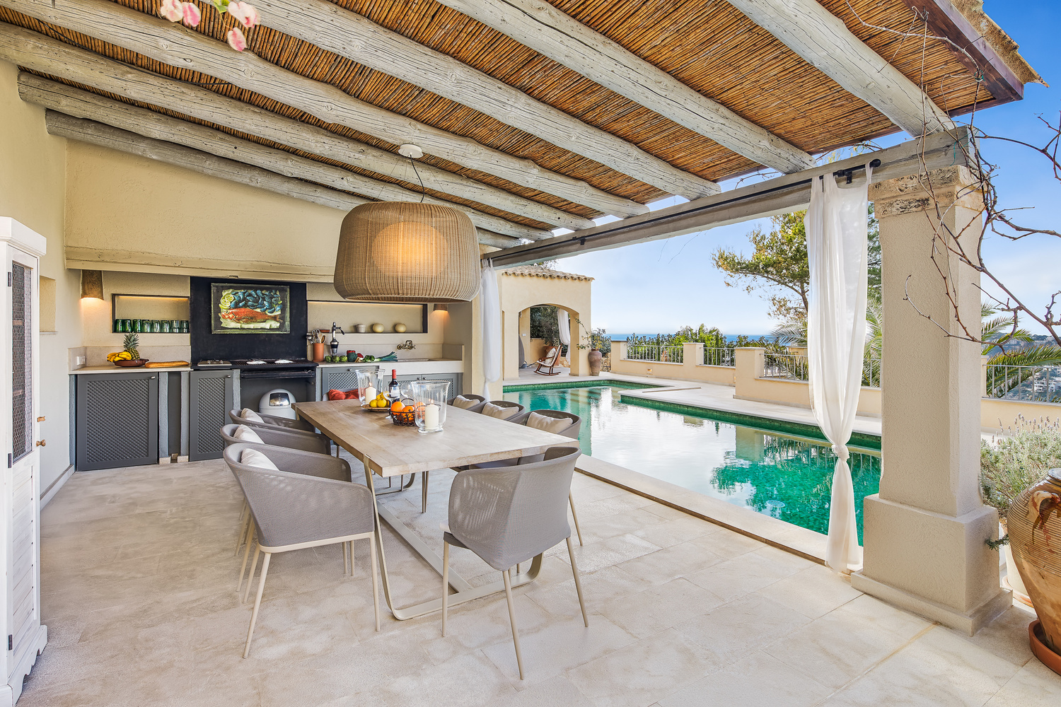 Ground floor: being on a hill with a slope, it seems that the ground floor is already the first floor. From the entrance hall through the hallway you access directly the beautiful and large kitchen equipped with Miele appliances (oven, extra steam oven, dishwasher, refrigerator combination with ice maker etc.). The kitchen has an integrated dining room, open to the pool terrace where there is also a summer dining area underneath a porch. Furthermore, on this floor there are the guest WCs, a large dining room with fireplace as well as the master bedroom with two large dressing rooms and a large en-suite bathroom. From the master bedroom, with the same direct access as from the living area and kitchen, you can access the master terrace with different porch solarium- and chill out areas. All of them offer great privacy and wonderful sea views.