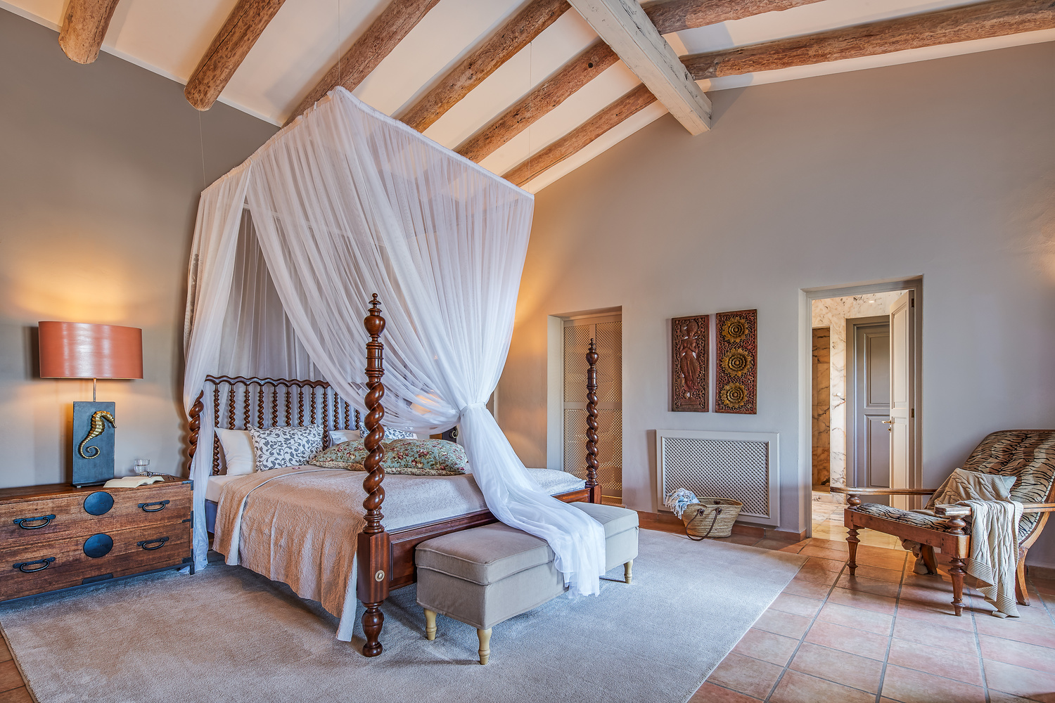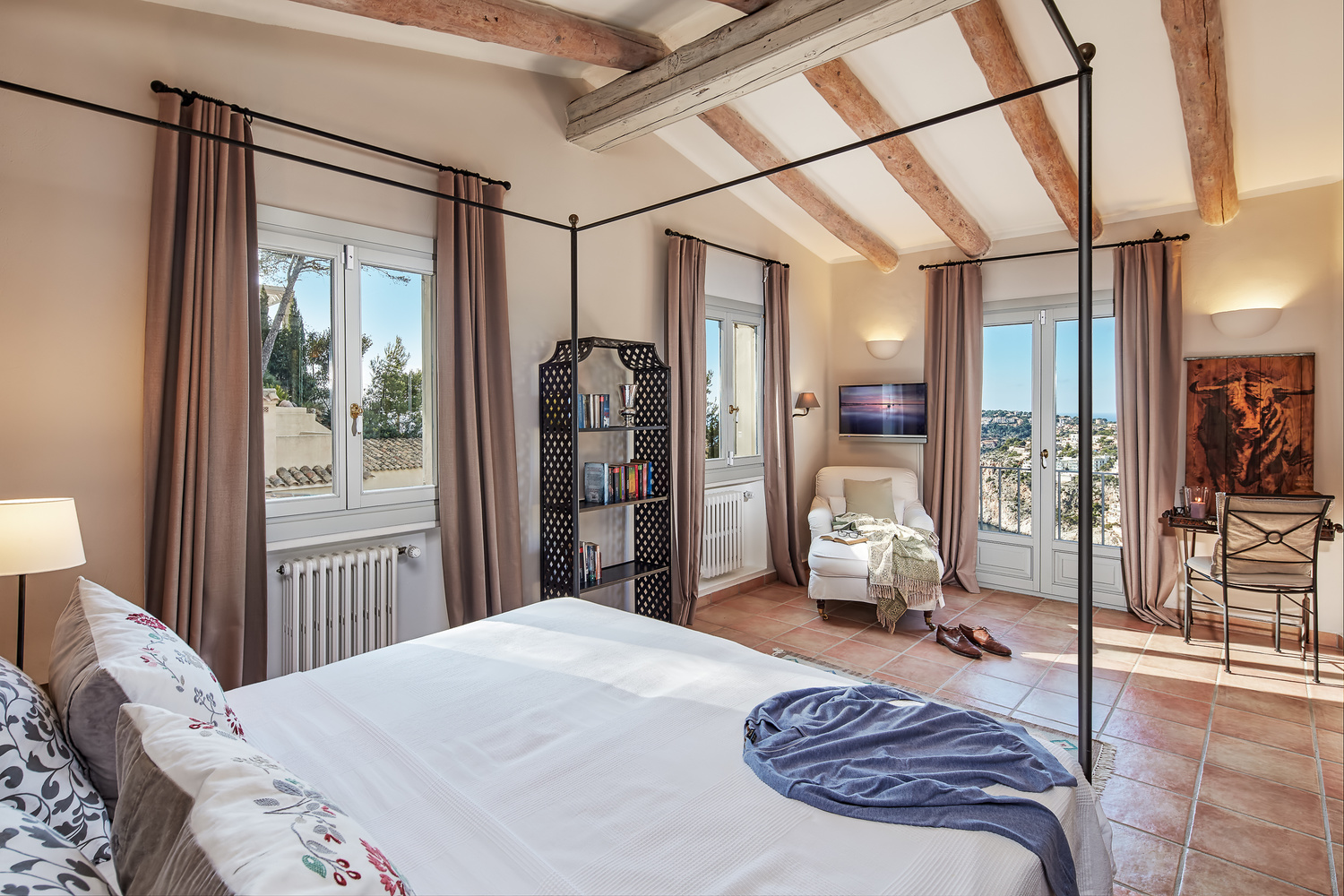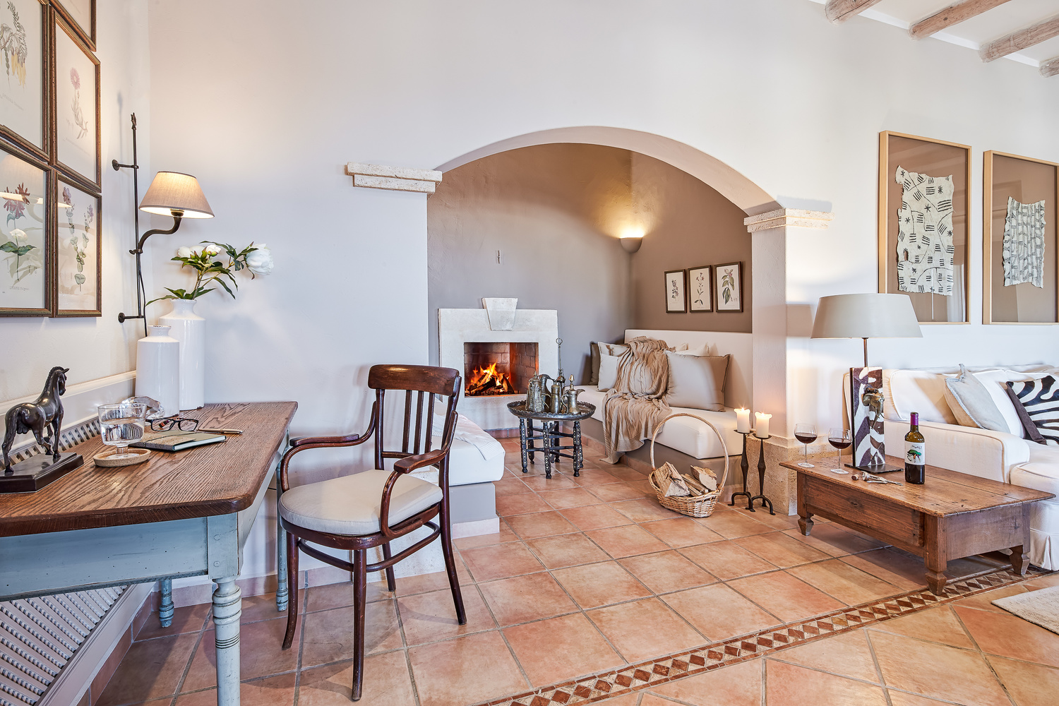 Ground floor: being on a hill with a slope, it seems that the ground floor is already the first floor. From the entrance hall through the hallway you access directly the beautiful and large kitchen equipped with Miele appliances (oven, extra steam oven, dishwasher, refrigerator combination with ice maker etc.). The kitchen has an integrated dining room, open to the pool terrace where there is also a summer dining area underneath a porch. Furthermore, on this floor there are the guest WCs, a large dining room with fireplace as well as the master bedroom with two large dressing rooms and a large en-suite bathroom. From the master bedroom, with the same direct access as from the living area and kitchen, you can access the master terrace with different porch solarium- and chill out areas. All of them offer great privacy and wonderful sea views.