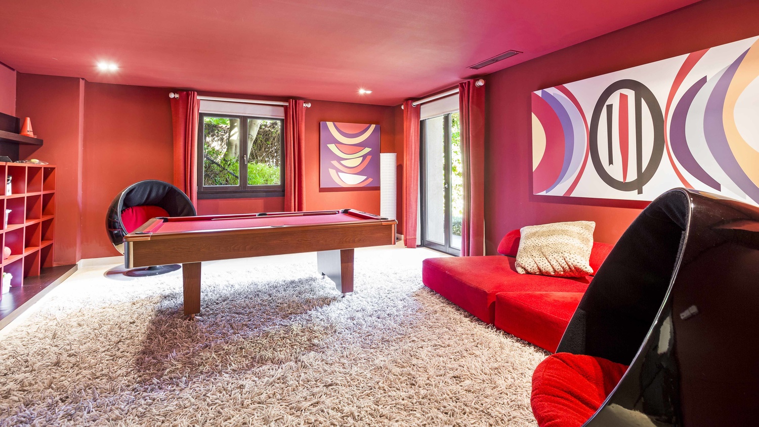 Main living area: spacious living room with fireplace and wide, continuous window front, TV room, dining room, library, modern fully equipped kitchen, various utility rooms, 1 large room with bathroom (currently used as billiard room) and guest bathroom and the stairway to the luxurious master area.