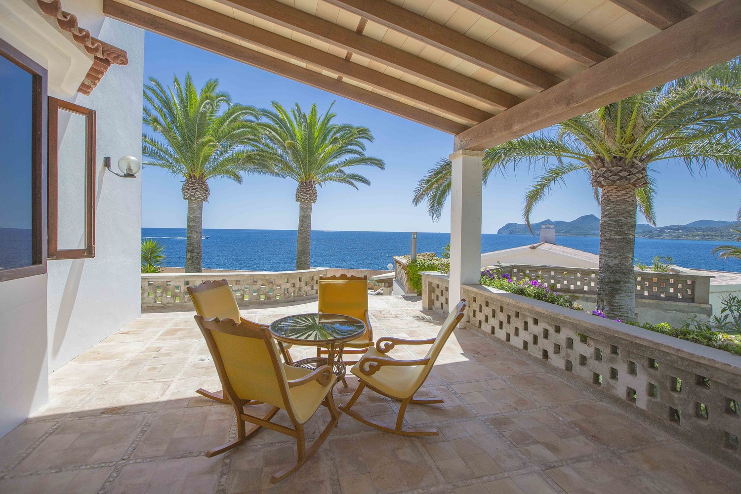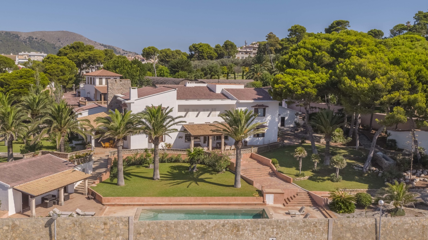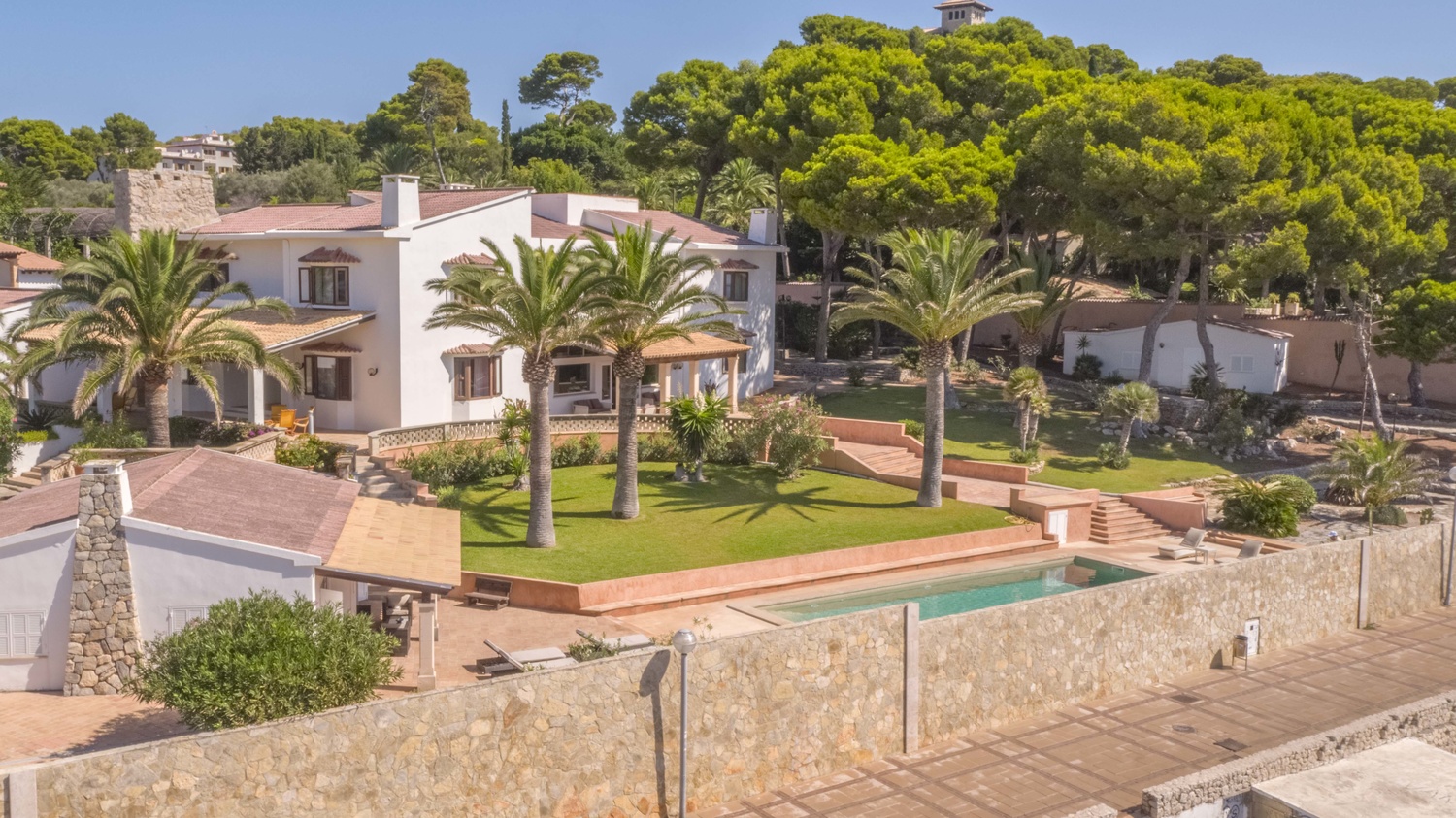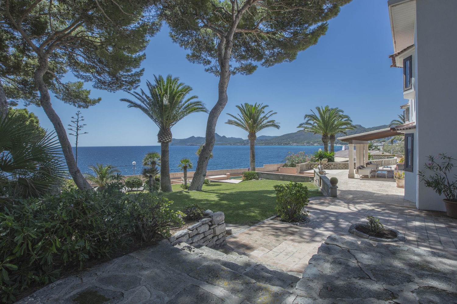 The villa has several very large south facing terraces, fantastic pool, manicured gardens with palm trees and pines. It has a direct access to the sea.