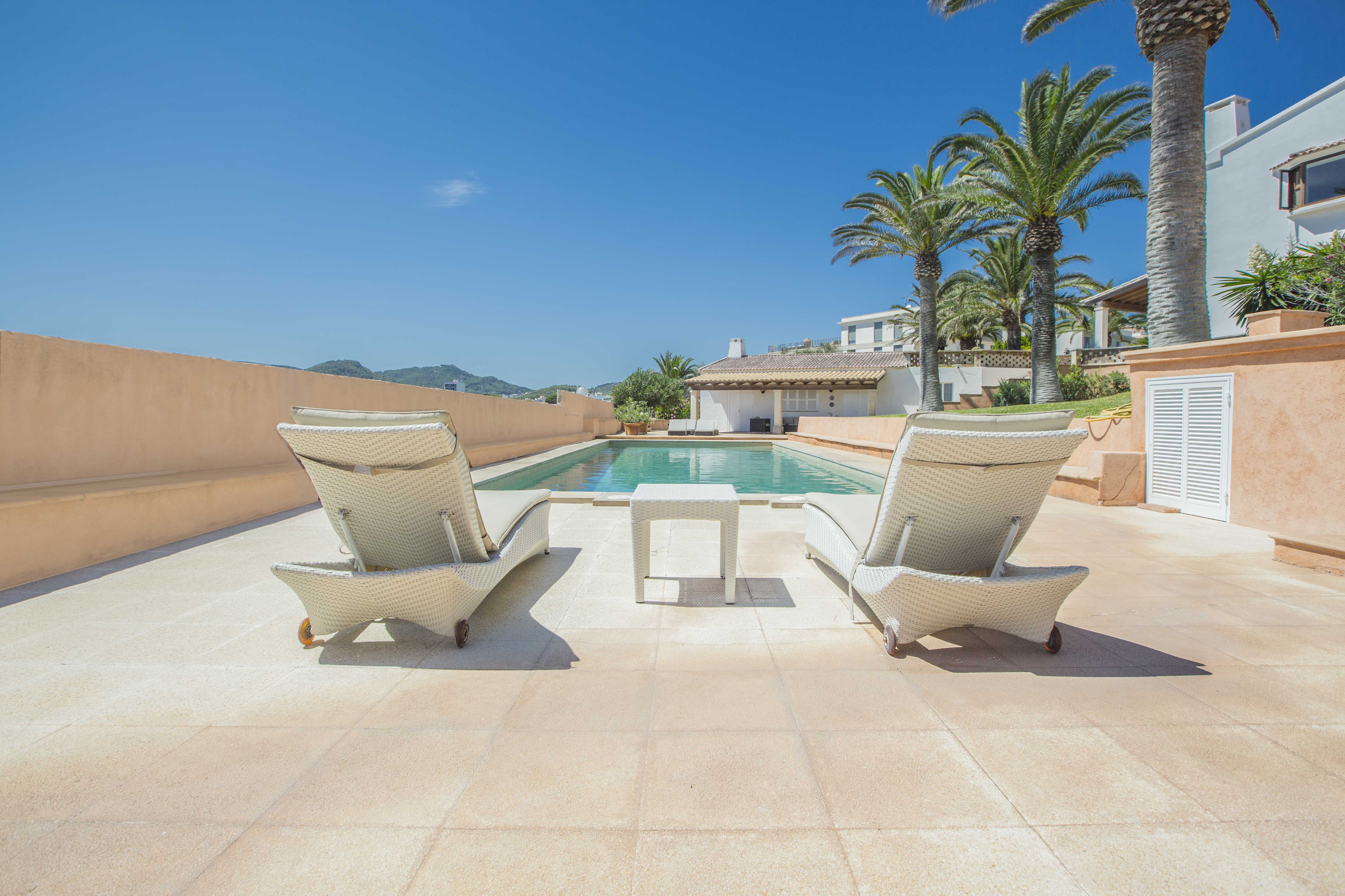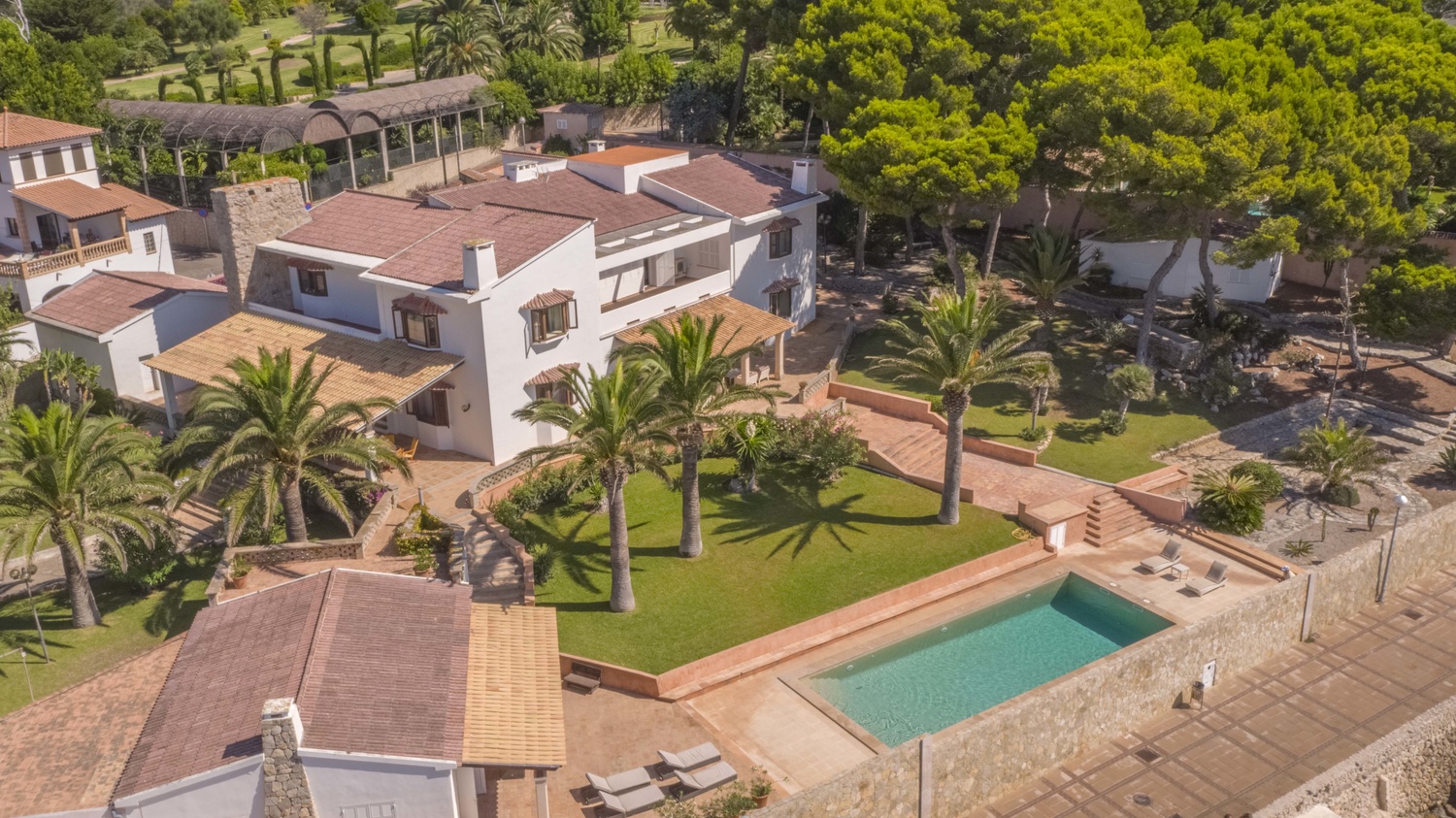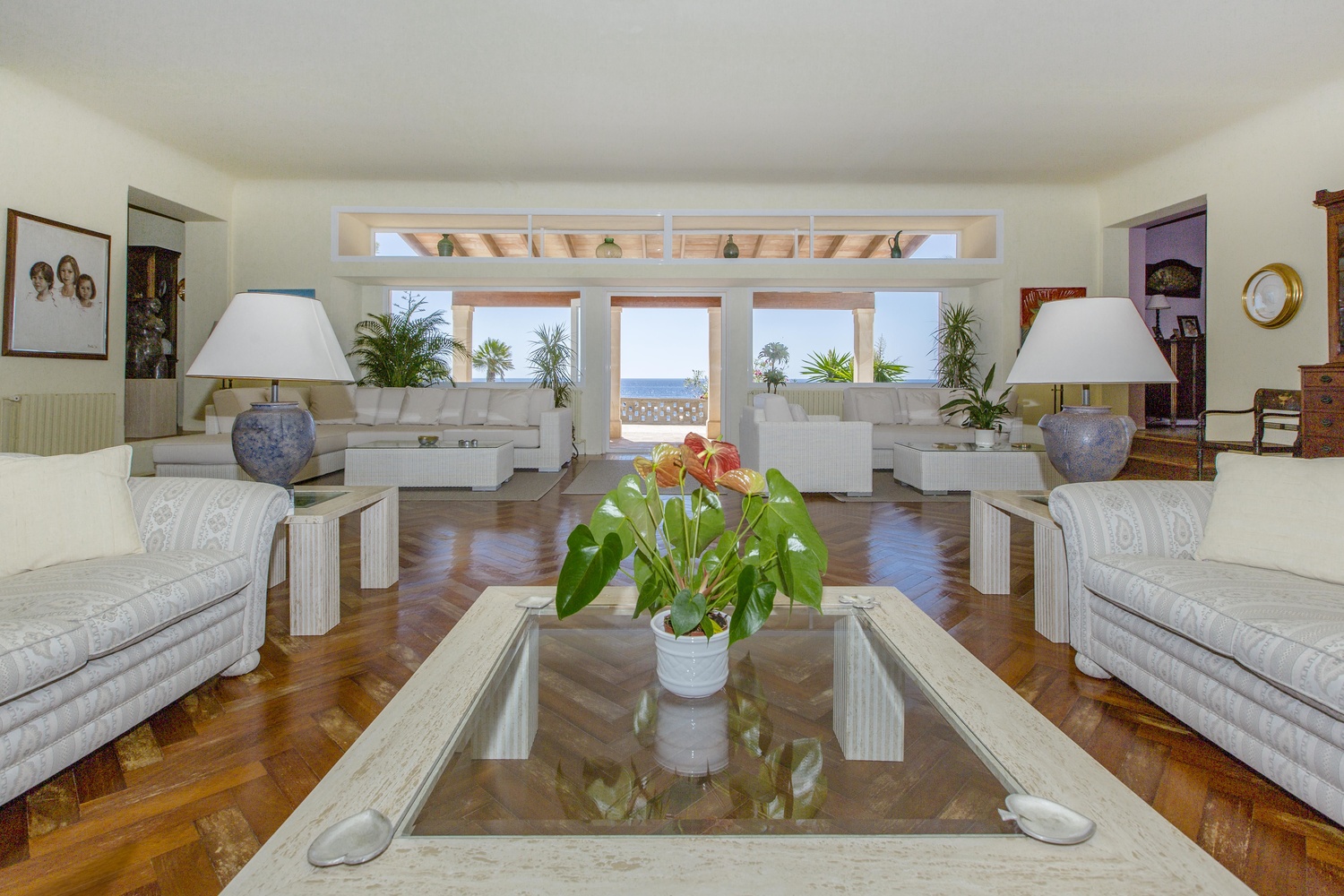 The villa has several very large south facing terraces, fantastic pool, manicured gardens with palm trees and pines. It has a direct access to the sea.