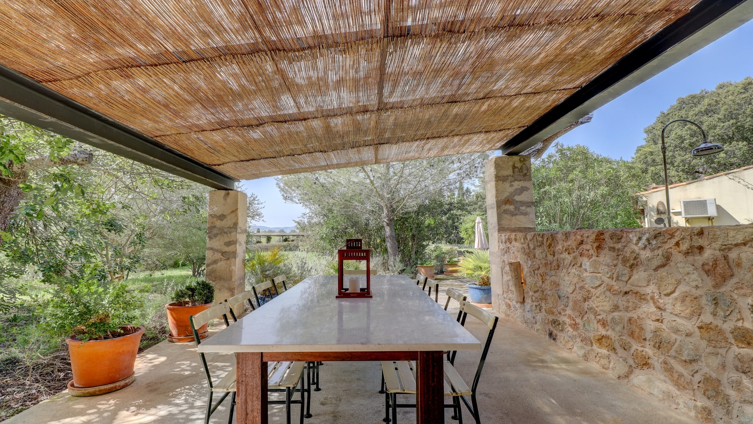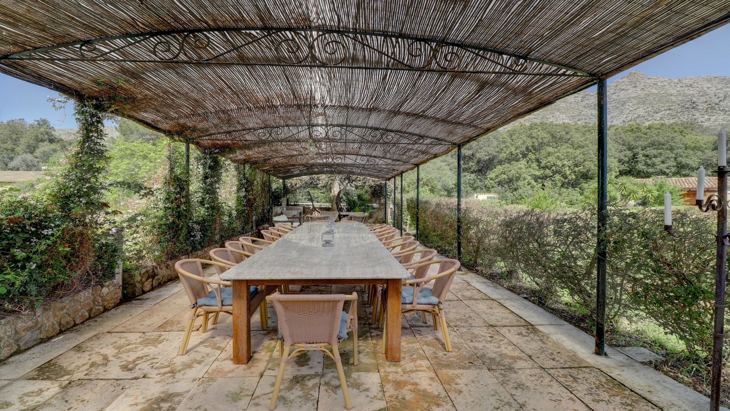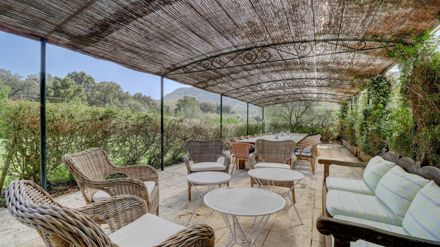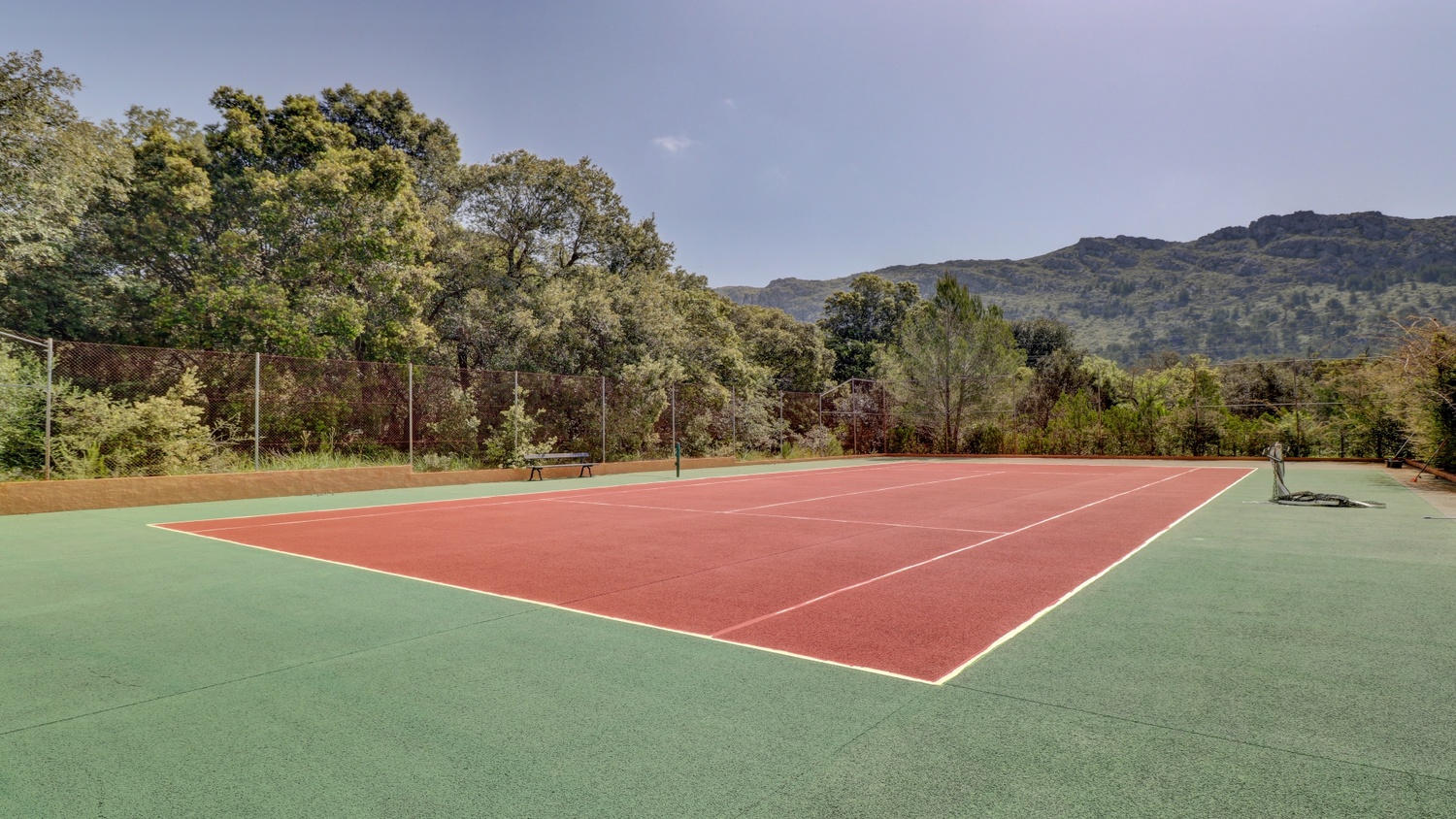 The exterior has beautiful terraces located on both sides of the property, with plenty of shade, perfect for hot summer days, BBQ area for outdoor cooking, and a dining room next door. Exceptional garden, with a 10 x 6 pool and a tennis court.