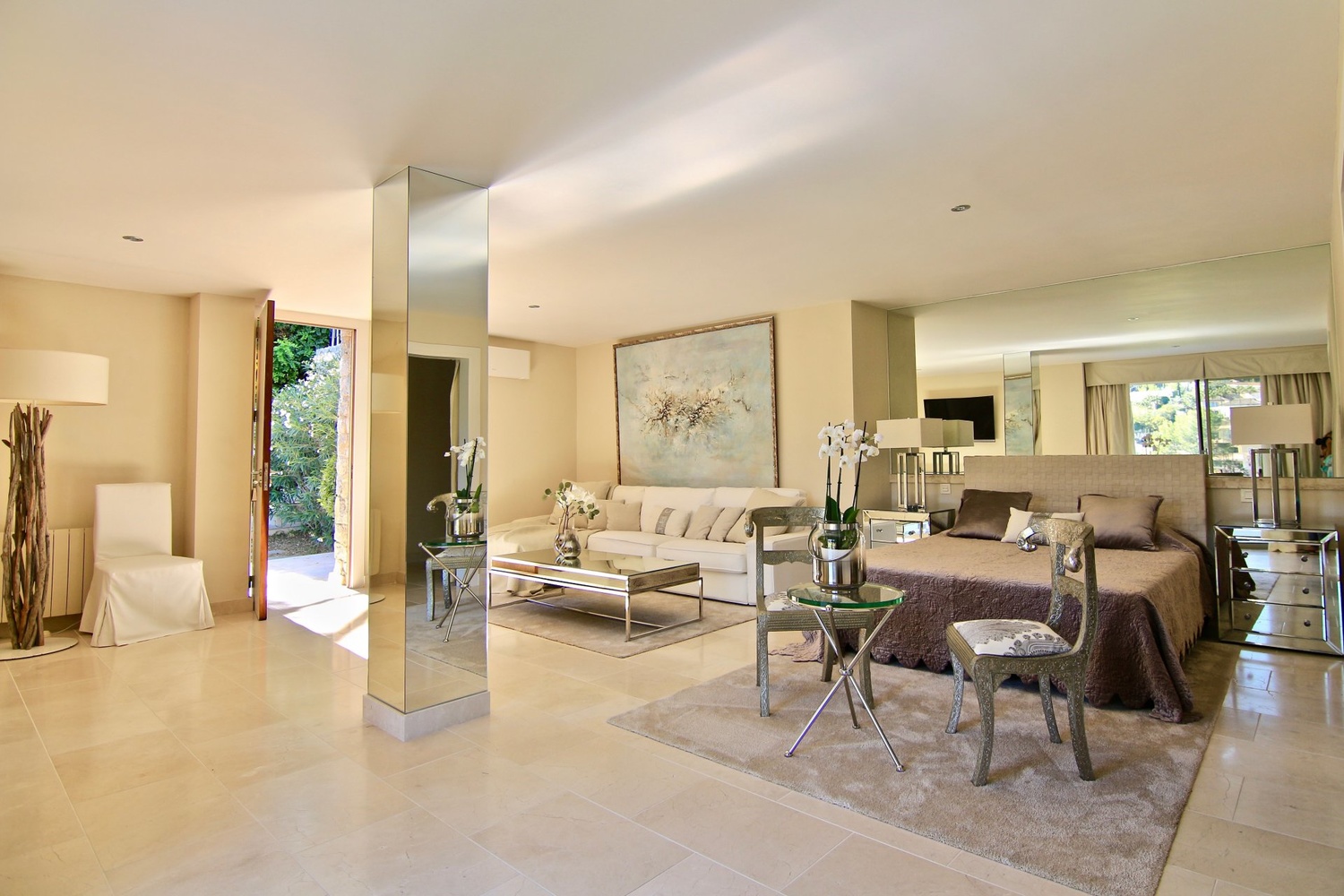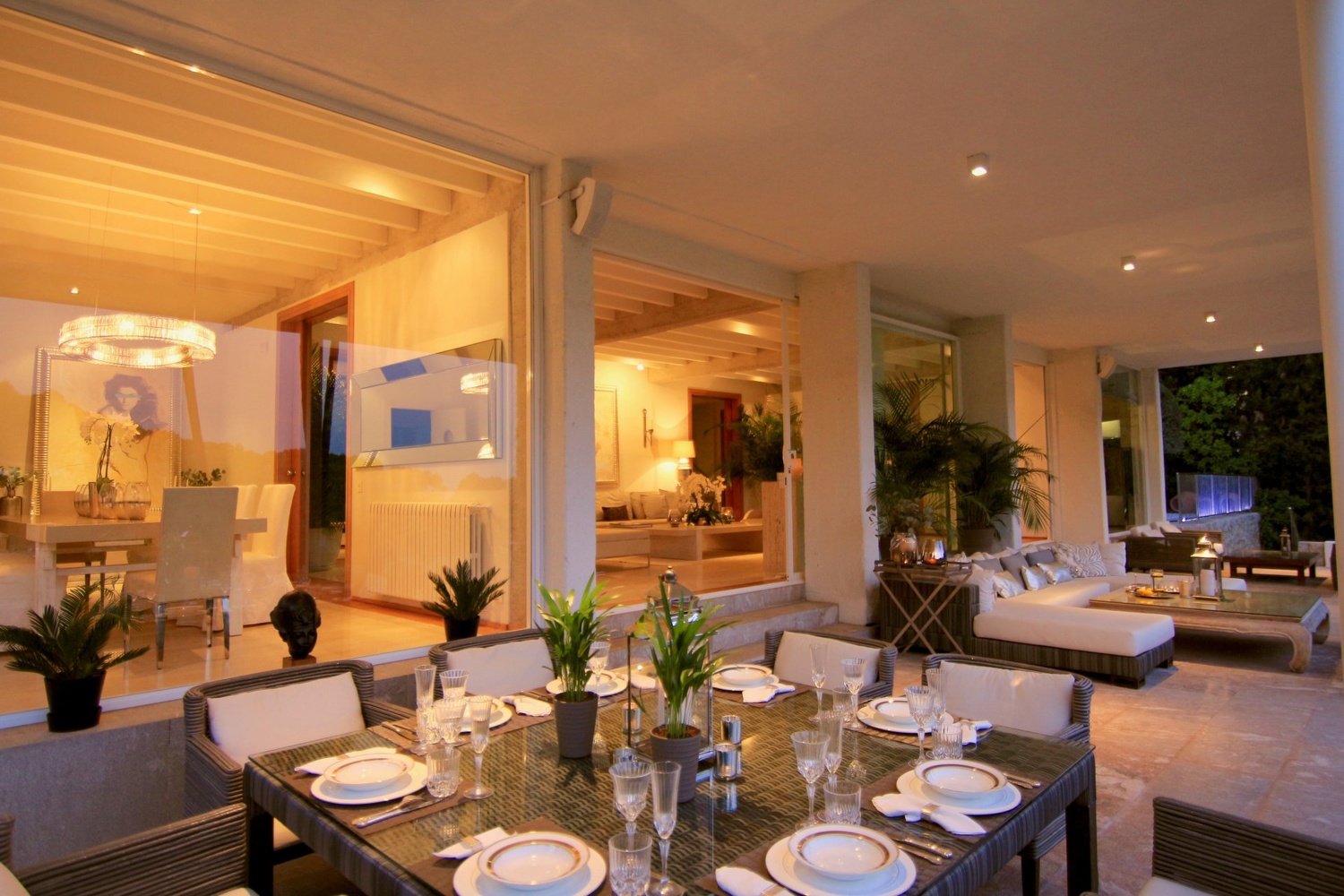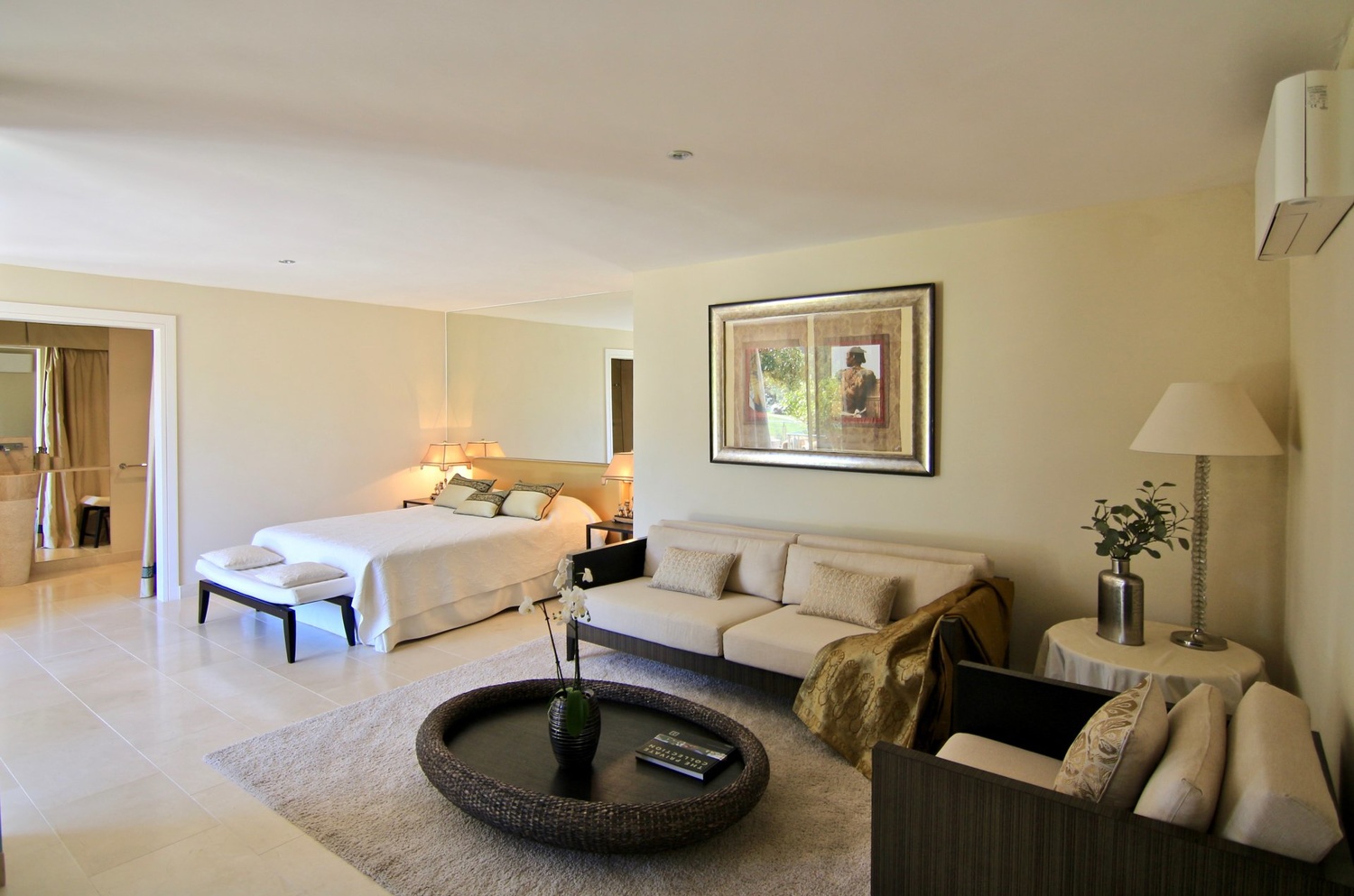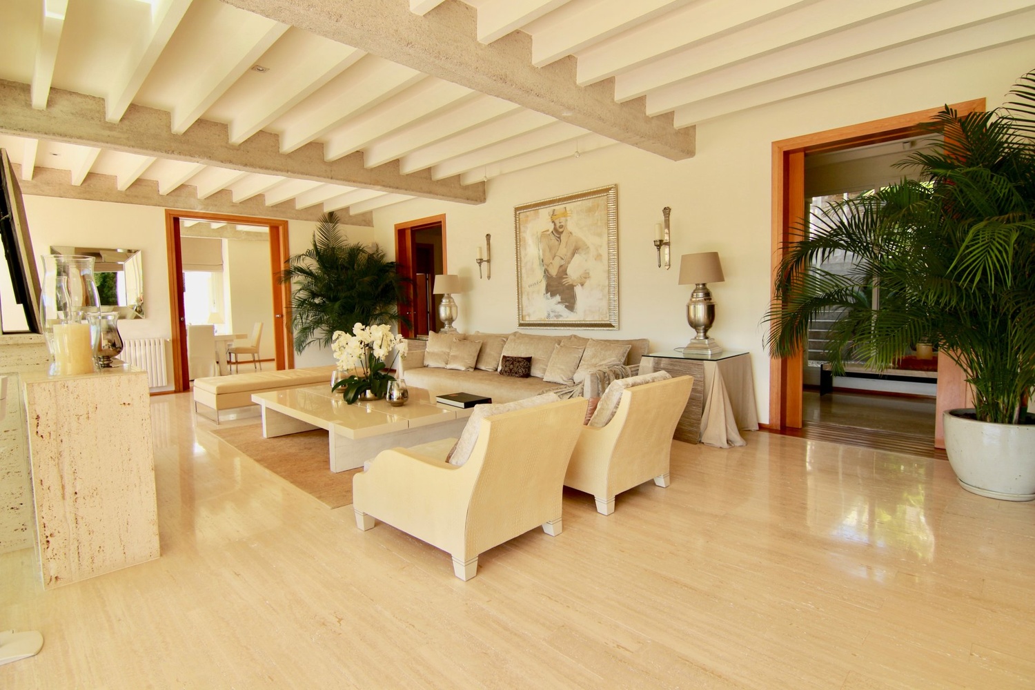 Mature garden with huge palm trees, ample salt swimming pool with adjoining pool bar, summer kitchen with barbecue area, private squash hall and fitness room.